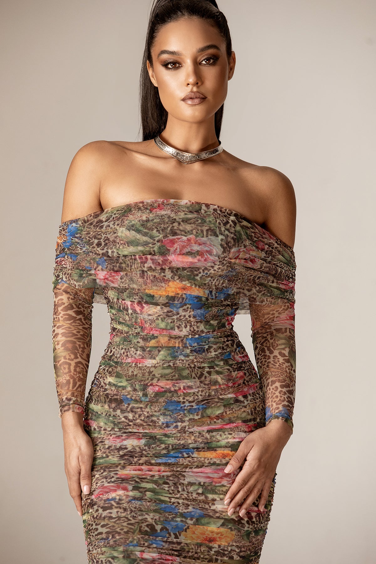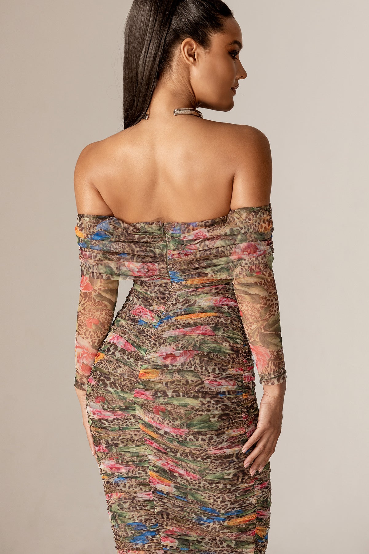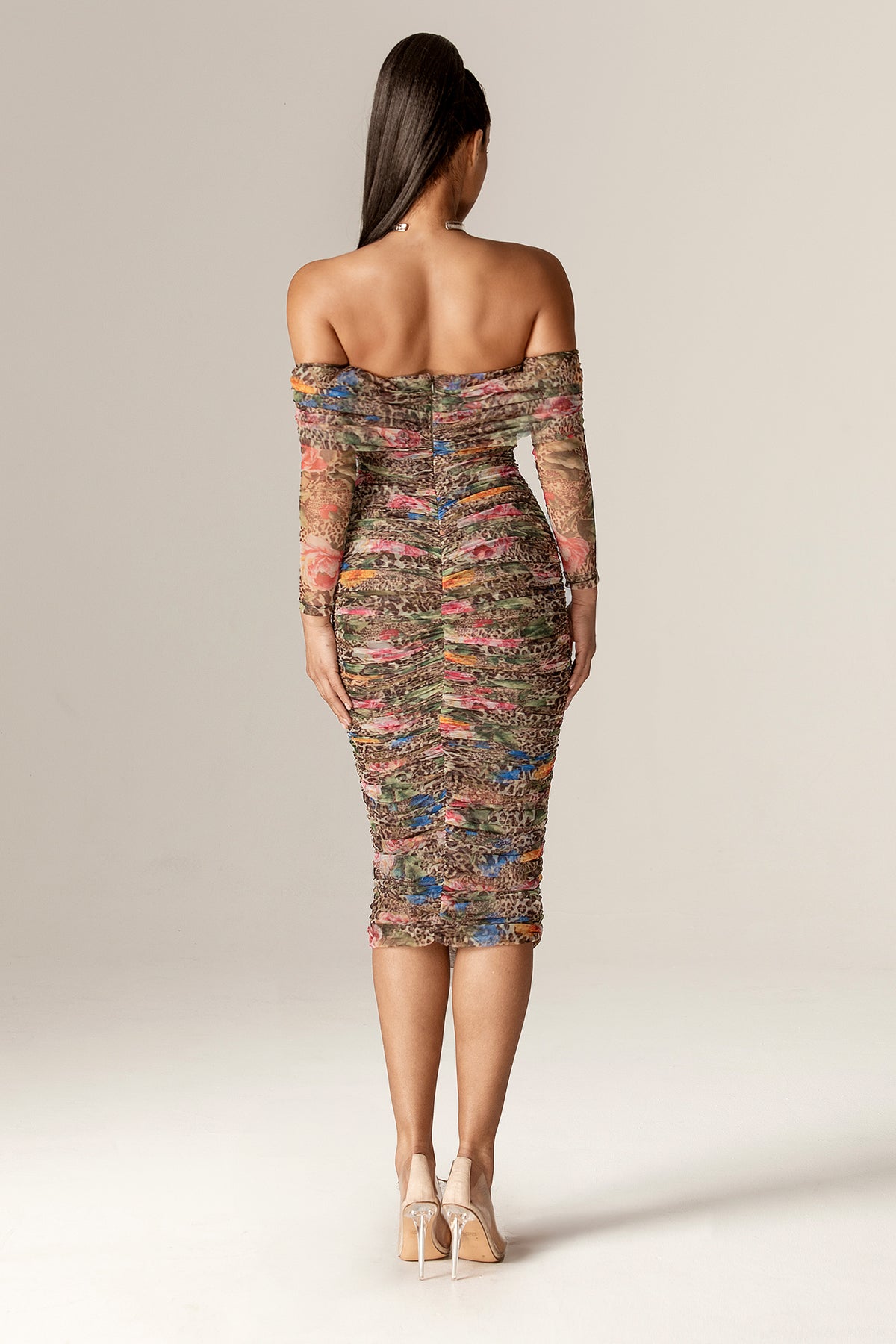 Hayley Off-Shoulder Mesh Midi Dress (Leopard’s Peony)