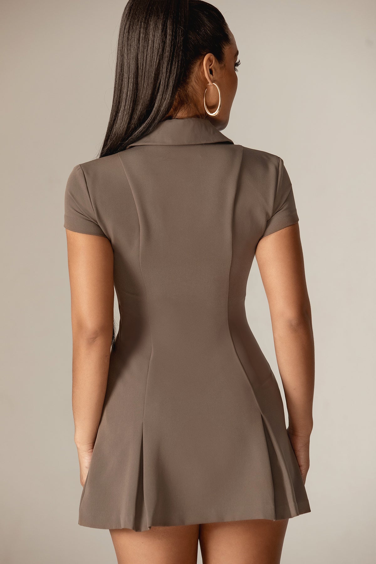 The 'Nykia' dress is a stunning, form-fitting piece that beautifully accentuates your figure. This stretch-fabric mini dress hugs the body in all the right places, offering both comfort and shape. Designed with a pointed collar and a hidden front zip that runs from neck to hem, it allows you to adjust your look from buttoned-up to bold in seconds. Short sleeves, sculpted seams, and hip-level welt pockets add functional edge, while the lightly flared skirt with subtle pleats brings movement and modern charm. A minimalist piece with a quiet power, perfect for your next statement moment.