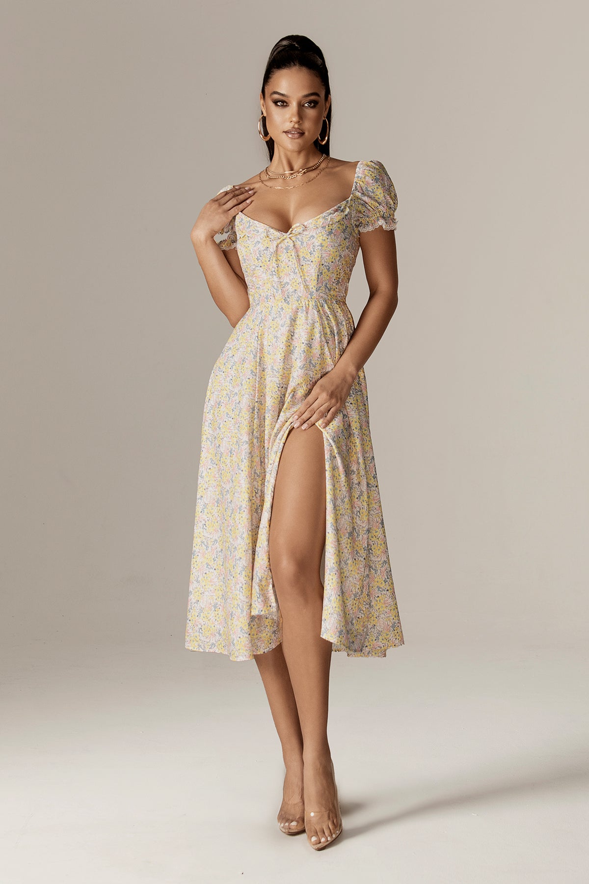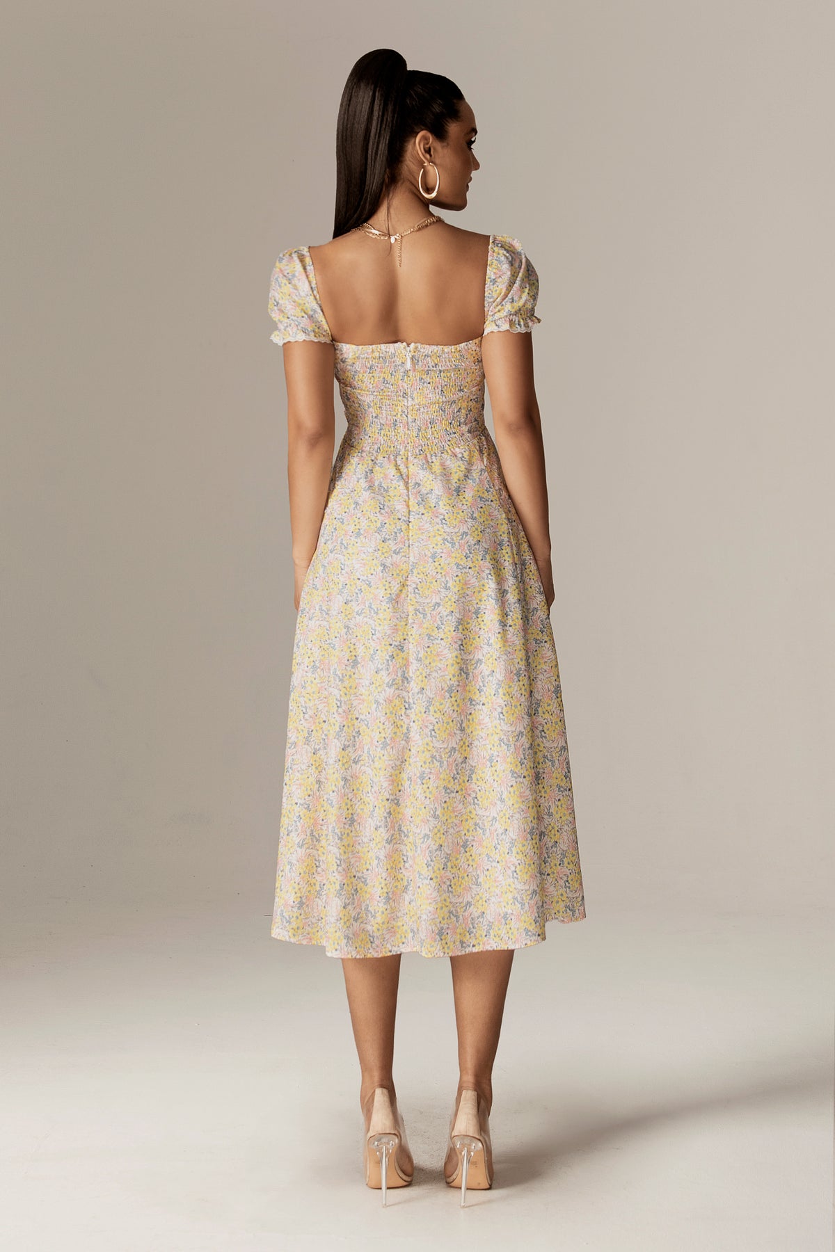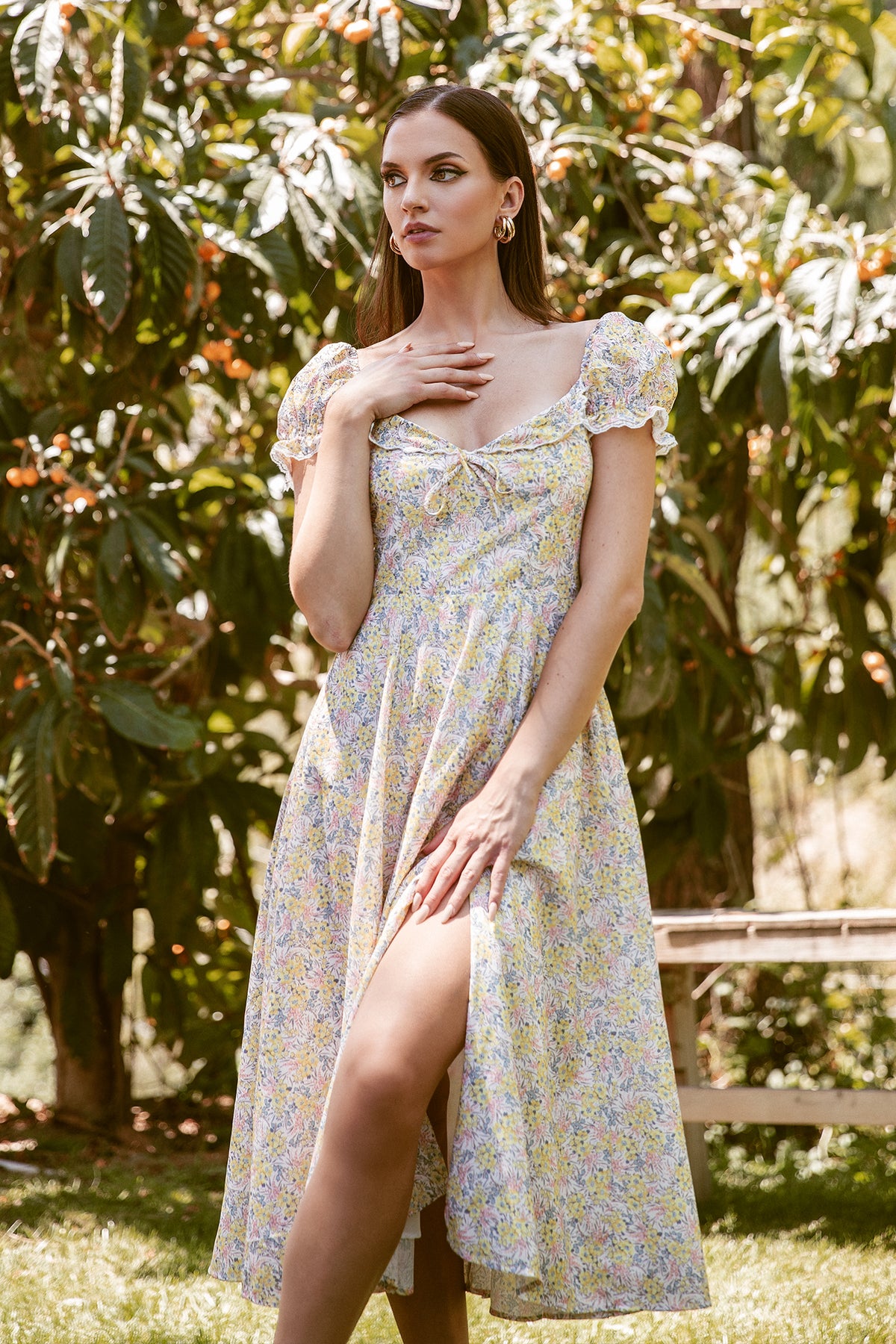 Every detail of Kentra is designed to make you feel effortlessly beautiful, The Kentra Dress is where vintage charm meets modern femininity. Designed in a soft floral fabric that flows effortlessly, this silhouette captures timeless elegance with an alluring twist.The sweetheart neckline is delicately framed with lace trim and a dainty bow tie, allowing for an adjustable bust fit that flatters every shape. Puff sleeves with soft gathers and lace accents add a touch of graceful nostalgia, while the smocked back hugs the body with ease and comfort. A romantic front side slit reveals just enough to enchant, giving the midi-length skirt a fluid, feminine movement. The hidden side zipper ensures a seamless, flattering fit.