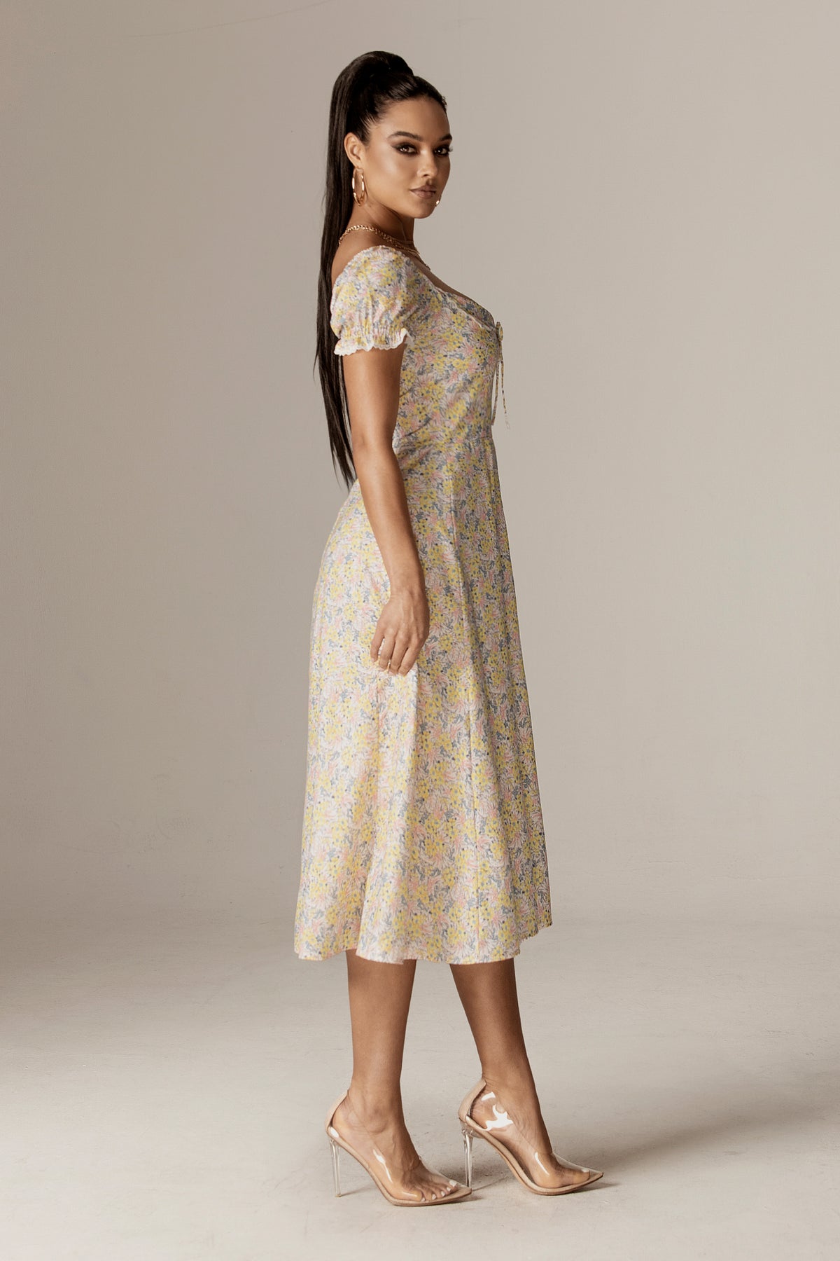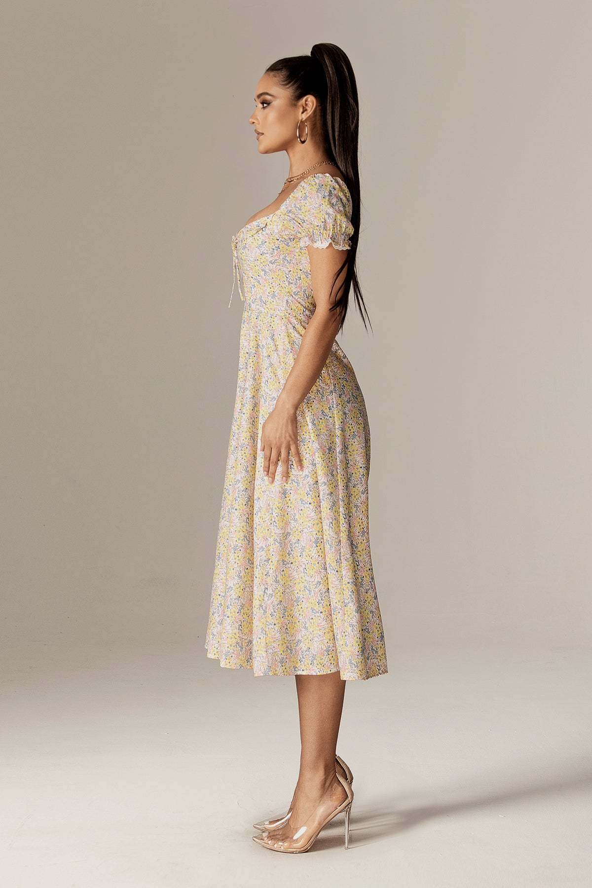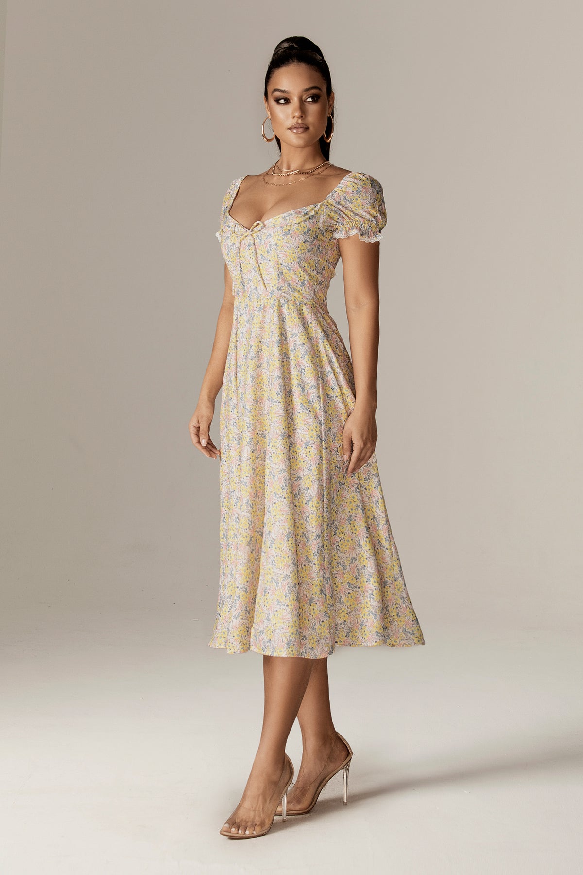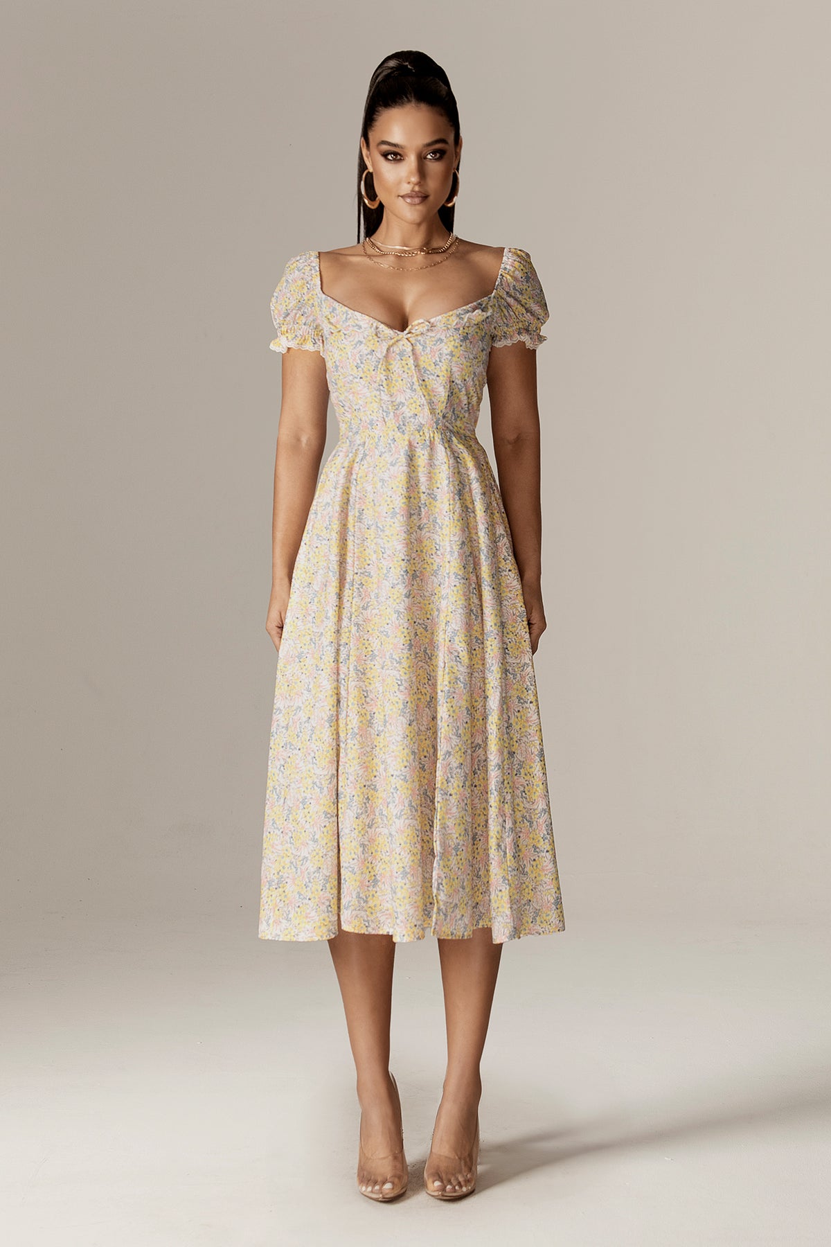 Kentra Sweetheart Puff Sleeves Midi Sundress (English Garden)