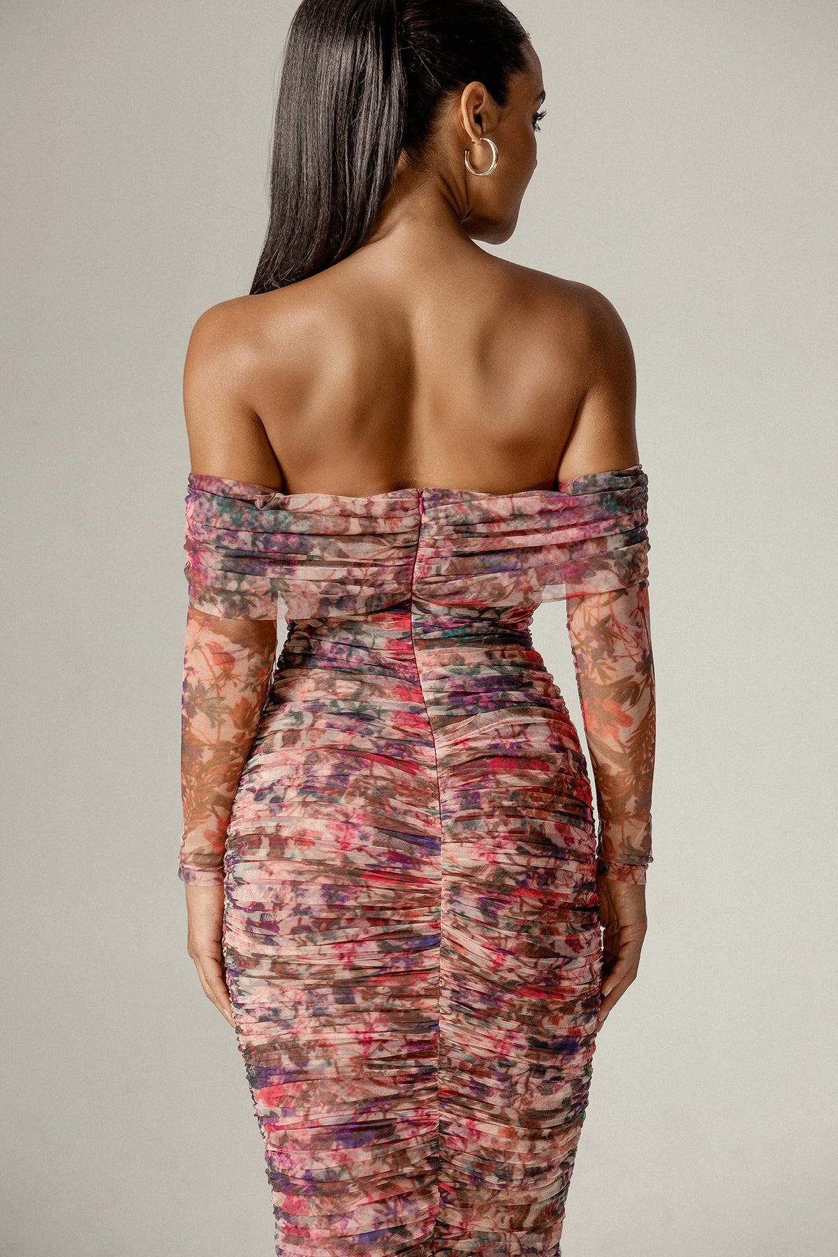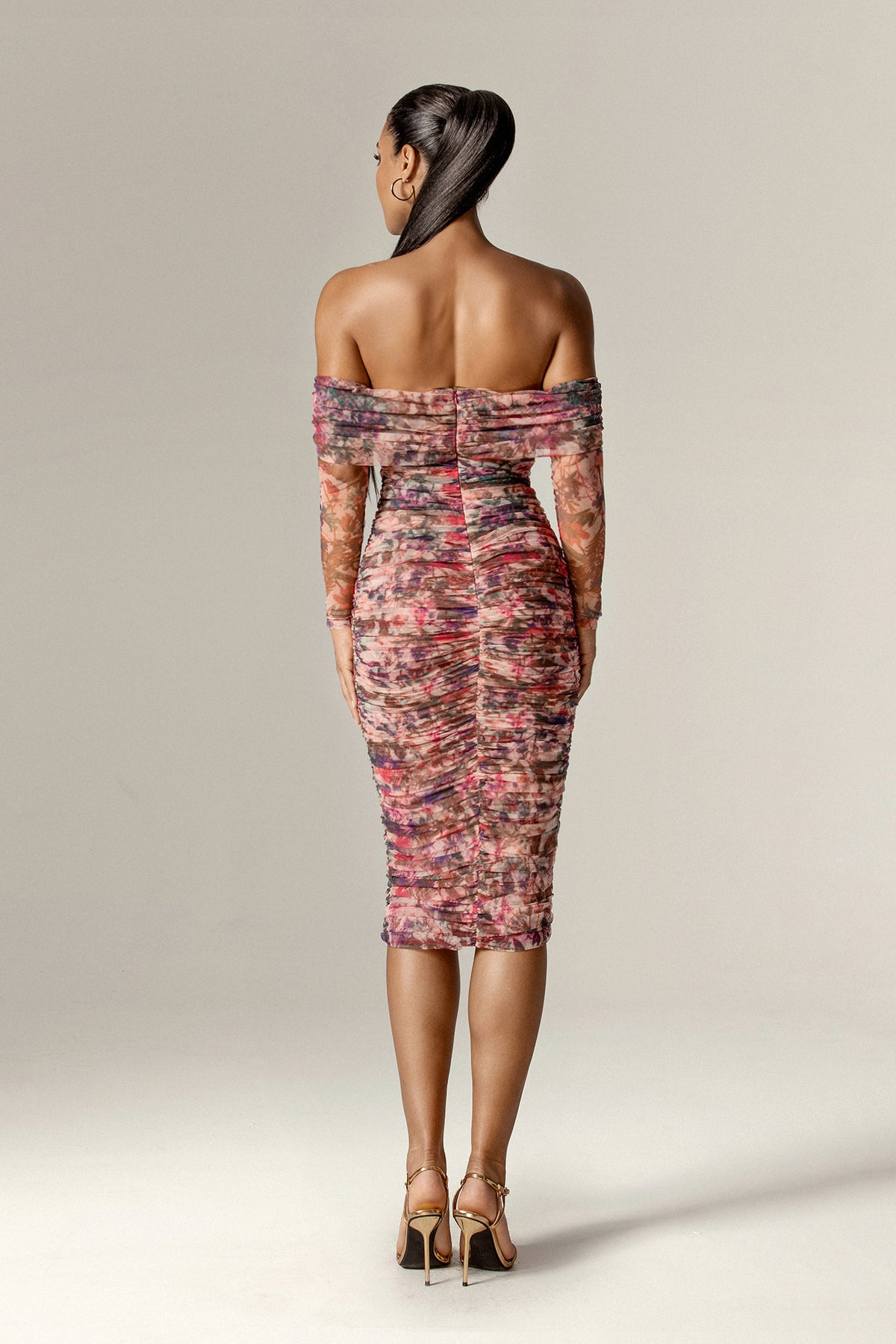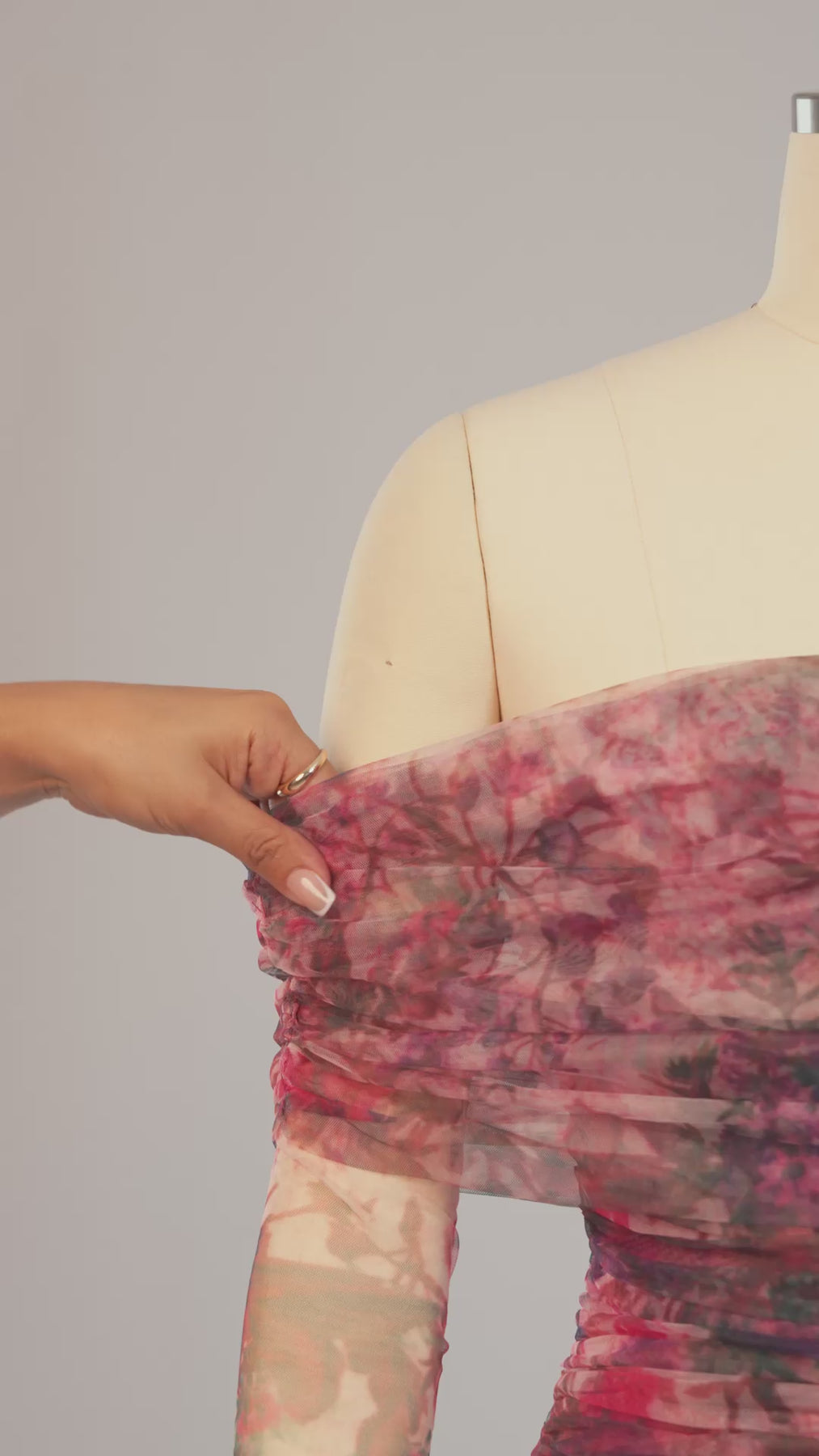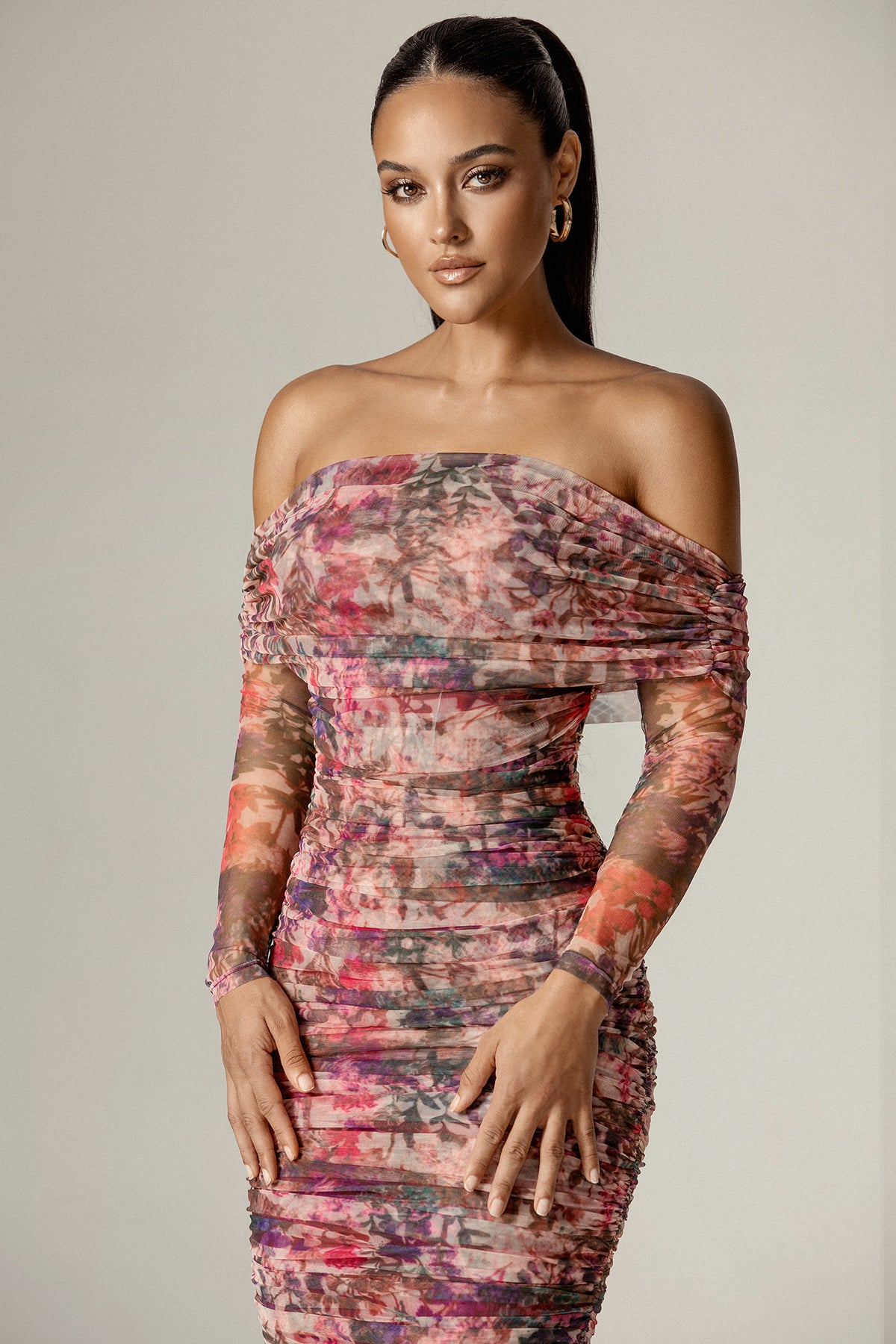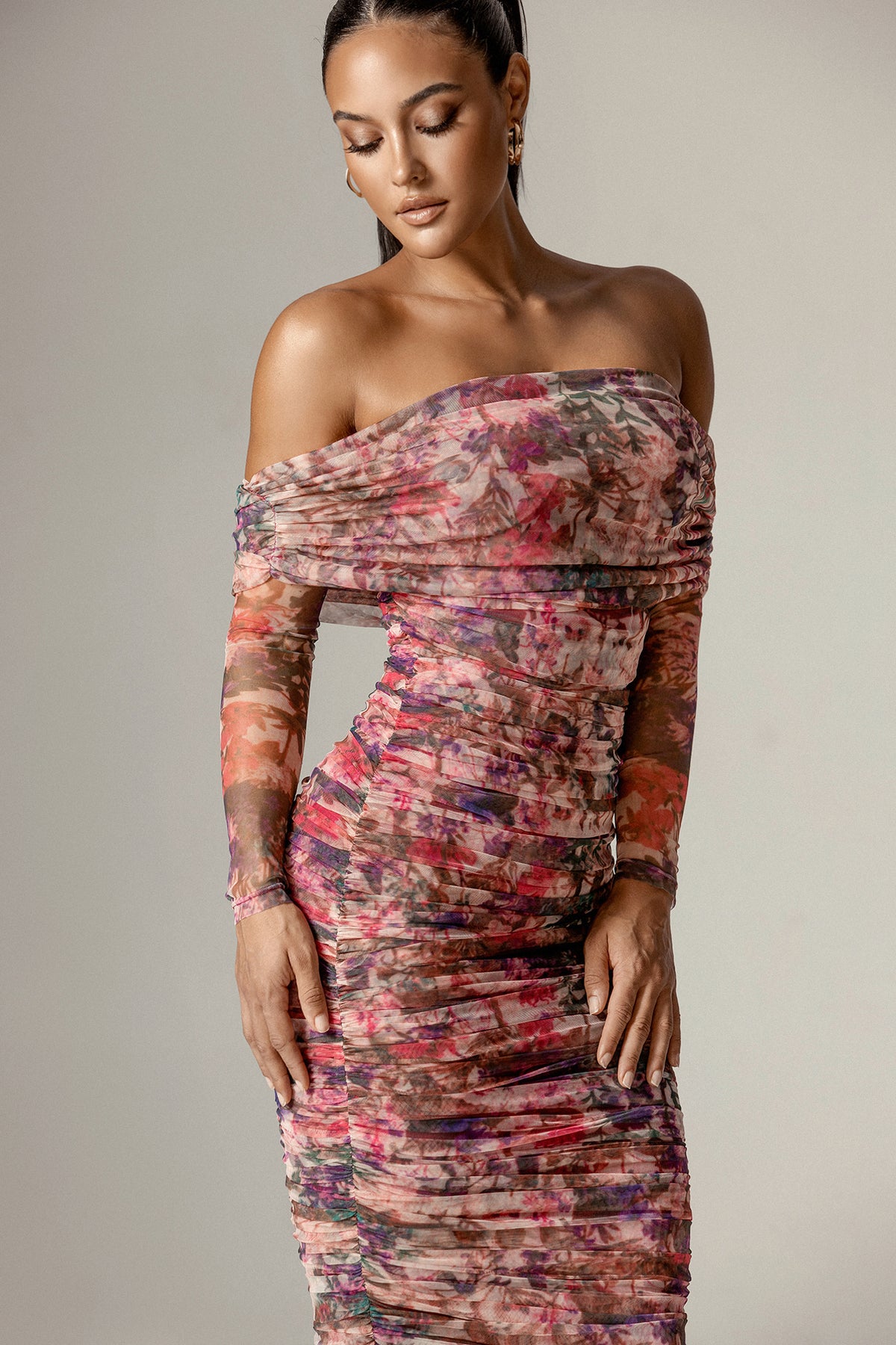 Meet Hayley, your all-season floral moment. She’s the kind of dress that turns any occasion into a memory. With an off-shoulder silhouette that contours and captivates, Hayley hugs your curves in confident elegance. Crafted in soft, ruched mesh and finished in our Crimson Garden print a lush floral in rich, autumn-kissed hues, she’s the perfect mix of romance and effortless style.Balancing beauty with function, Hayley is fully lined in stretch fabrics and designed with a built-in underwired bra for subtle lift and secure support no extra bra needed. Whether you’re strolling into a fall wedding, raising a glass at golden hour, or heading out for date night, this dress moves with you and makes a statement that lingers.