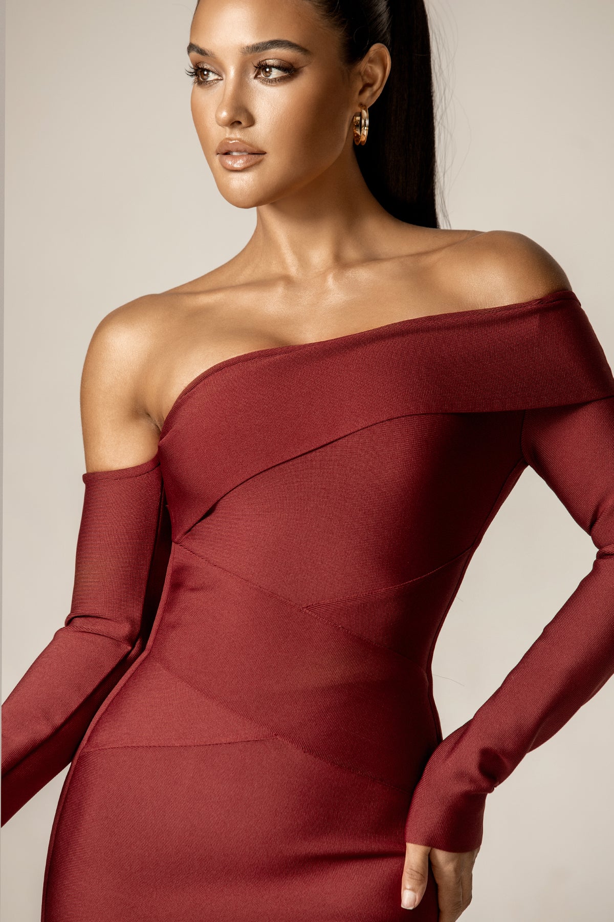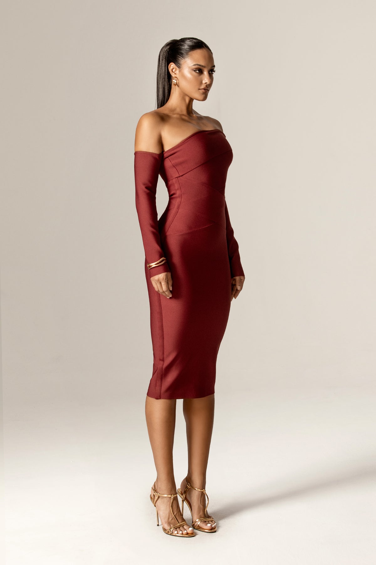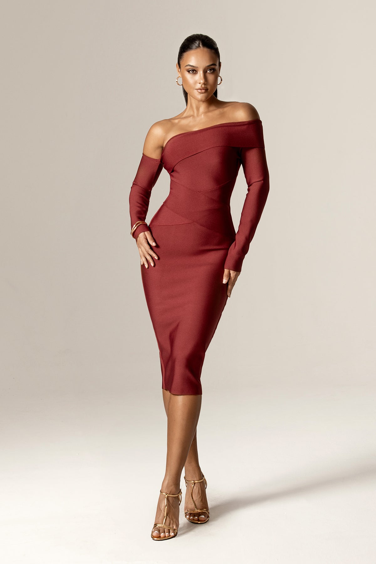 Shiva Off-Shoulder Bandage Midi Dress (Fire Brick)