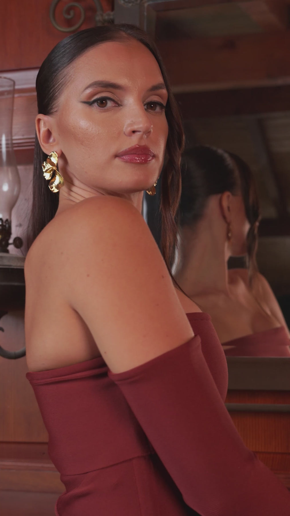 The design features an off-shoulder neckline that frames the décolletage with soft, sculptural precision, while the fitted long sleeves and contoured seam detailing enhance the hourglass silhouette. The midi length adds a timeless allure, making this piece as refined as it is captivating.