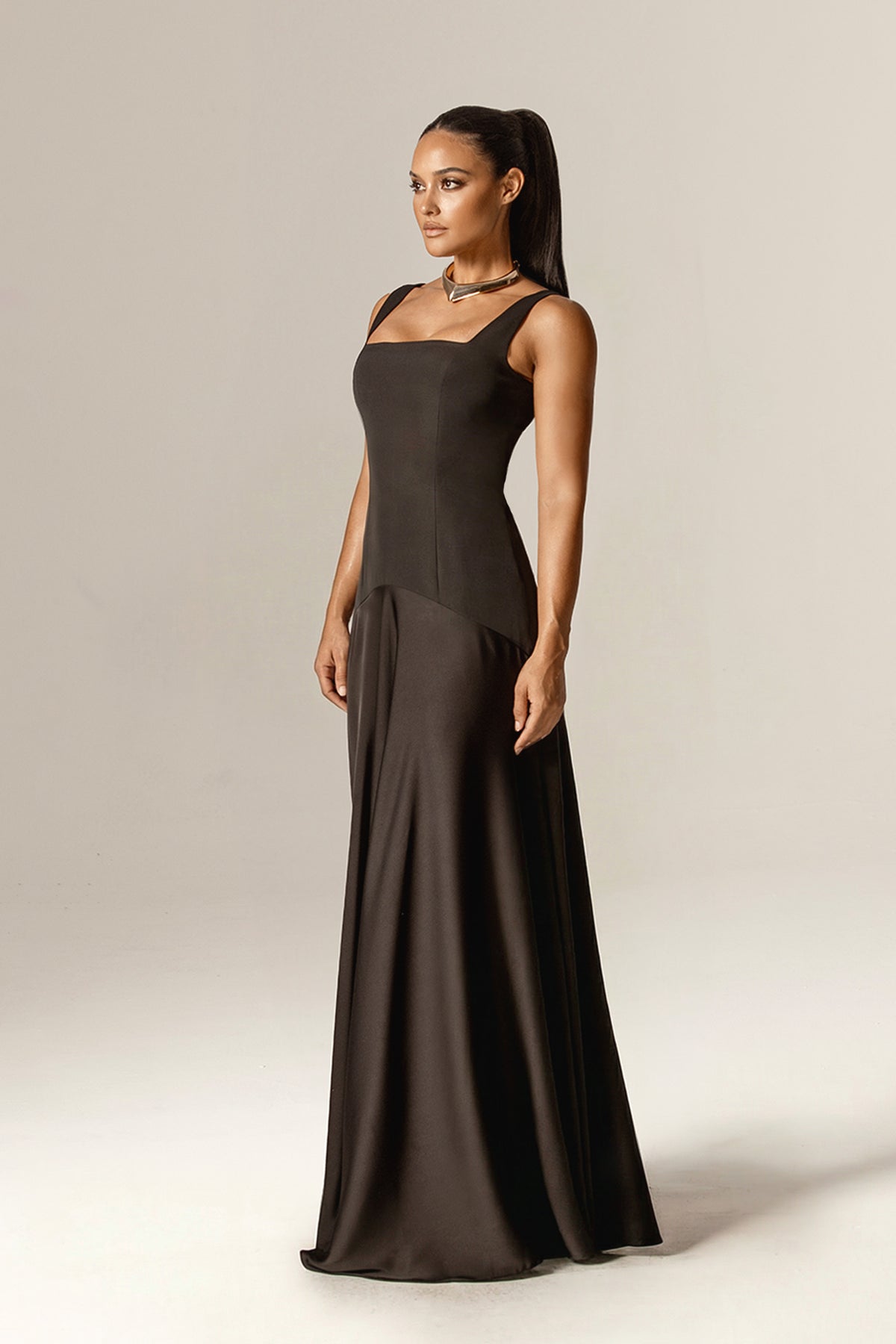 Beverly Square Neck Crepe Maxi Dress (Black)