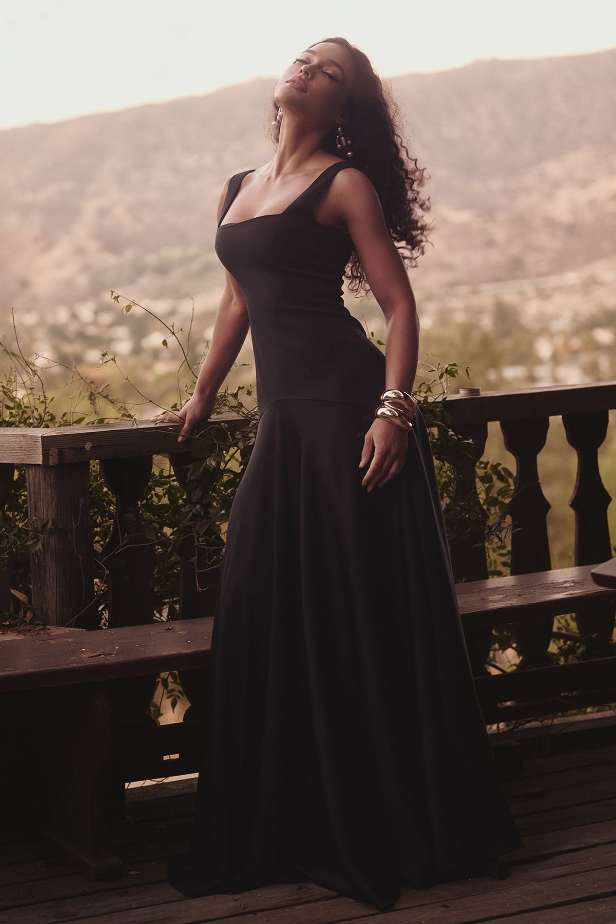 Delara Multi Strand Brass Necklace or minimal statement earrings and sleek heels.
