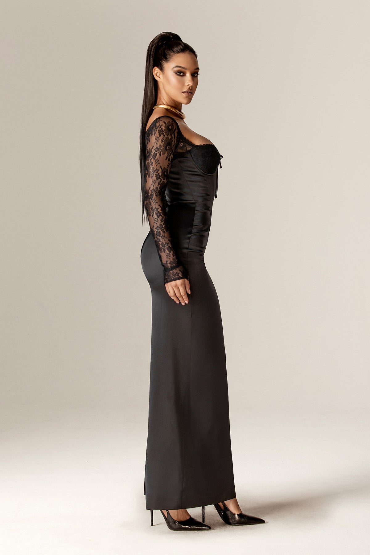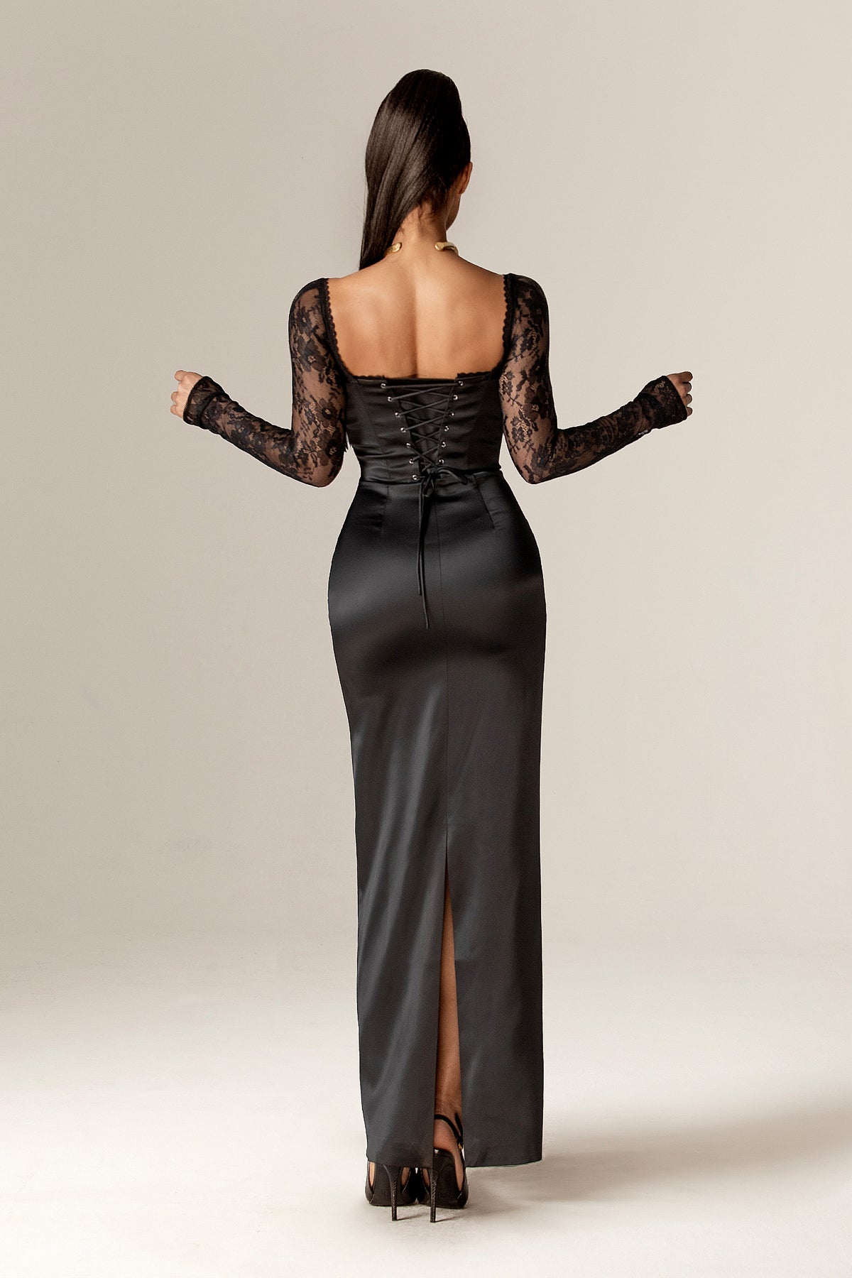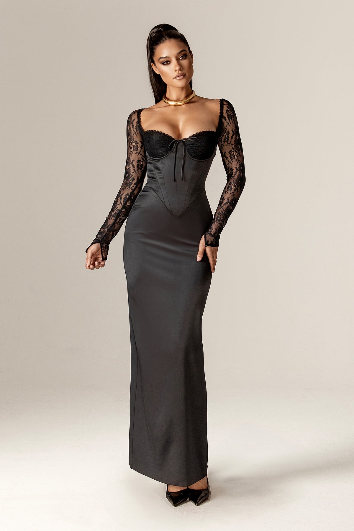 A dress born for the after-dark hours, where elegance meets temptation and every glance lingers a little longer. The Dionne Corset Maxi Dress is a love letter to confidence, crafted in silky black satin and delicate lace that dances with the light.