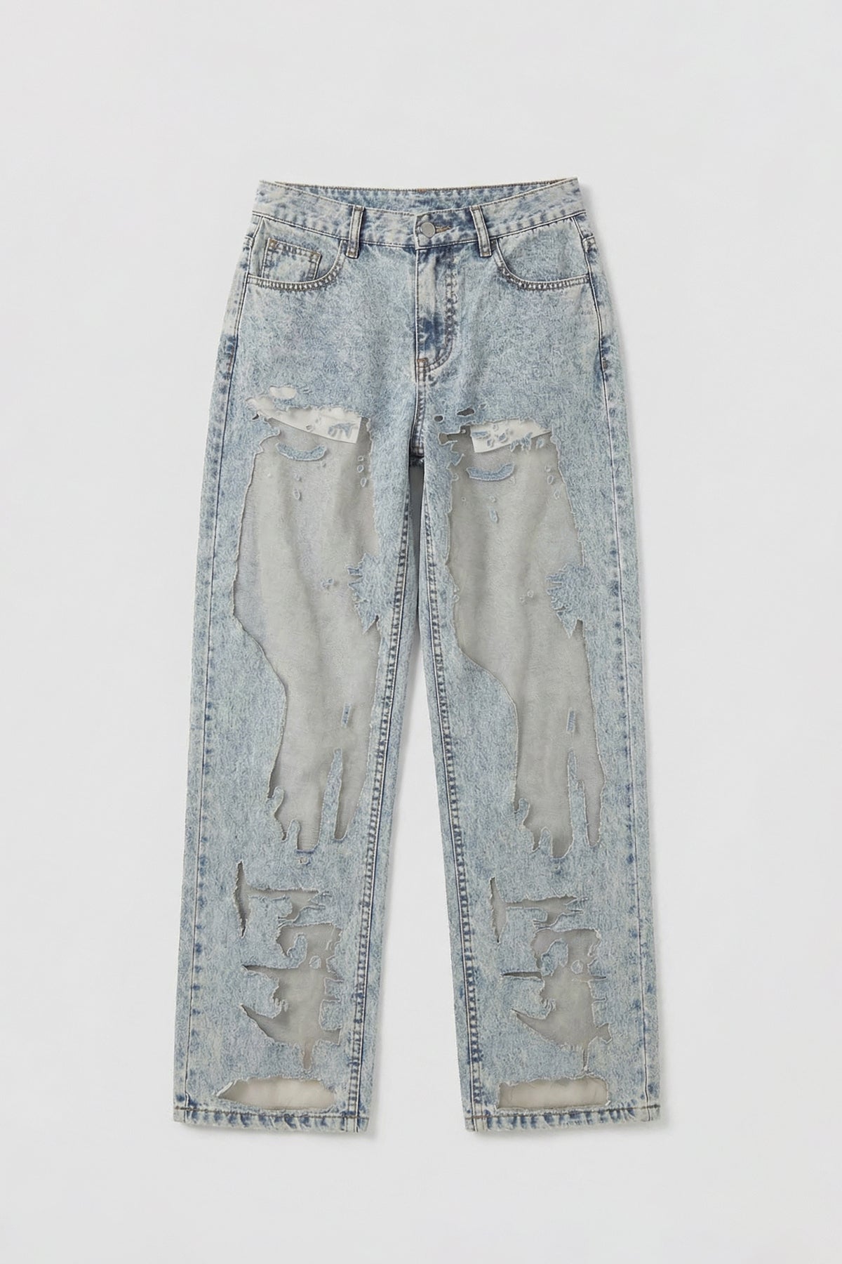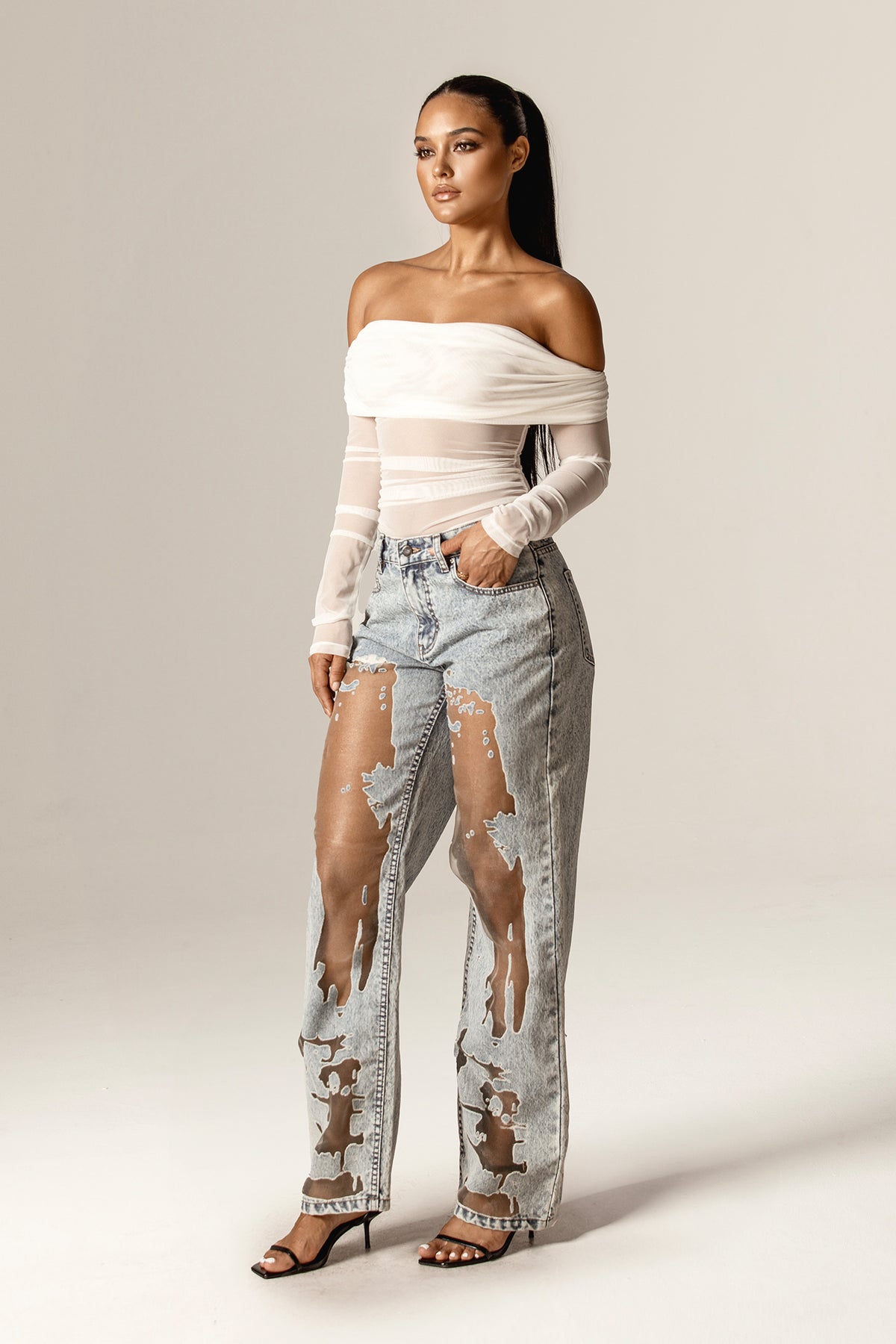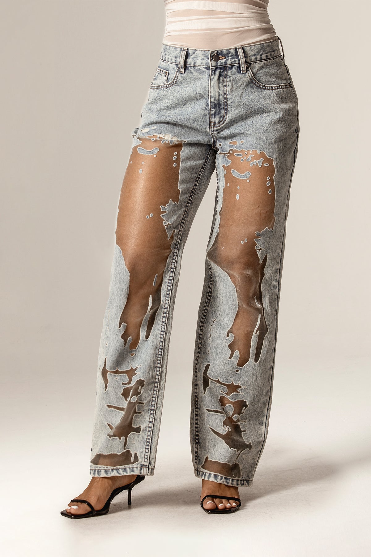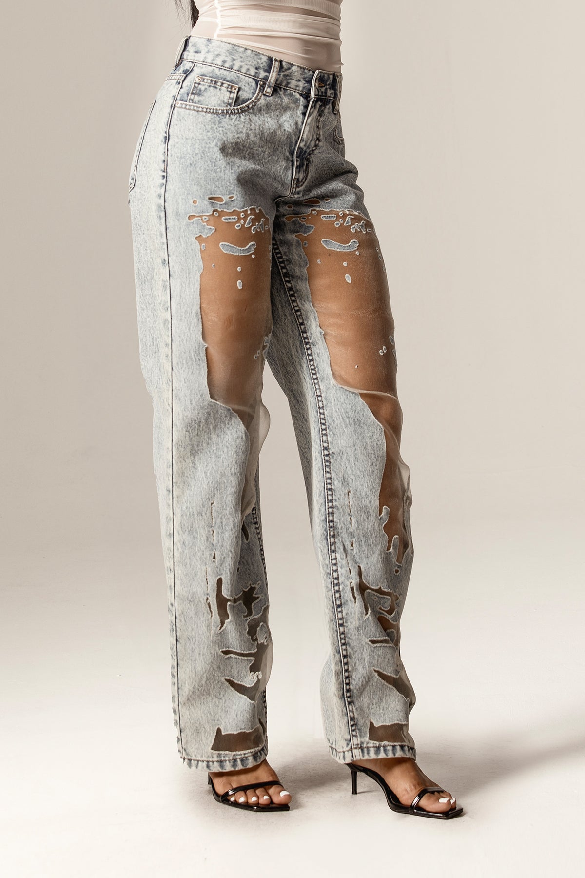 The high-waisted fit elongates the silhouette, while the straight wide-leg cut delivers a strong, modern edge. The sheer detailing adds depth and intrigue, transforming everyday denim into a standout fashion piece that moves effortlessly between street style and elevated styling. Tula is designed for those who dress with confidence and individuality.