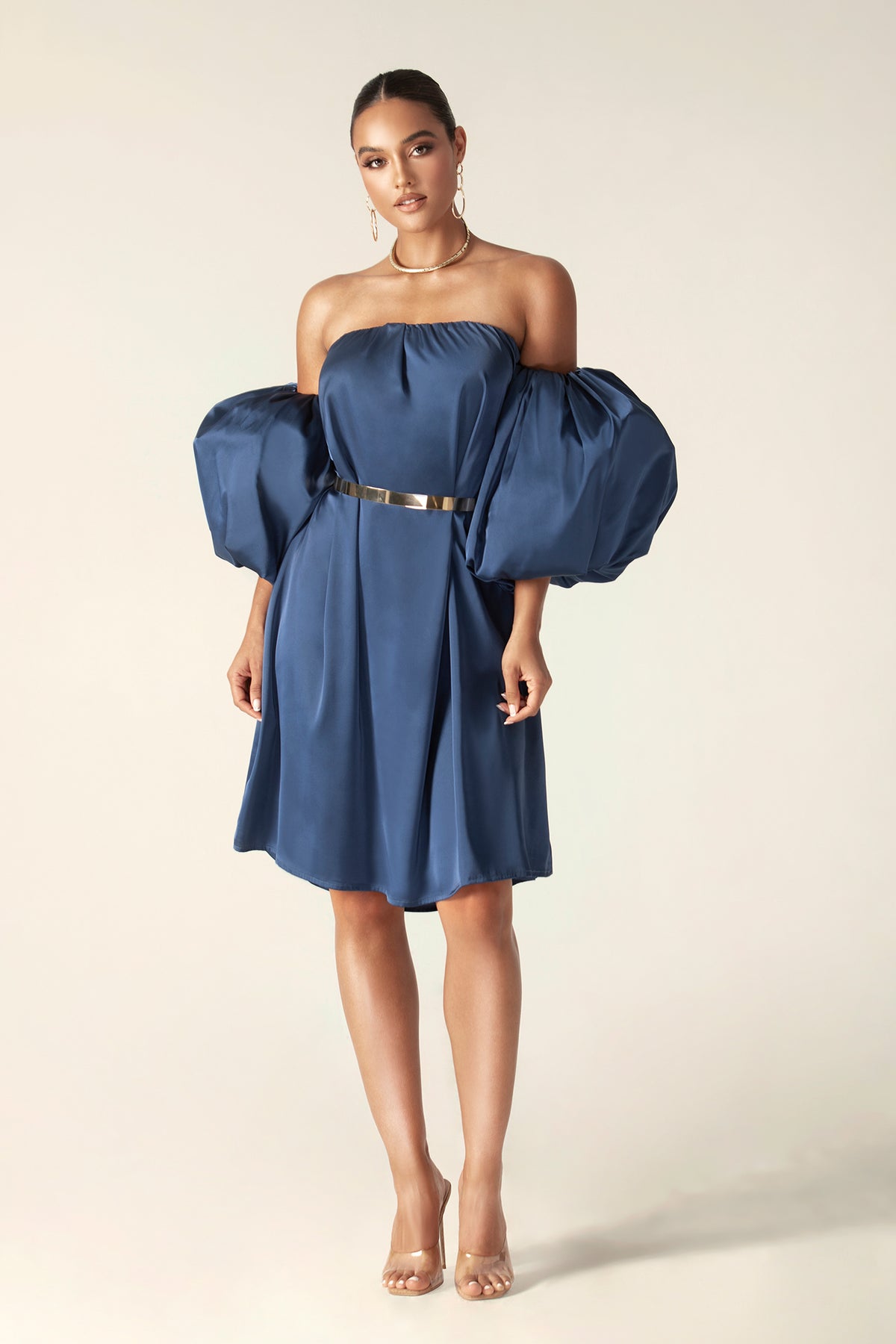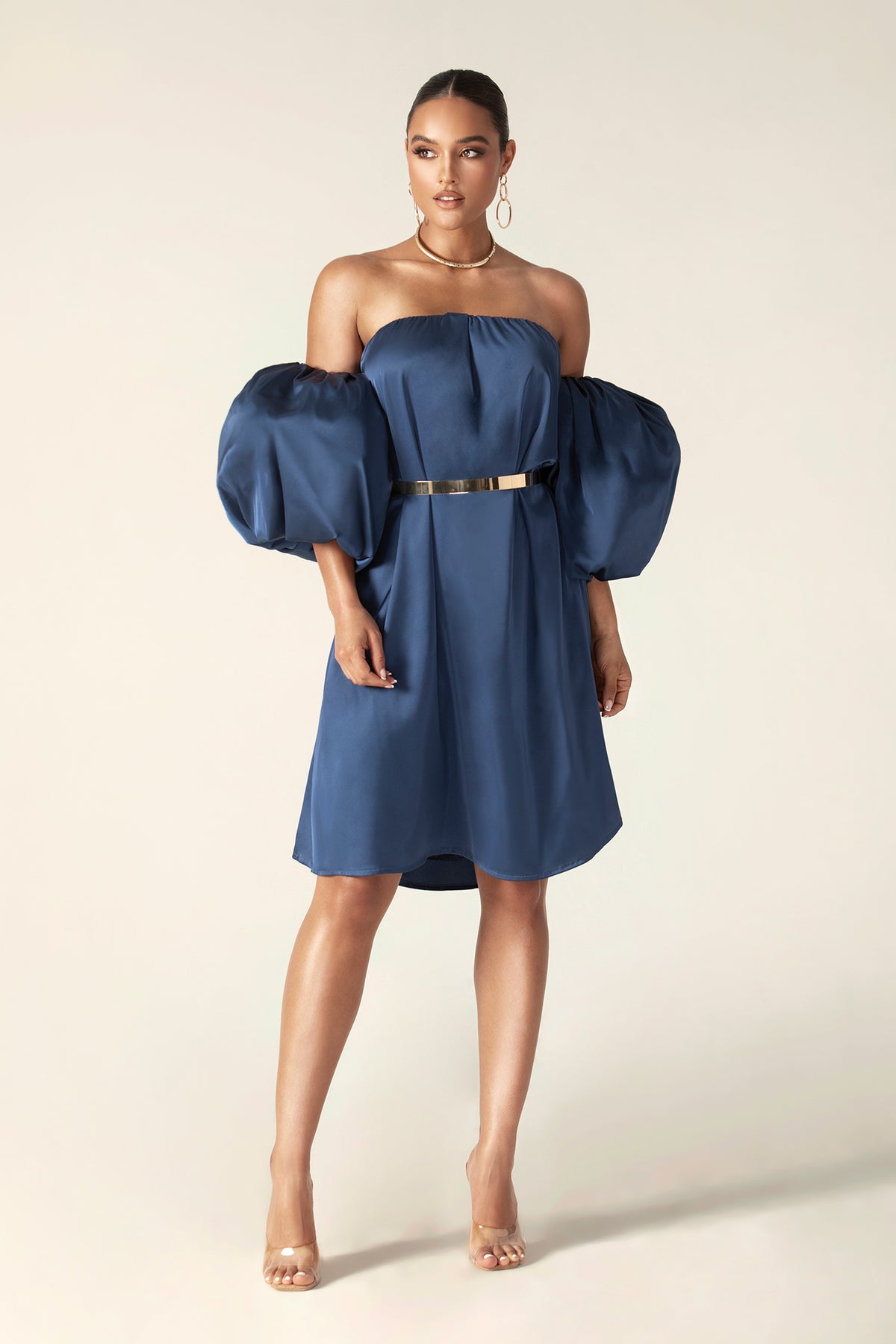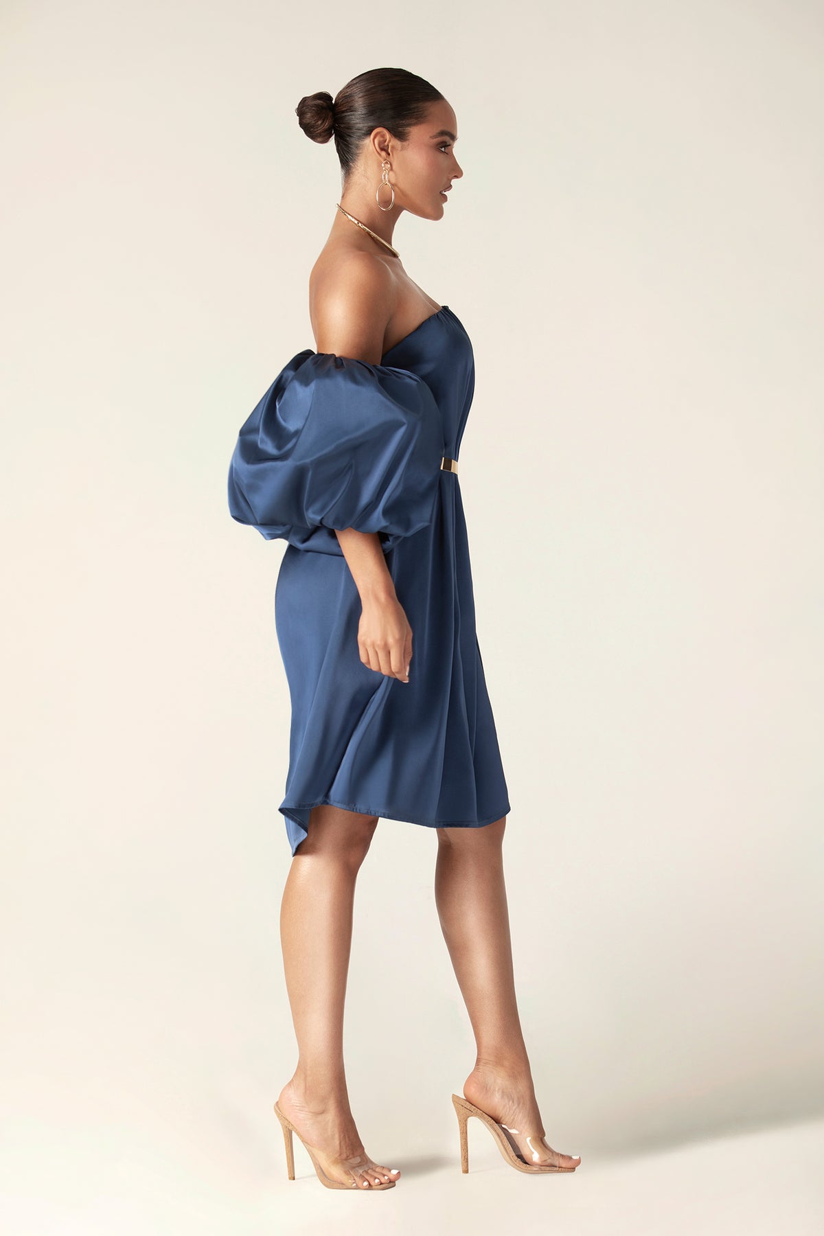 Ella Puff Sleeve Satin Midi Dress (Navy Blue)