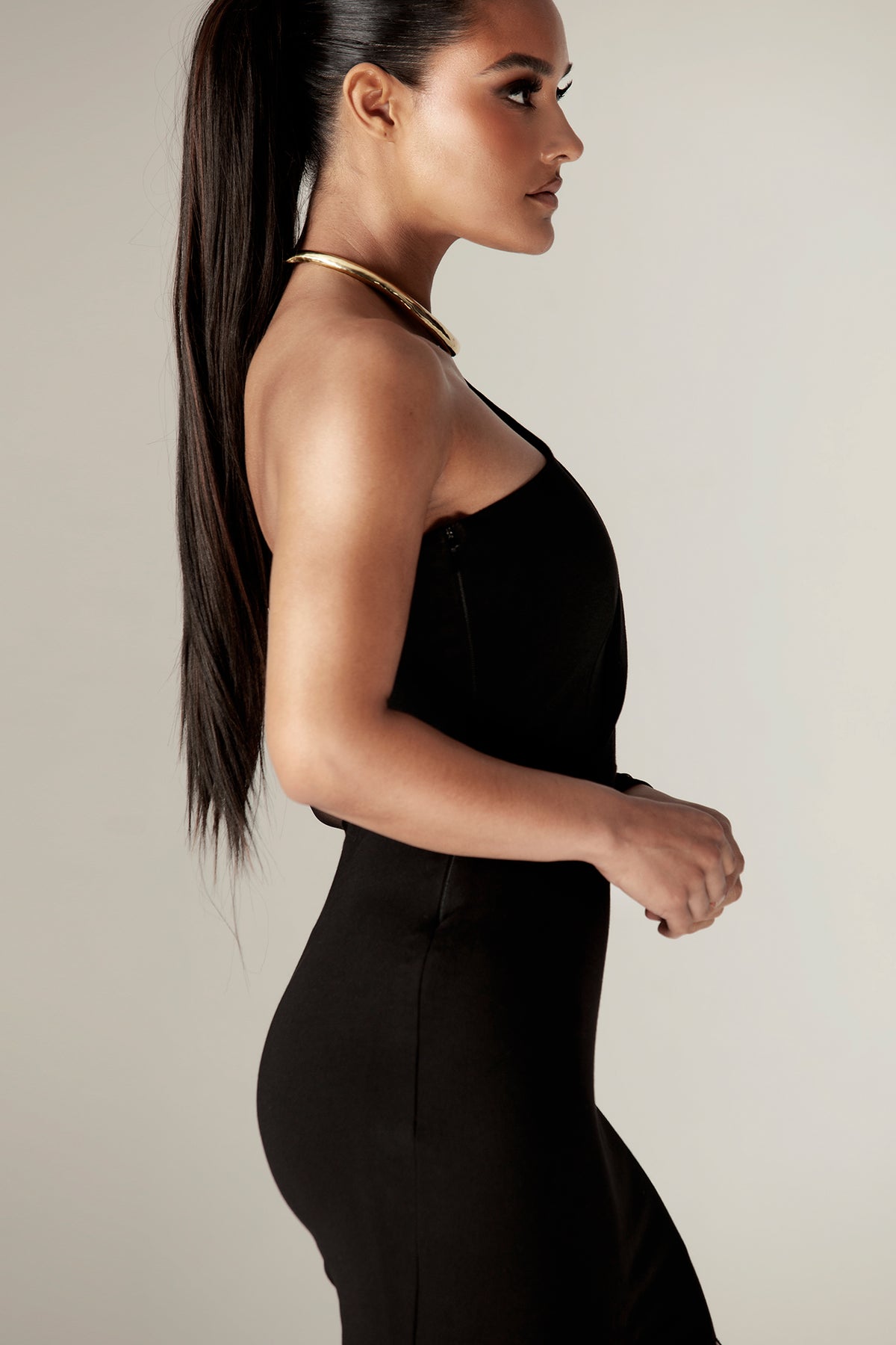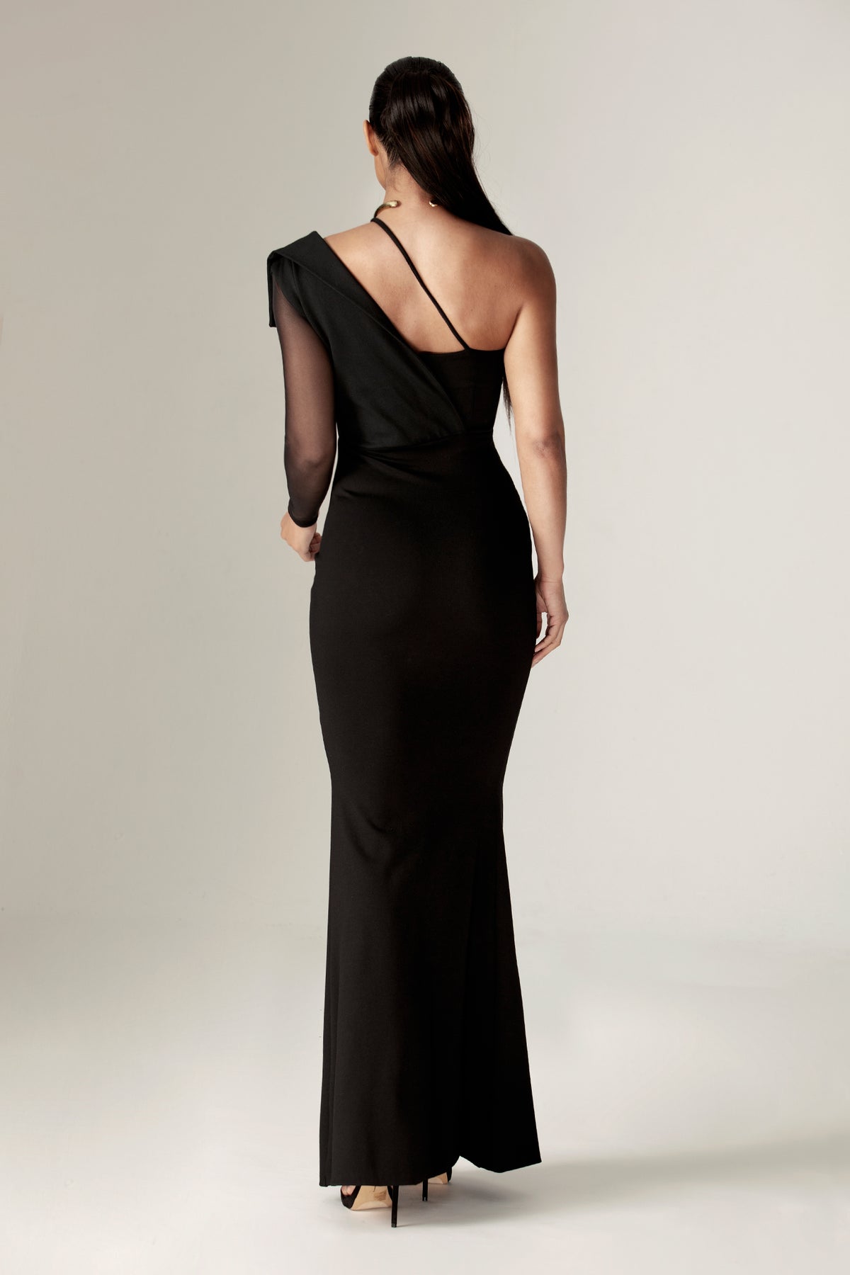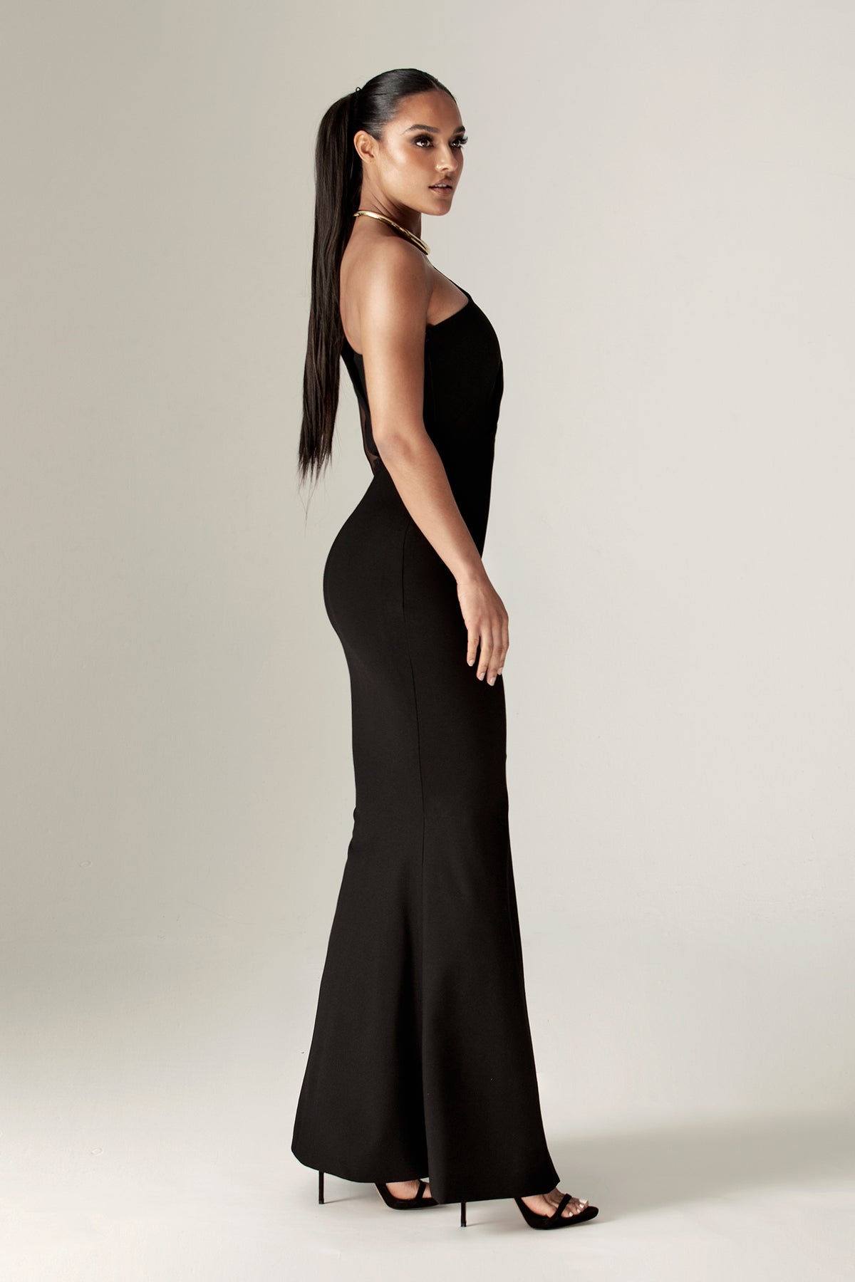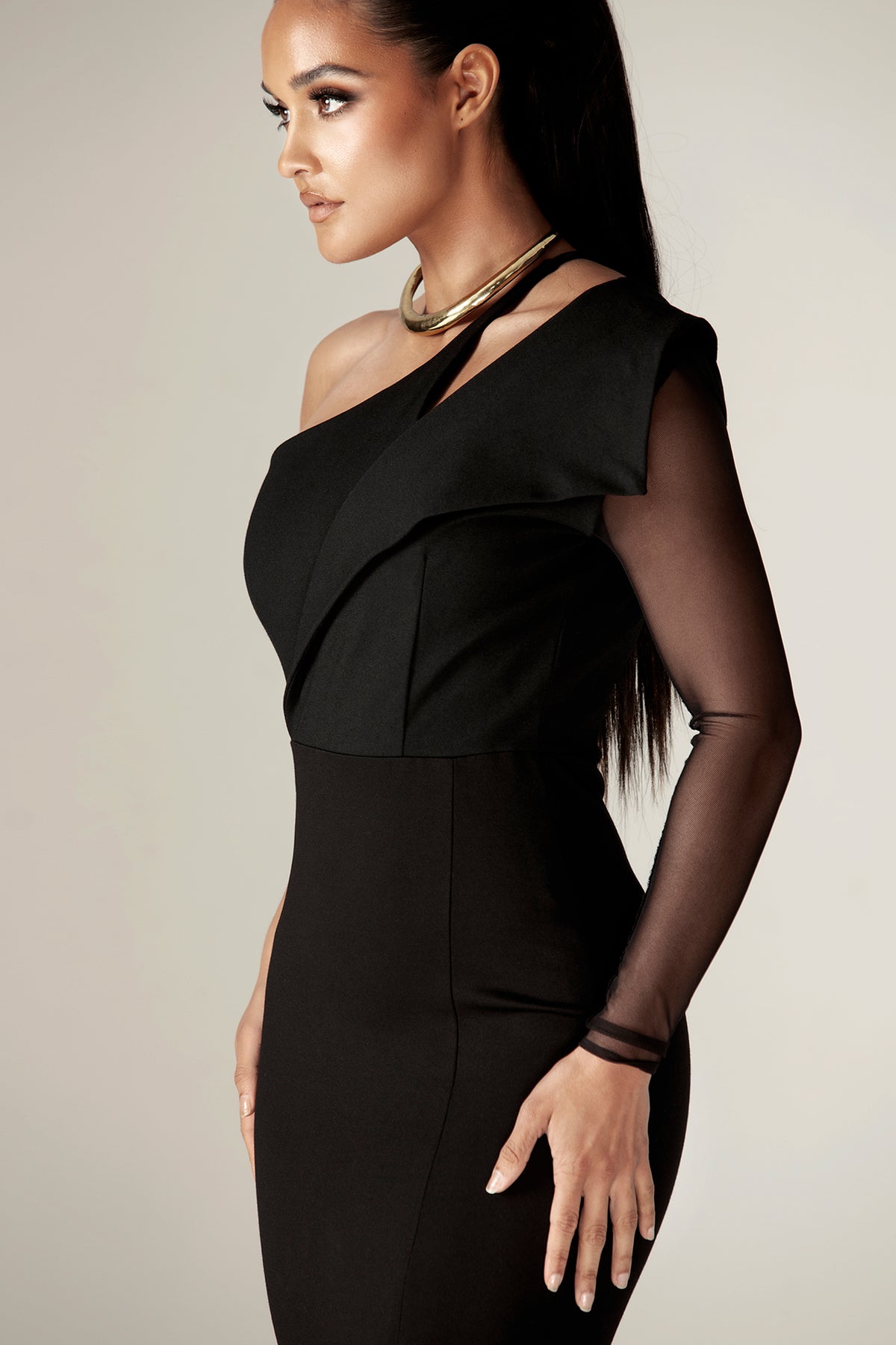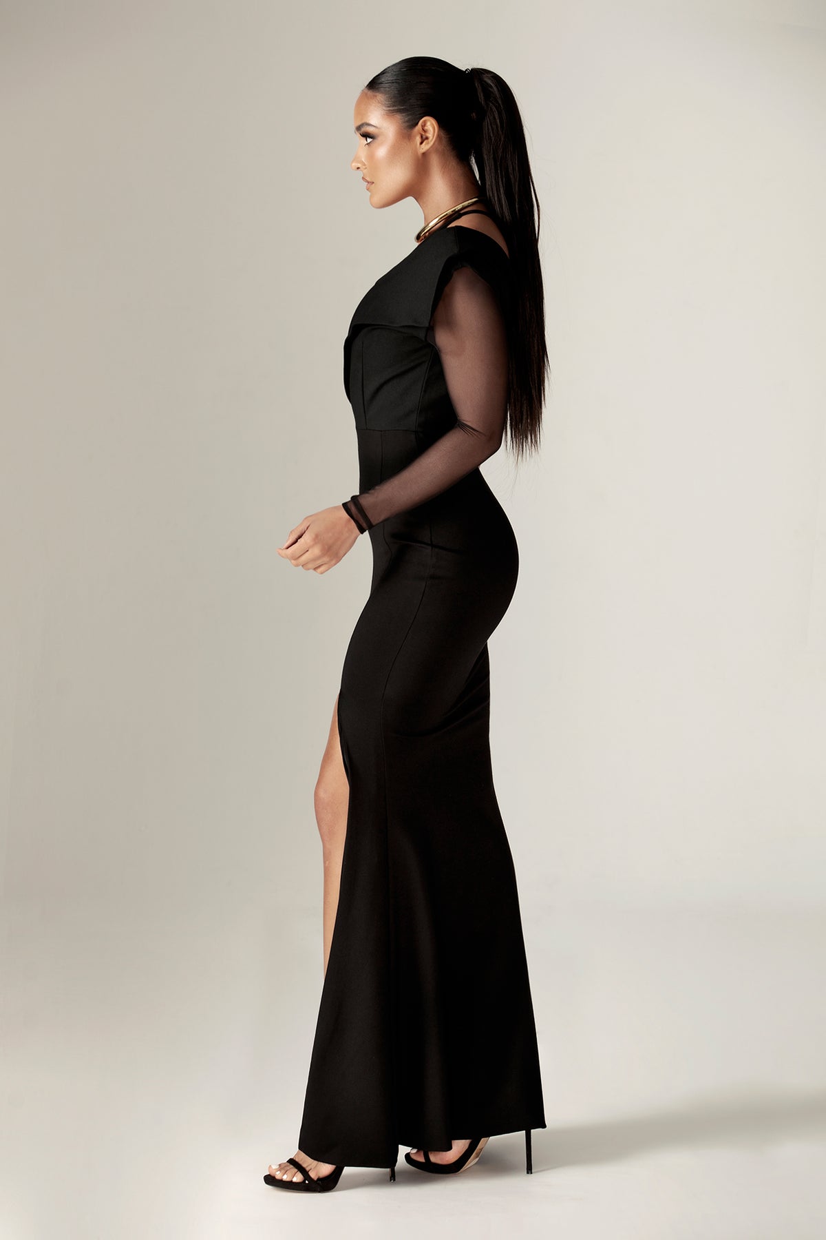 The ultimate in glamour, 'Abigail' dress has a gorgeous neckline silhouette, we love the pretty asymmetrical cut out to the shoulders and fully transparent sleeve for more modern look . It's Cut from our signature highest quality heavy-weight stretch (Ponte De Roma) fabric that smooths and the internal layer of the dress is lined in soft and very smooth texture lining. you can go braless if you wish or you can fit a strapless bra under if you'd prefer.'Abigail' is the perfect new generation maxi dress. The longer cut is classy and the leg baring front slit is super sexy as you walk. it can be worn anywhere, dinner dates, cocktail nights, formal events. Team with our new ‘Tonia’ Chain Belt to be more glamorous.