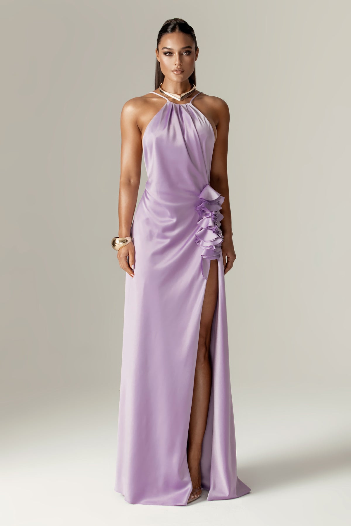 Whether you're attending a gala or any parties, our 'Adela' dress is fitting for any high octane occasion. It's cut from our luxurious lustrous satin for a fluid drape and has a halter neck cut. Coated with 3d flowers on the side hip and designed for a figure skimming silhouette, low back and is finished with a thigh split for extra drama. Team yours with sparkly pumps and wear when you want to make an entrance.