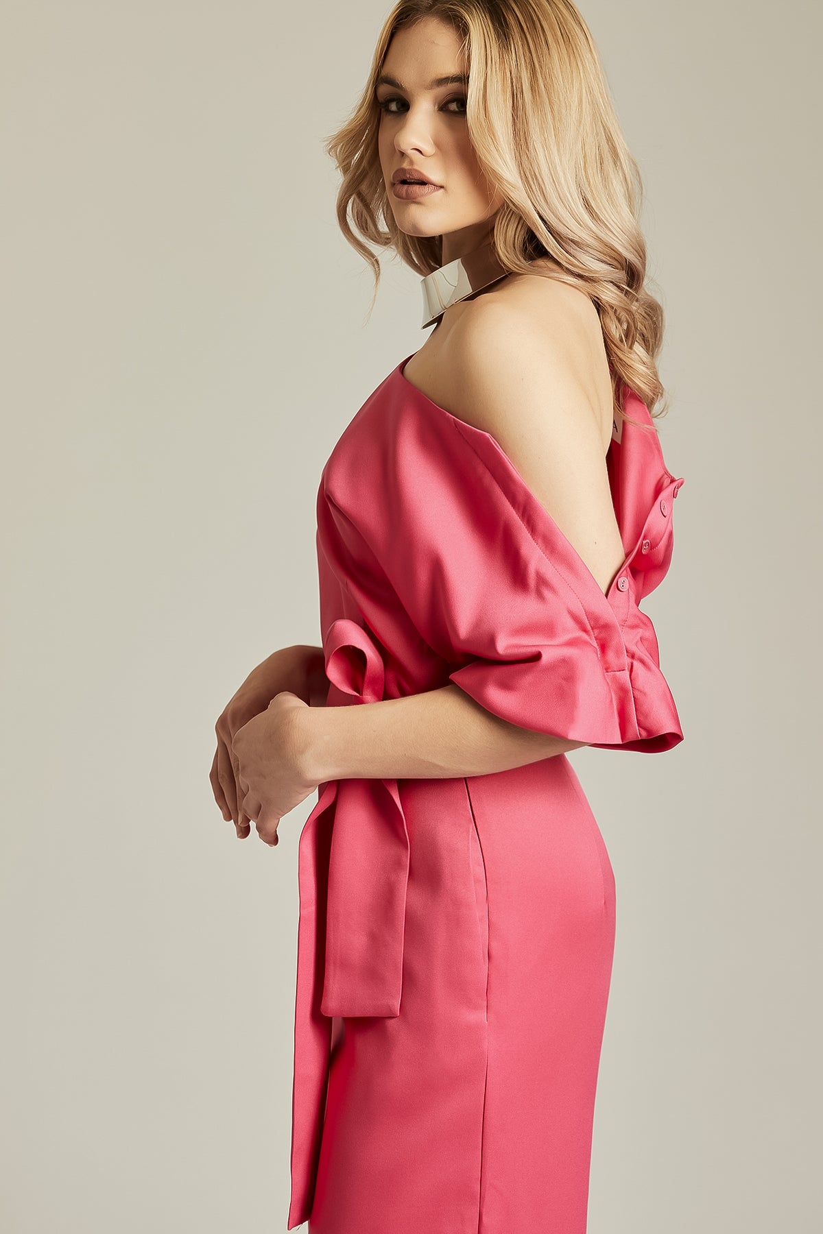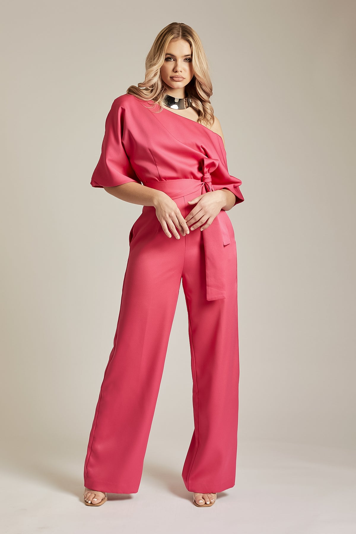 Statement tailoring at its finest, It's crafted from a luxurious crepe fabric in Pink. 'Ana' is simply stunning with a super feminine neckline that is defined by one shoulder that it sits elegantly off the shoulder when it's unbuttoned to reveal a sweeping neckline to really accentuate the shoulders for a real sexy vibe. It has a belt for incredible figure cinching and shaping down to the waist before falling to a flattering high rise wide leg tailored pants that really elongates the legs to style with heels. It has a zip up the side for easy on and is a chic alternative if you aren't a dress person. It is lined for a smooth and seam free finish.