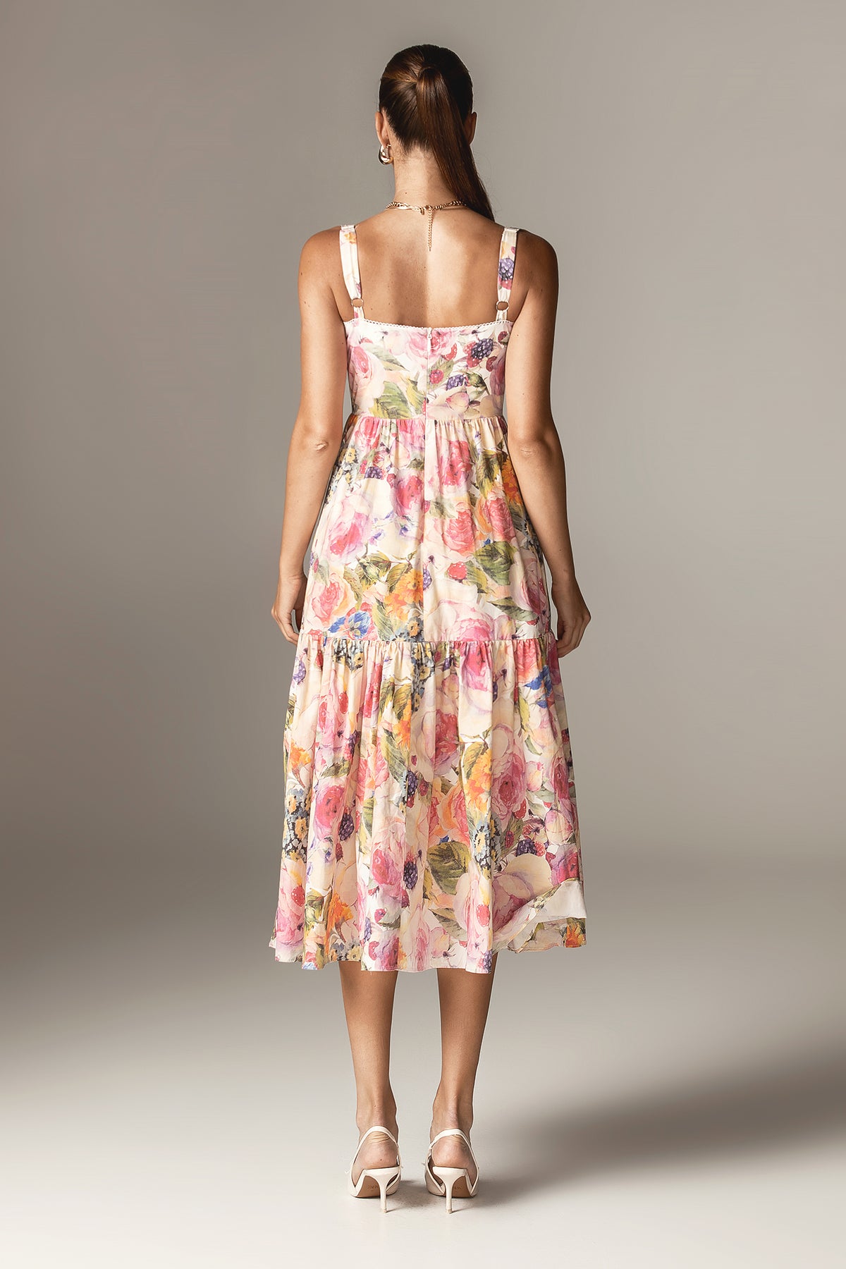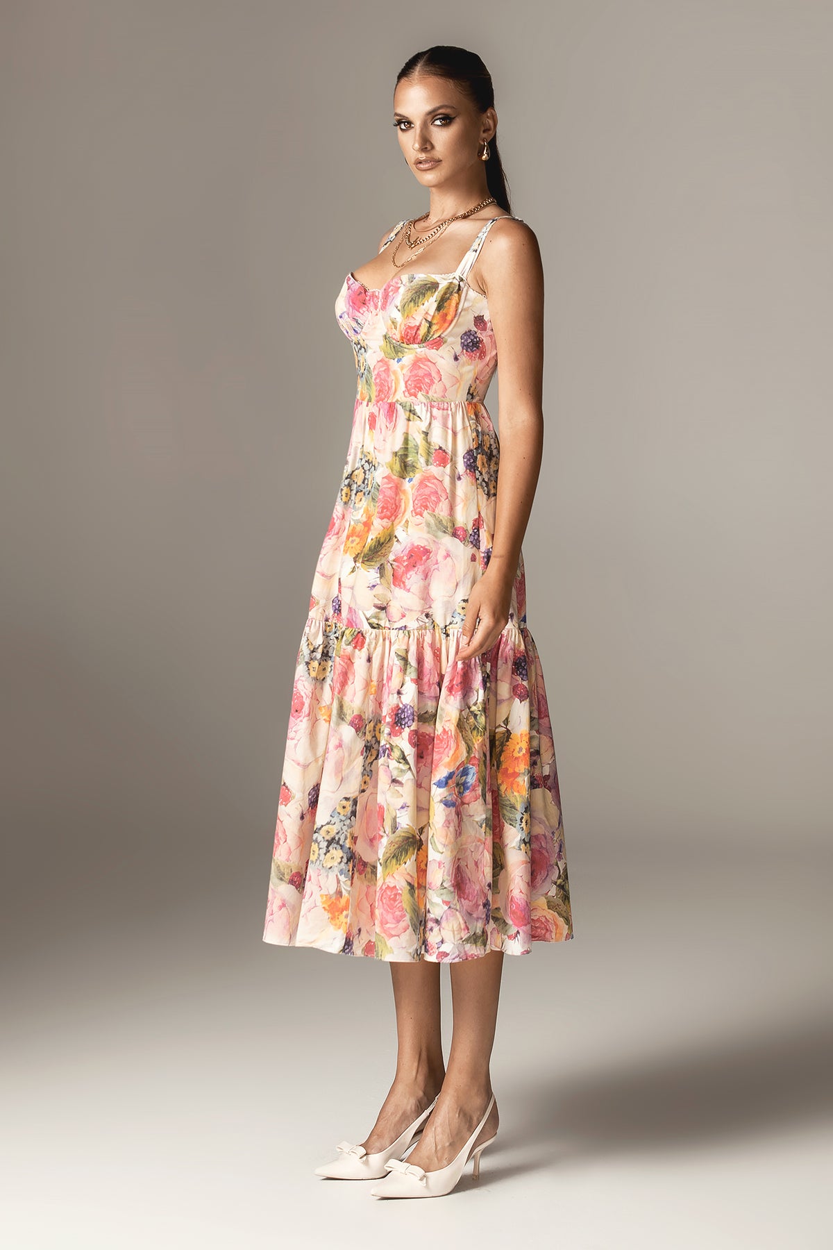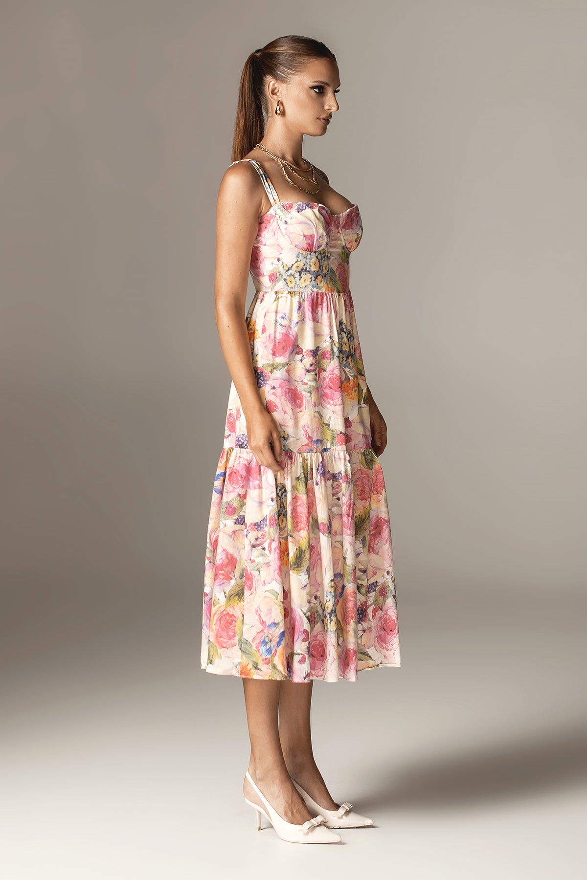 Embrace timeless elegance with the Andrea Bloom Rose Cotton Midi Sundress, a standout piece from our Golden Hour collection. Crafted from luxurious stretch cotton-rich fabric, this sundress features a flowy tiered skirt and a structured corseted bodice, exuding ultra-feminine charm. The pretty neckline with underwired cups adds to its romantic allure, while practical pockets enhance its appeal.