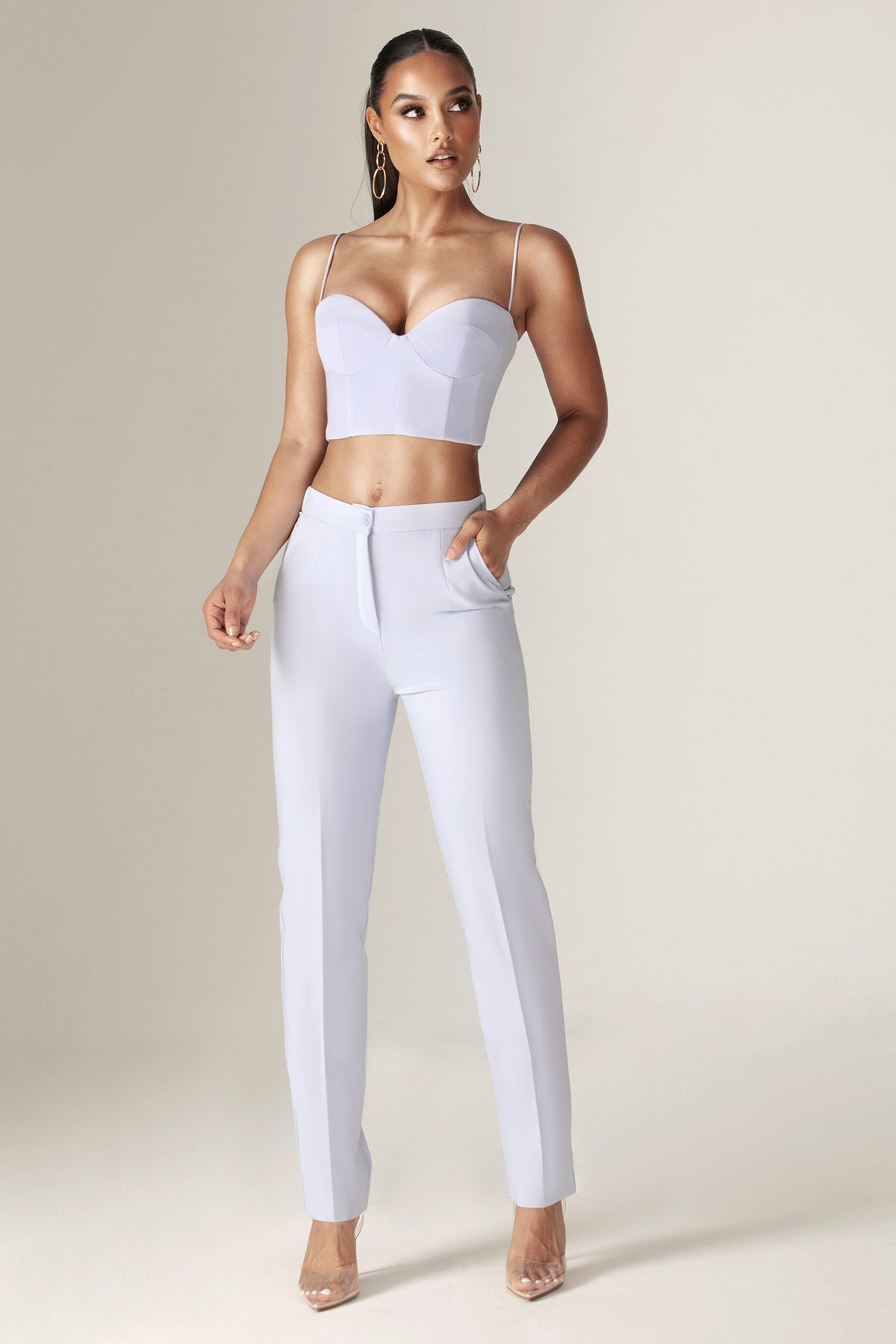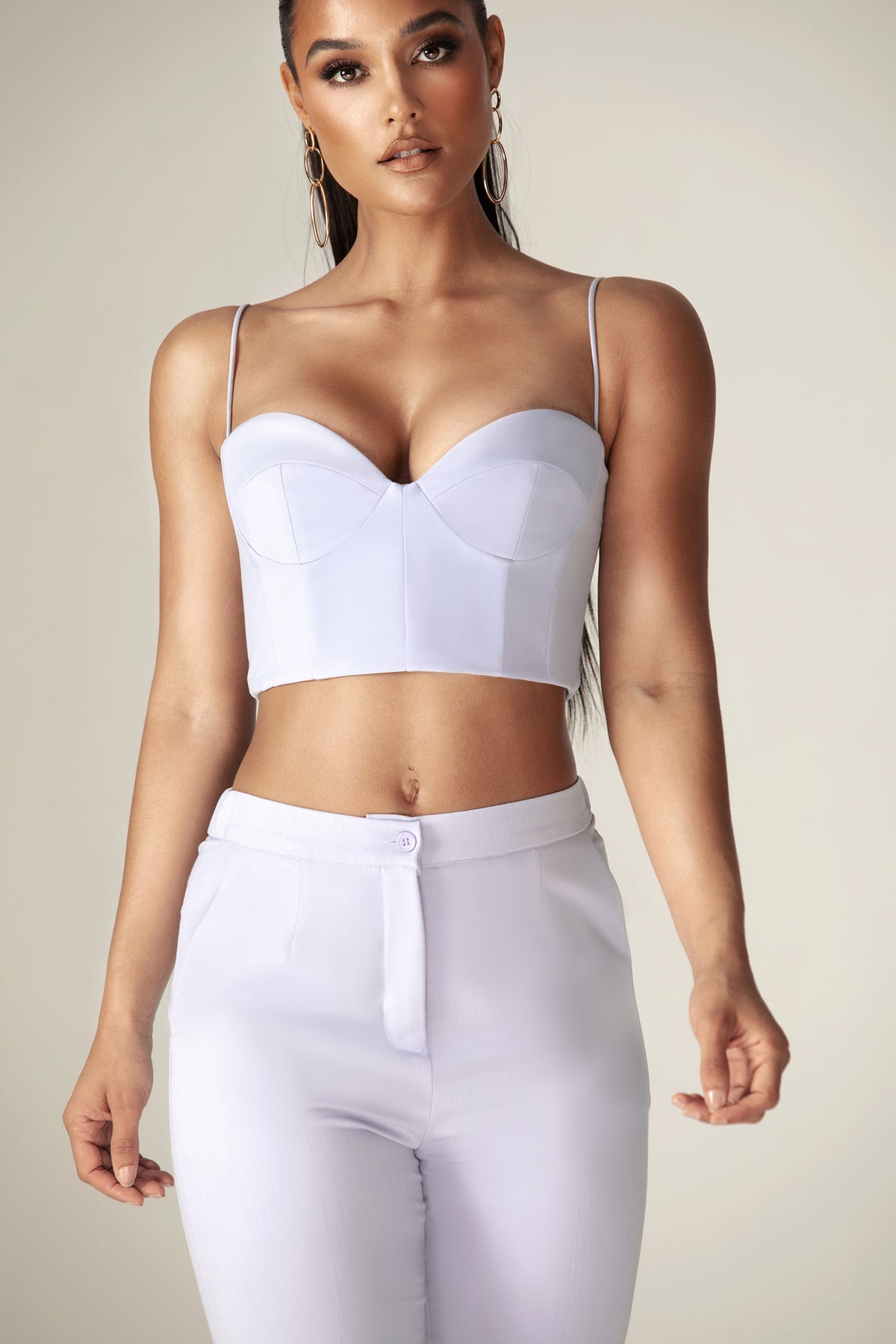 Our 'Carla' crop structure top is beautifully crafted from a crepe fabric in a off white tone to welcome in the warmer season. Inspired by traditional crop top, The boning provides corset-inspired structure and support that snatches the figure and we love the ruching across the bust to enhance the feminine feel in a 90's inspired straight neckline held by delicate spaghetti straps.We think the cropped length works well with Carla tailored strait pants.It has adjustable hooks and eyes to the back for easy on and is suitable for any bust size as it has under bra wire.
