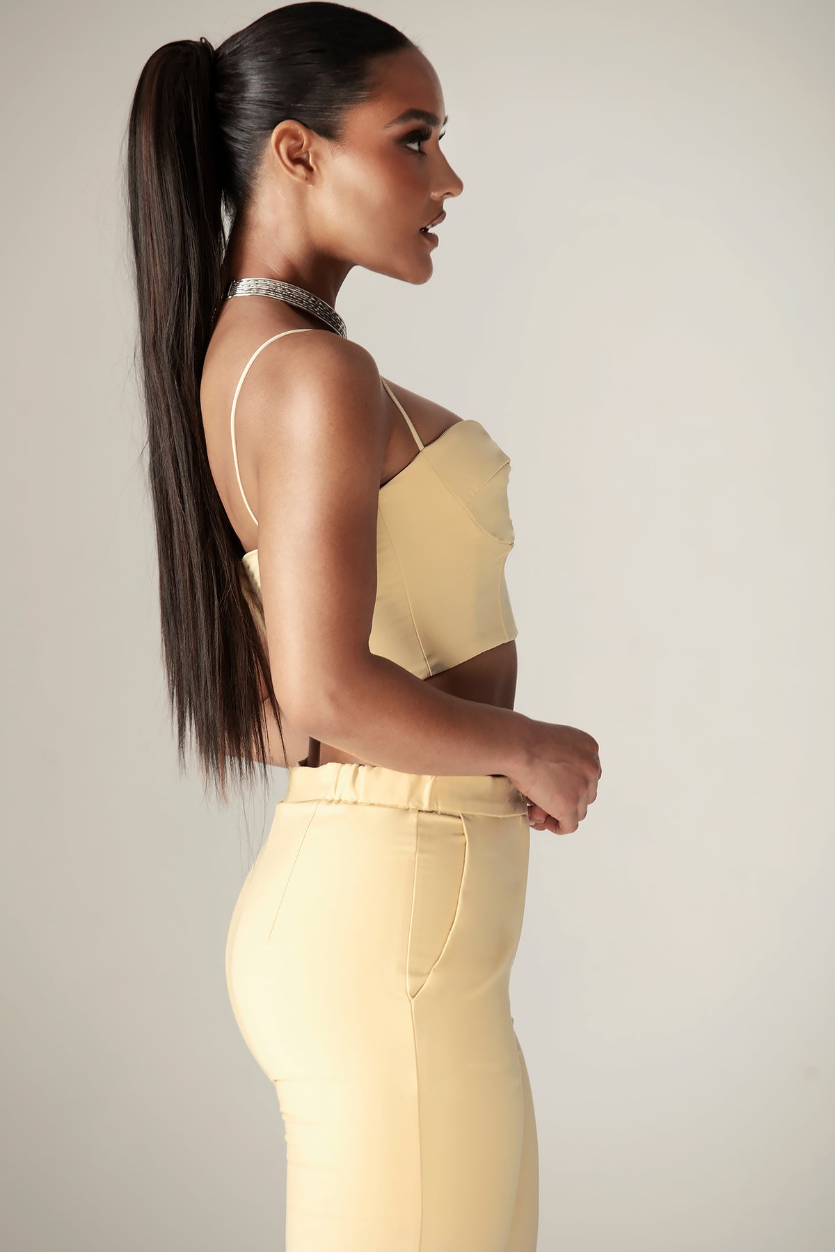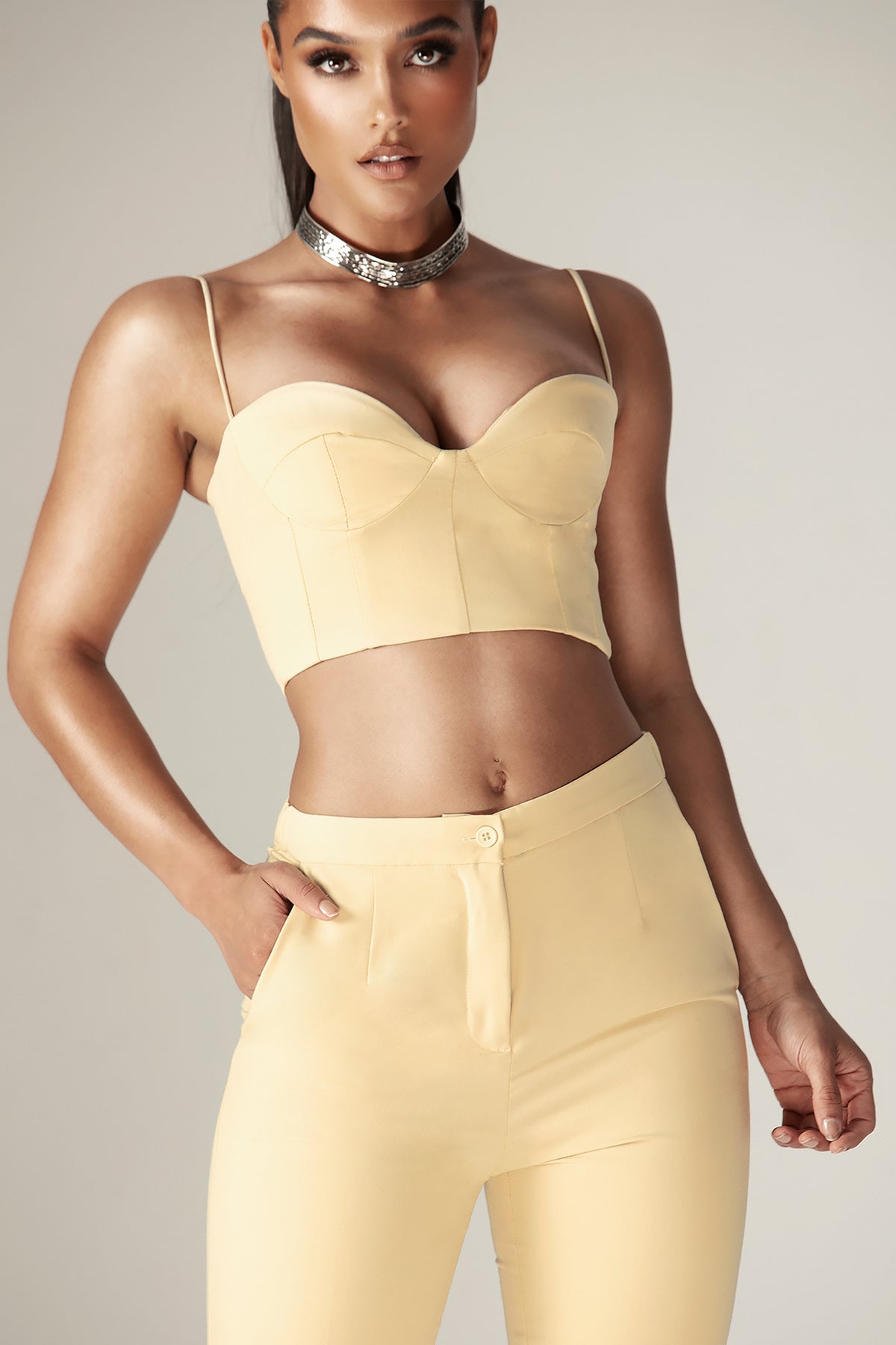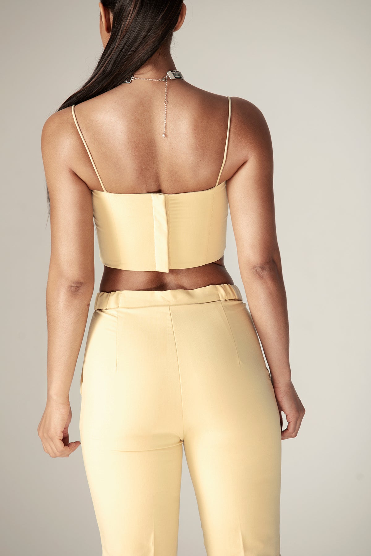 Our 'Carla' crop structure top is beautifully crafted from a crepe fabric in soft yellow tone to welcome in the warmer season. Inspired by traditional crop top, The boning provides corset-inspired structure and support that snatches the figure and we love the ruching across the bust to enhance the feminine feel in a 90's inspired straight neckline held by delicate spaghetti straps.We think the cropped length works well with a 'Niaz' high waisted wide legs pants.It has adjustable hooks and eyes to the back for easy on and is suitable for any bust size as it has under bra wire.