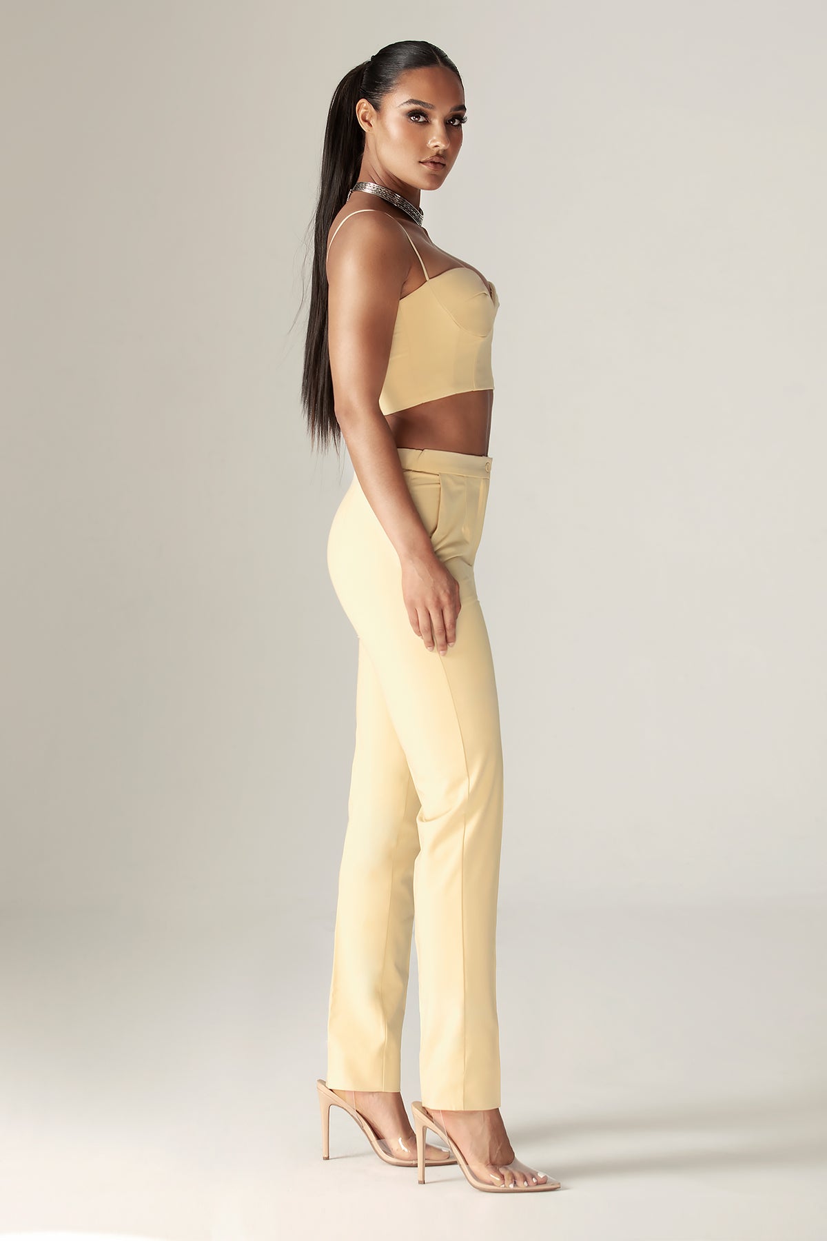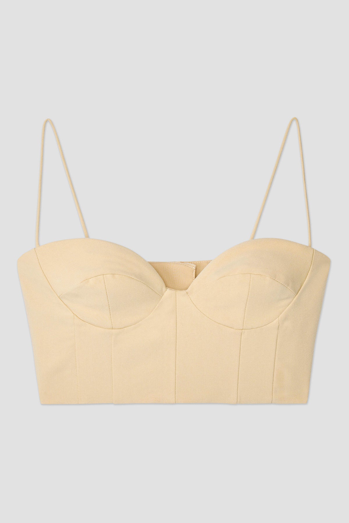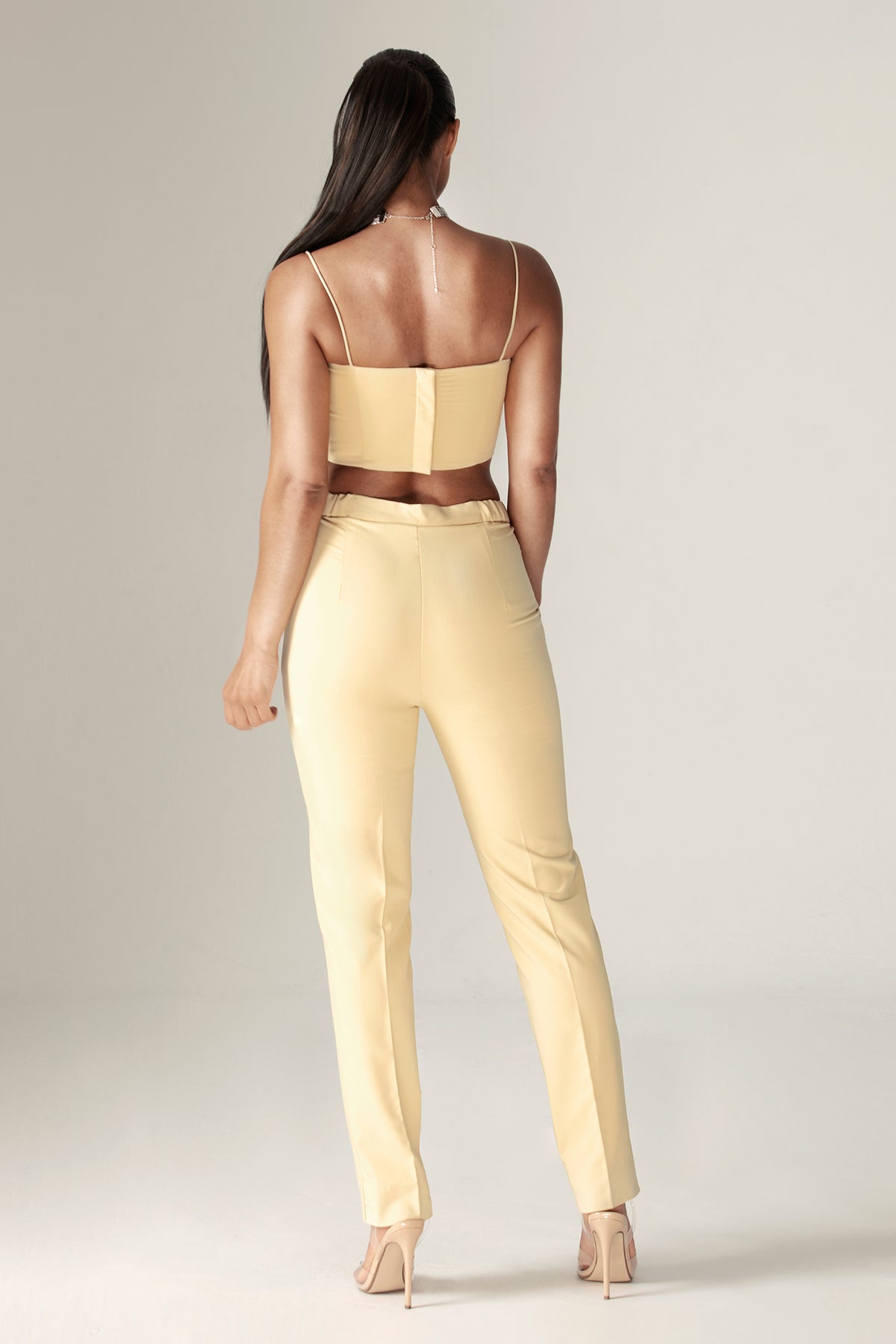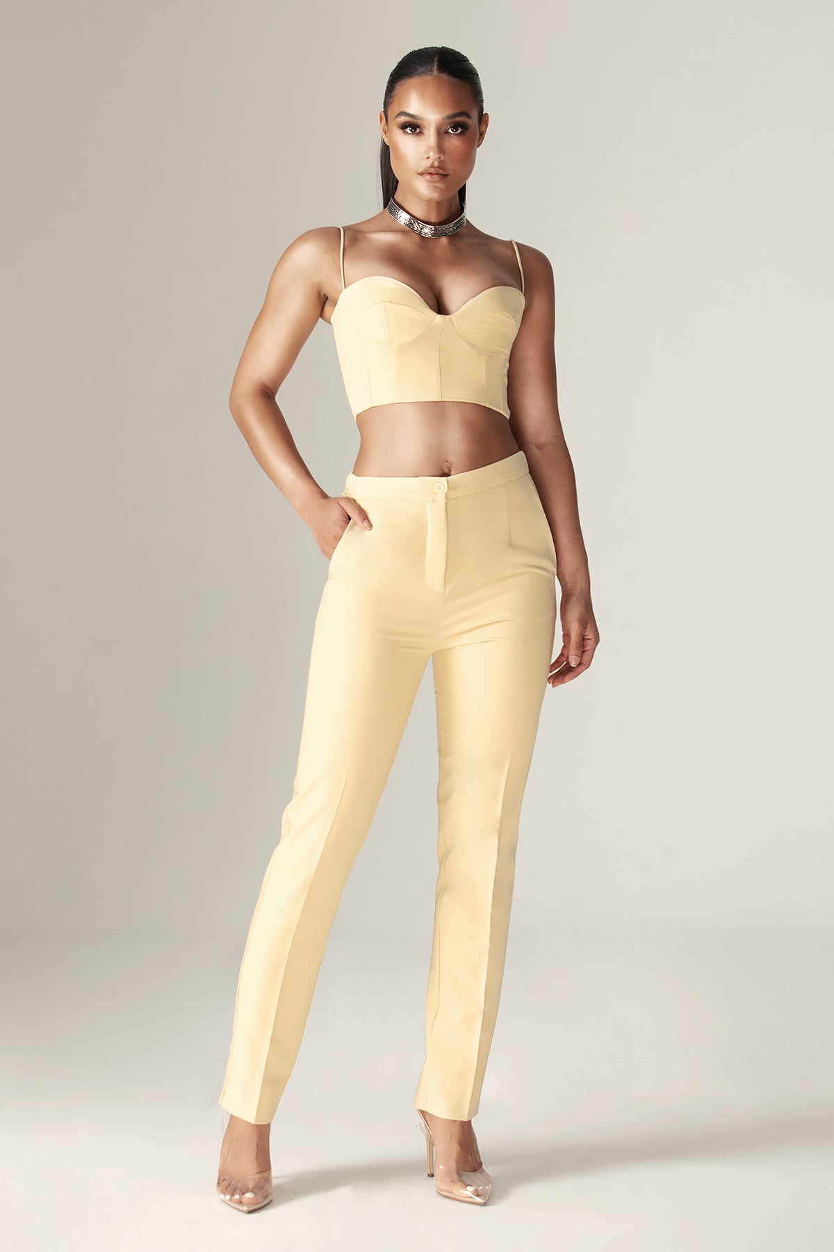 Our 'Carla' crop structure top is beautifully crafted from a crepe fabric in soft yellow tone to welcome in the warmer season. Inspired by traditional crop top, The boning provides corset-inspired structure and support that snatches the figure and we love the ruching across the bust to enhance the feminine feel in a 90's inspired straight neckline held by delicate spaghetti straps.We think the cropped length works well with a 'Niaz' high waisted wide legs pants.It has adjustable hooks and eyes to the back for easy on and is suitable for any bust size as it has under bra wire.