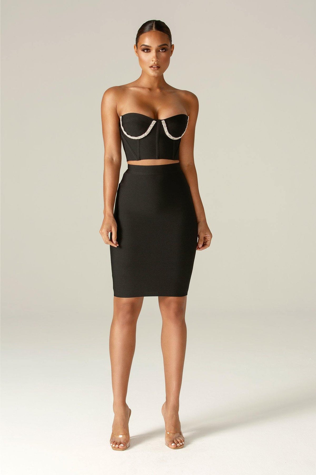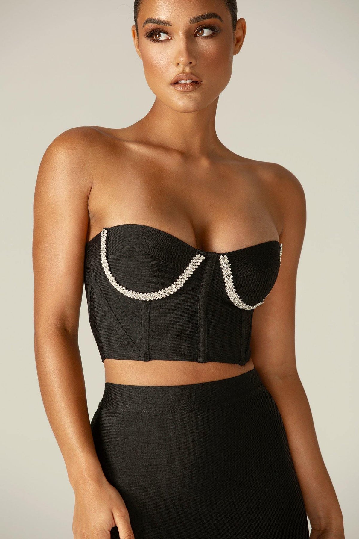 This strapless crystal bandage corset features beautiful feminine shape to the bust and a Rhinestone crystal effect gives more shine. Cut from a heavy quality luxury stretch bandage, ‘Celine’ point is the ultra luxurious and high quality crystal rope trim, that's all finished expertly by hand. It's boned through the front and back and features additional side boob boning and create a perfect cleavage. The strapless shape is ultra flattering and this suits big and small busts alike as it has underwired cups.