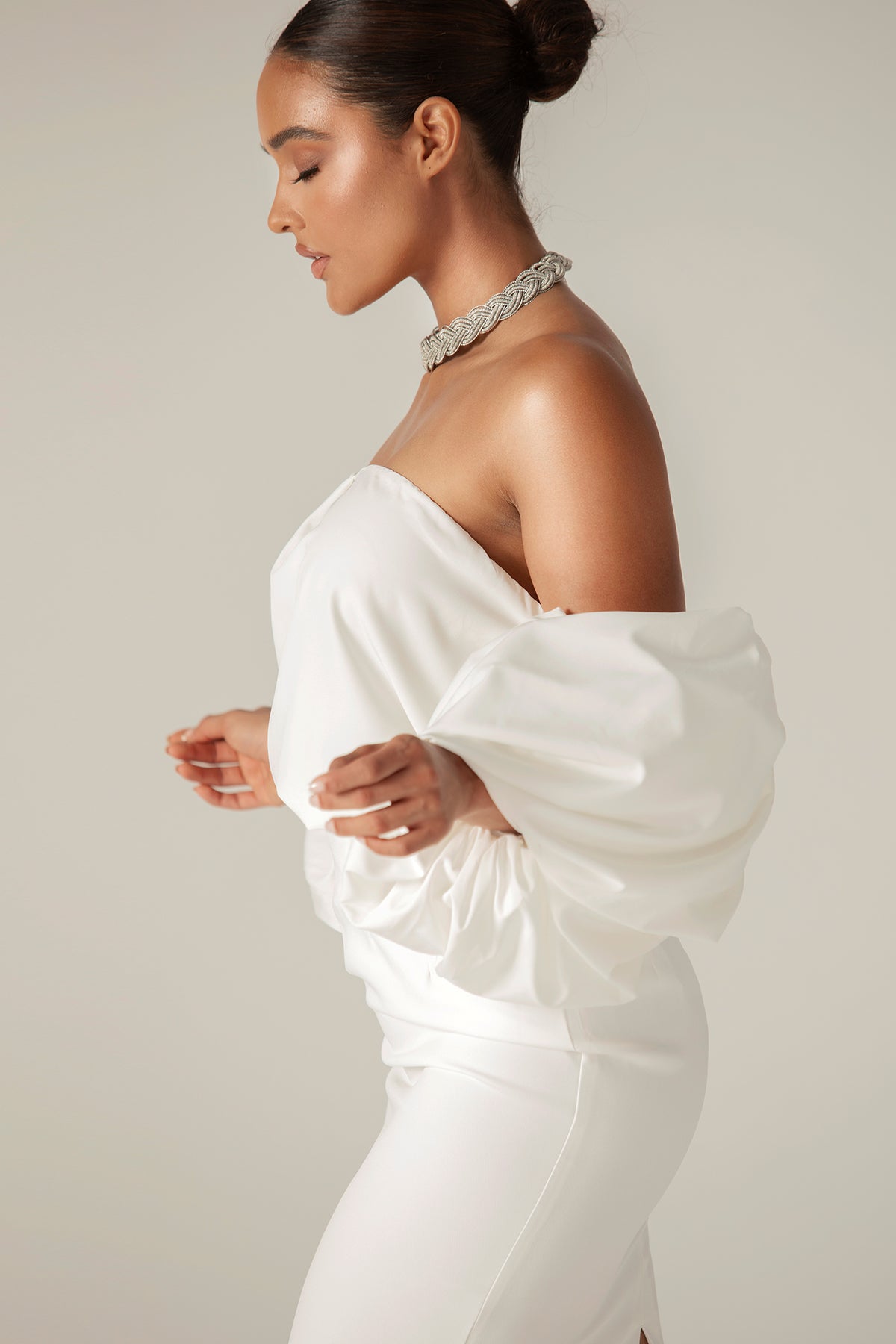 ’Damaris' is made in a pretty soft Crepe fabric, it has an off the shoulder cut that extends across the arm tops with a pretty voluminous sleeves and the long balloon sleeves add a little drama. 'Damaris' pulls on for easy on wear. Team yours with Shay Crepe Midi Skirt.