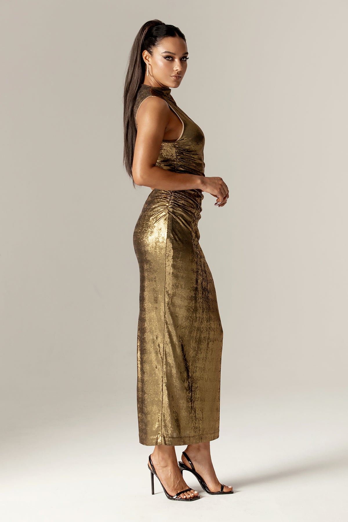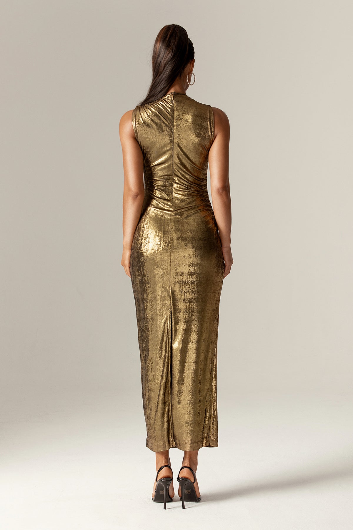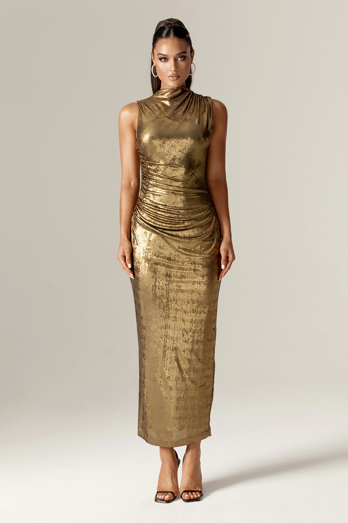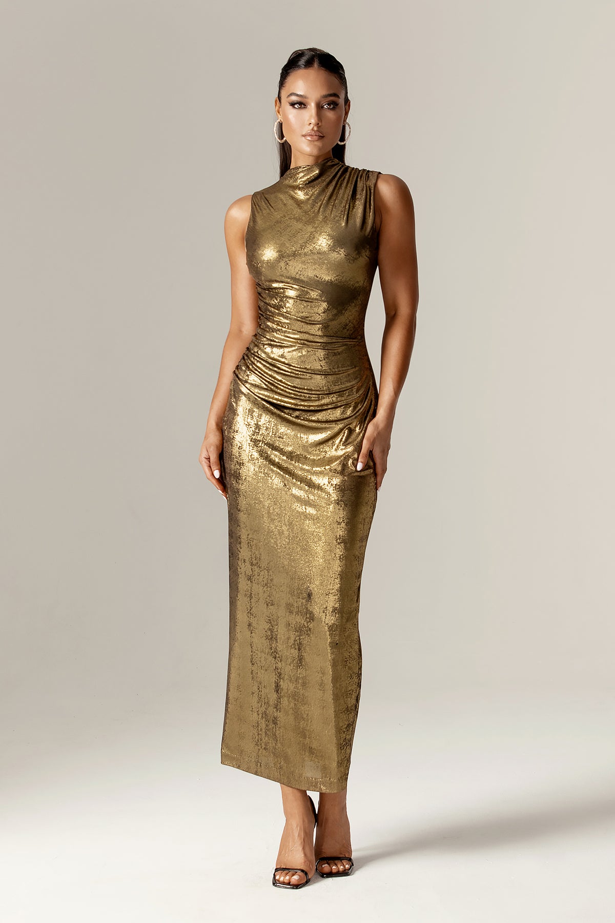 Doreena Metallic Ruched Maxi Dress (Gold)