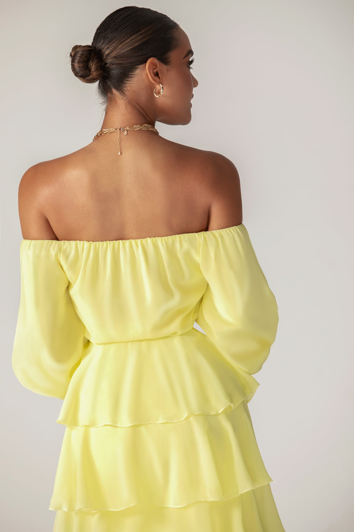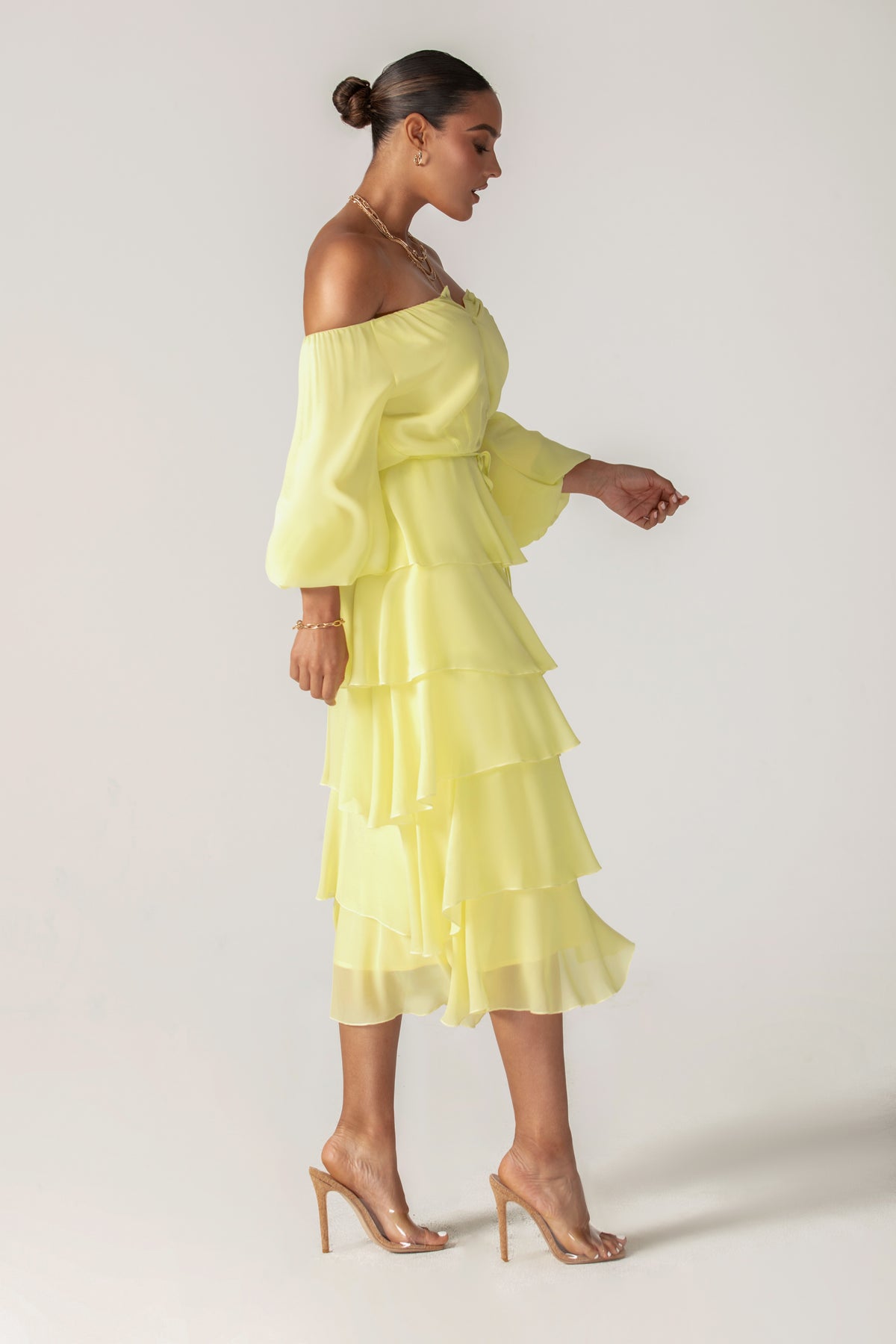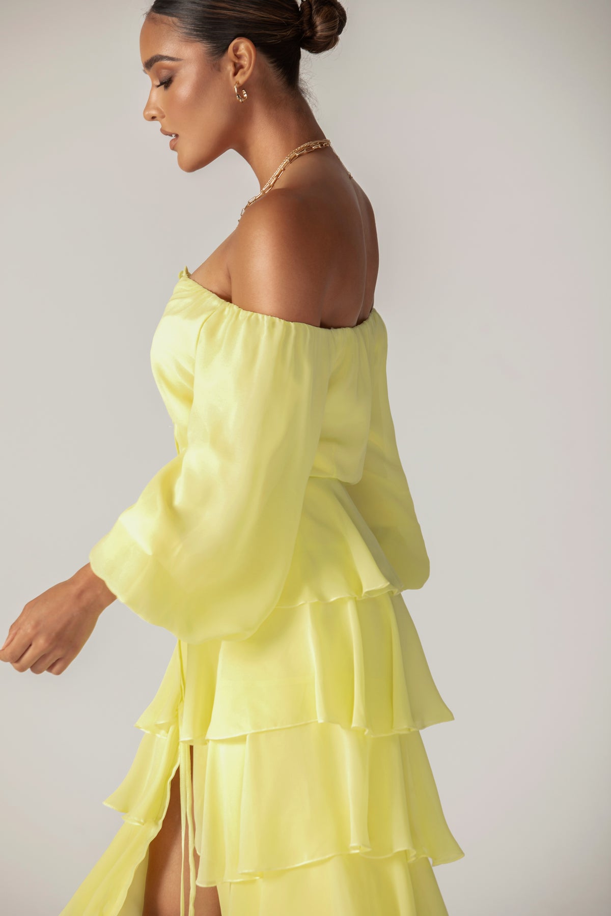 Dorra’s Crisp fresh look has us dreaming of those garden parties and summer trips. It's cut from our soft Chiffon Georgette for a fresh feel decorated with a pretty floral layers. The fabric has a dreamy lime yellow hue that's perfect for Summer outings. The skirt has special seams that curve over the hips to exaggerate your curves and it's fully lined as you'd expect from us.The pretty puff sleeves add to the fun and floaty vibe of 'Dorra ' and we love the way that the center thigh split shows just a flash of thigh as you walk. 'Dora ' is just perfect for girls who wanna be girls who wanna be sexy.