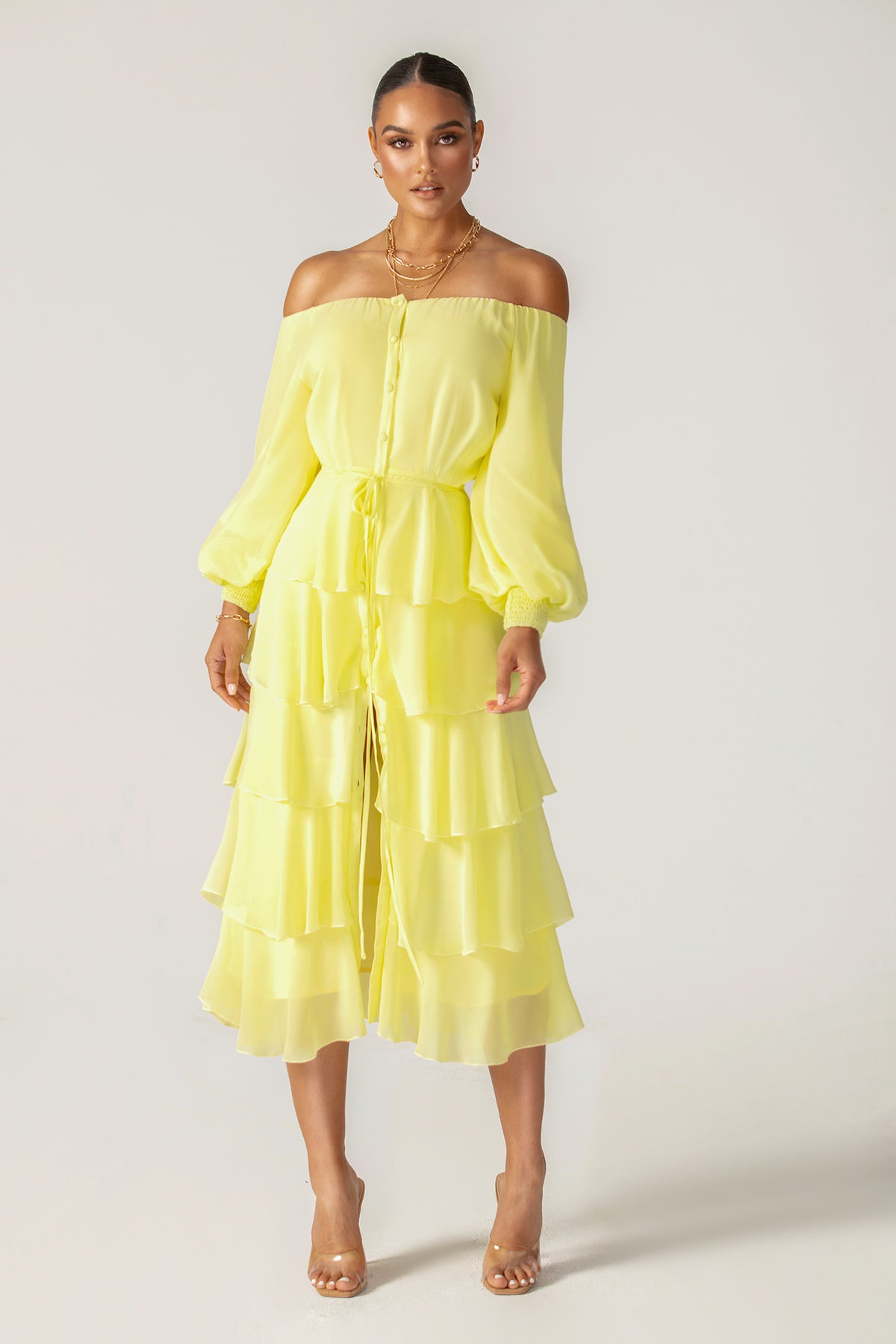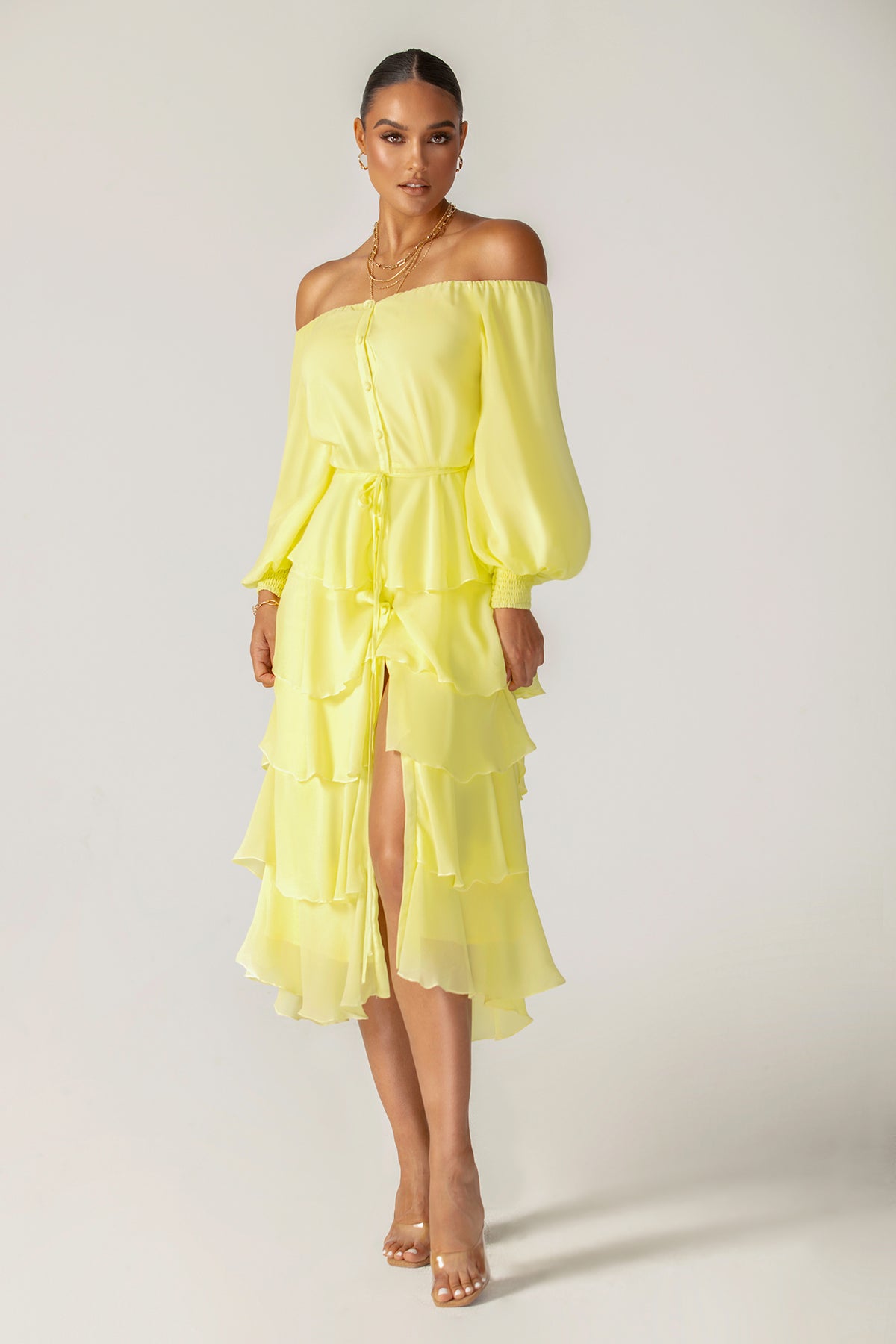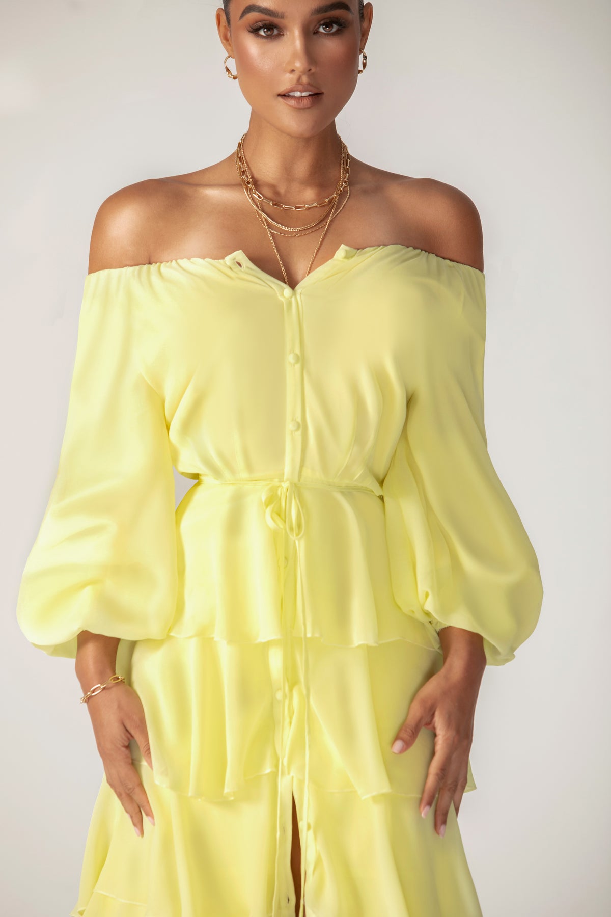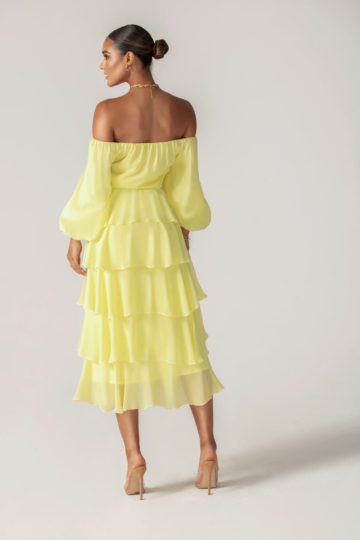 Dorra’s Crisp fresh look has us dreaming of those garden parties and summer trips. It's cut from our soft Chiffon Georgette for a fresh feel decorated with a pretty floral layers. The fabric has a dreamy lime yellow hue that's perfect for Summer outings. The skirt has special seams that curve over the hips to exaggerate your curves and it's fully lined as you'd expect from us.The pretty puff sleeves add to the fun and floaty vibe of 'Dorra ' and we love the way that the center thigh split shows just a flash of thigh as you walk. 'Dora ' is just perfect for girls who wanna be girls who wanna be sexy.