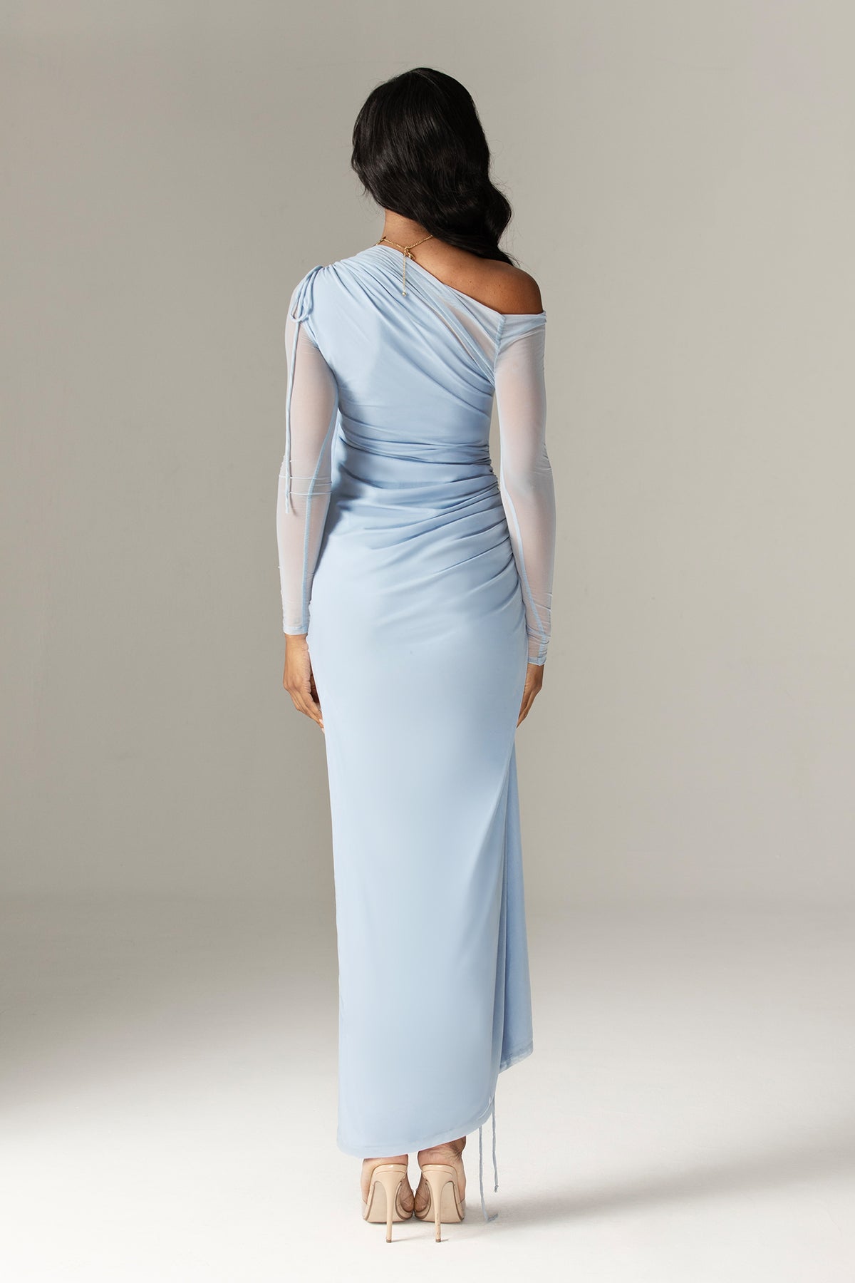 Dua Organza Ruched Mesh Long Sleeve Cut Out Maxi Dress (Soft Blue)