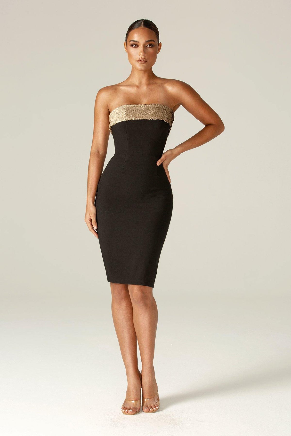 Eli black strapless corset dress:Cut from an ultra luxe crepe in a timeless black tone. 'Eli' is the perfect little back dress designed as a figure hugging fit with a gold sequins strapless neckline that is beautifully trimmed in delicately shiny sequins that extend from the front, sides and round to the back for a super feminine vibe. The internal structure features our special corsetry boning to the front, sides and right down to the waist to really cinch the waist and create the ultimate lift to sculpt and shape the bust, keeping your boobs sitting pretty and the bodice is lined in stretch soft material for a stay put effect. The above the knee length pencil cut finishes this delicate and stylish piece. Team with our new ‘Lily’ necklace to be more glamorous.