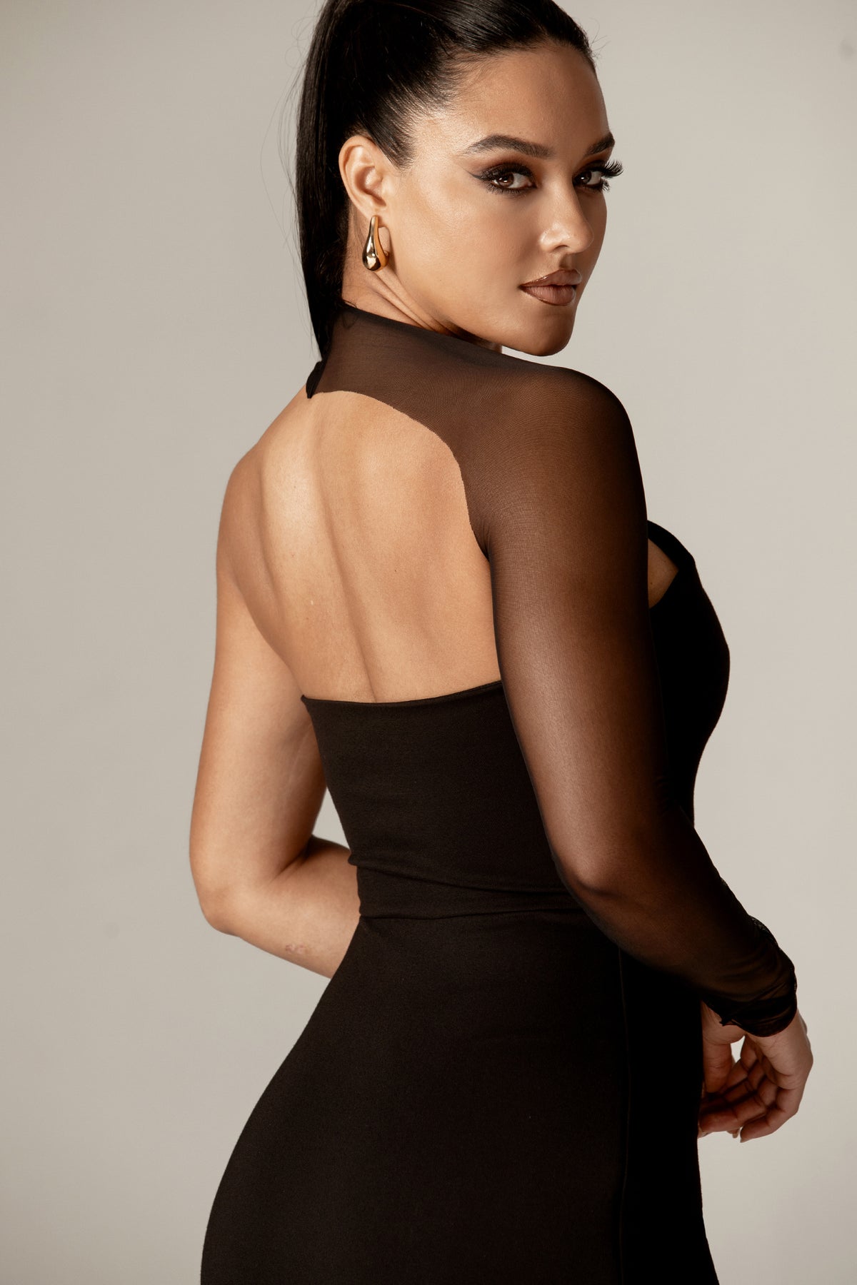 Feel your best in the 'Ester' a dress designed to turn heads. Crafted from premium Ponte de Roma Italian fabric, this figure-hugging silhouette offers both structure and stretch, ensuring a flawless fit. The striking one-shoulder design, paired with a delicate soft mesh sleeve, adds the perfect touch of mystery and sophistication.