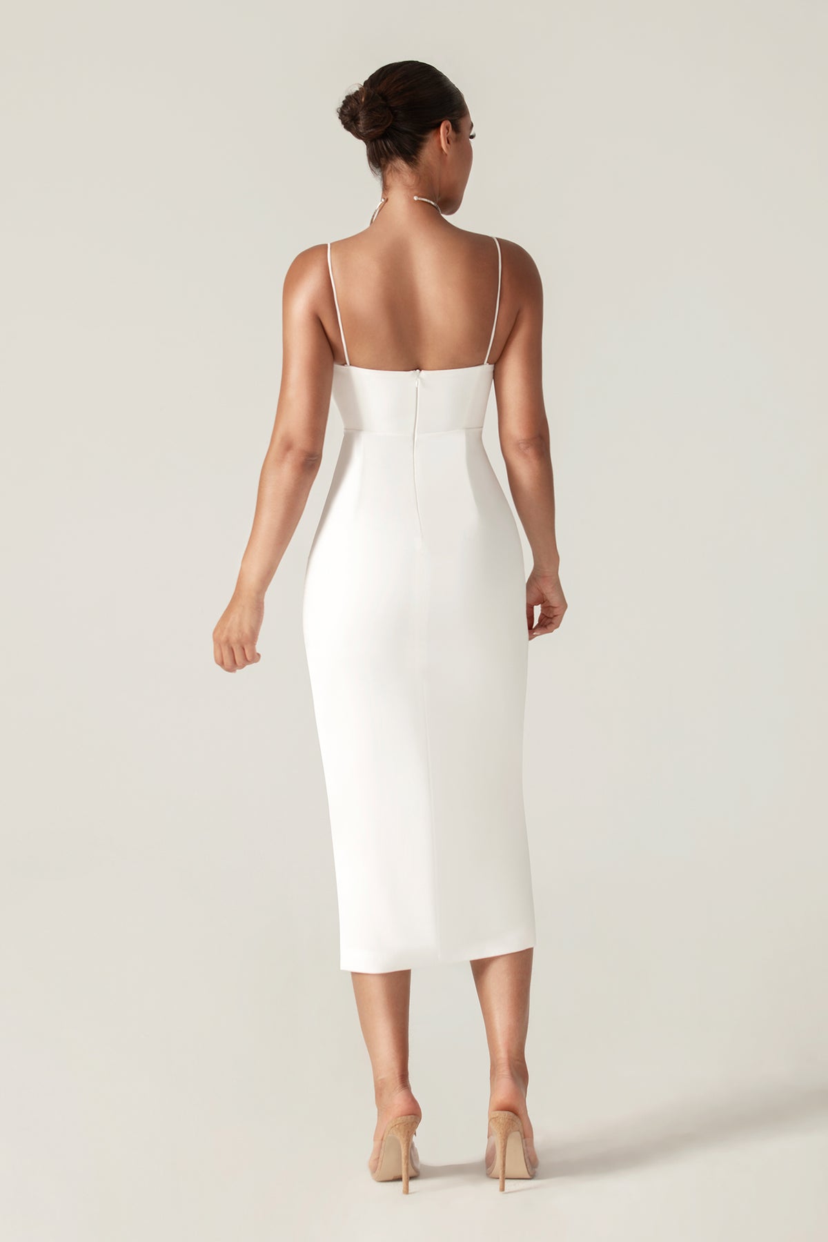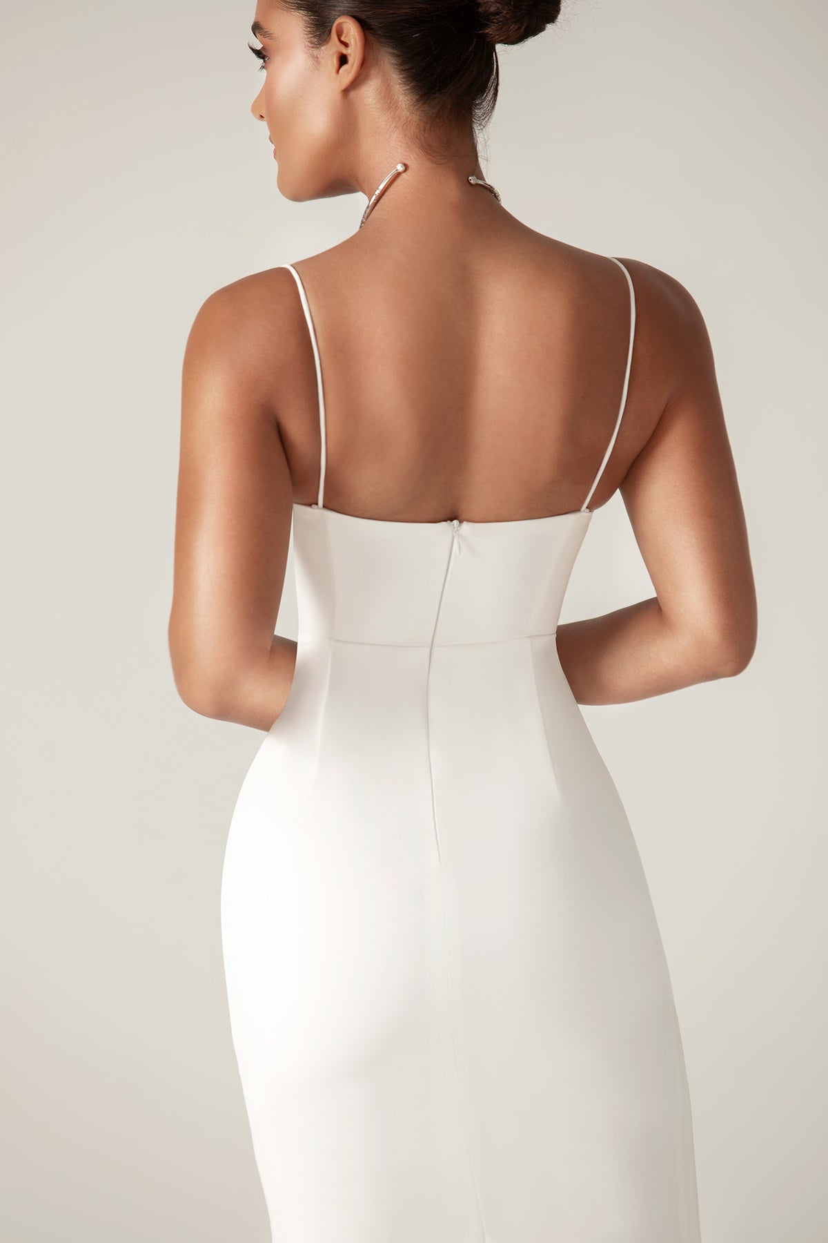 This beautiful ‘Joy’ dress puts the focus firmly on elegant shape to craft an exquisite silhouette. The neckline, straps create this simple yet show stopping dress that's all underpinned with expert corsetry to the lining layer. It has a boning structure for incredible figure cinching and shaping down to the waist before falling to a flattering high rise slim fitting tailored skirt with front slit, It has a zip up the back for easy on. It is fully lined for a smooth and seam free finish. The boning detailing extends down to the waist in a pretty shape and through the back to really exaggerate the curves.