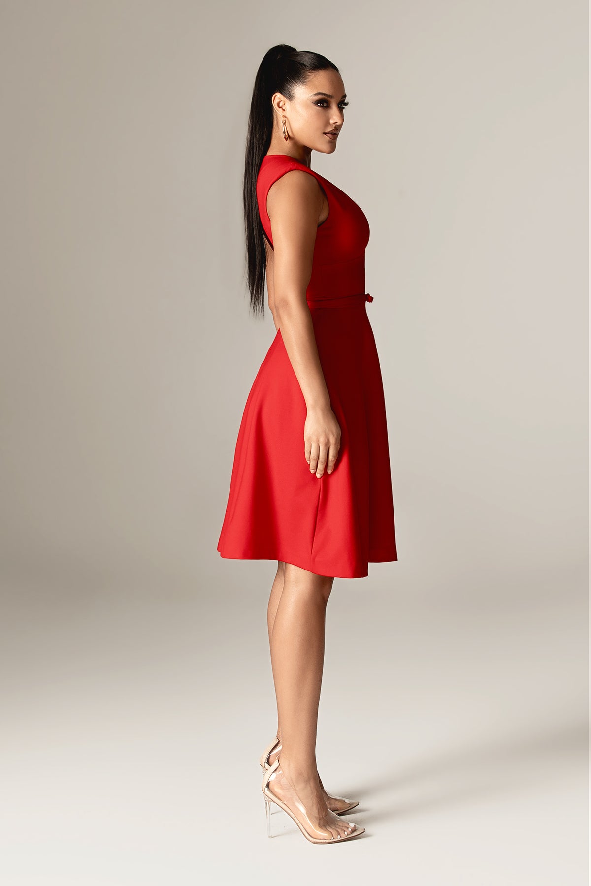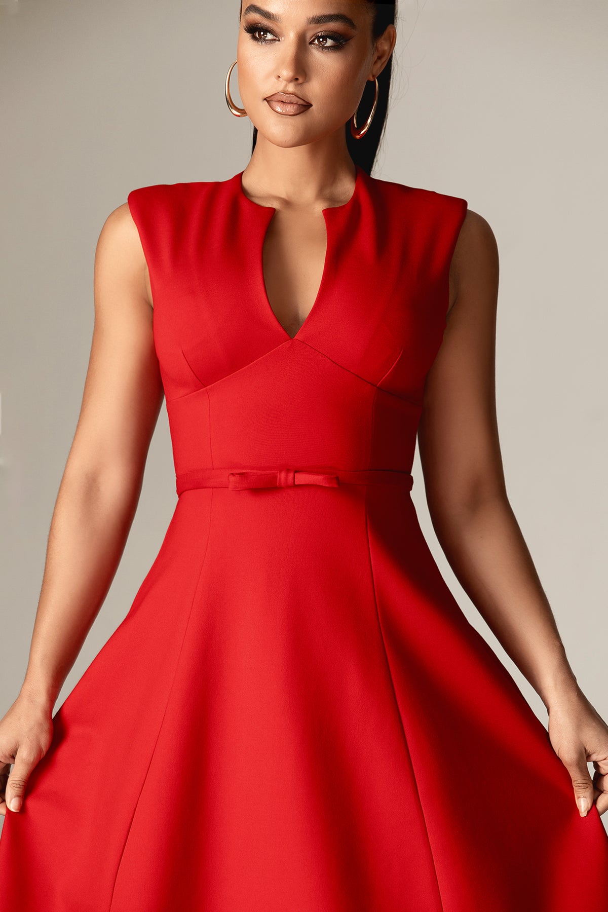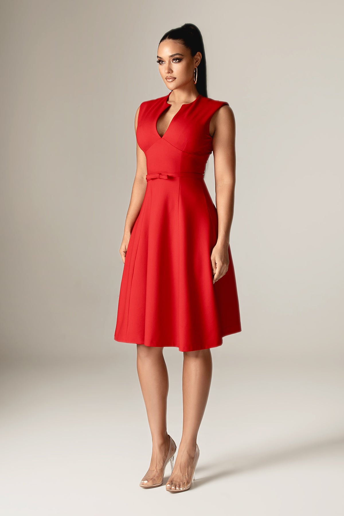 The Leslie Dress lets you look amazing and feel completely comfy, no compromises needed. Crafted from vibrant red Ponte di Roma fabric, it strikes the perfect balance of structure and stretch, hugging your curves in all the right places while ensuring all-day ease. The fit-and-flare silhouette, combined with a deep V-neckline, creates an effortlessly chic look. An adjustable, detachable belt allows you to customize your look, wear it for a polished touch or remove it for a sleek, minimalist vibe.