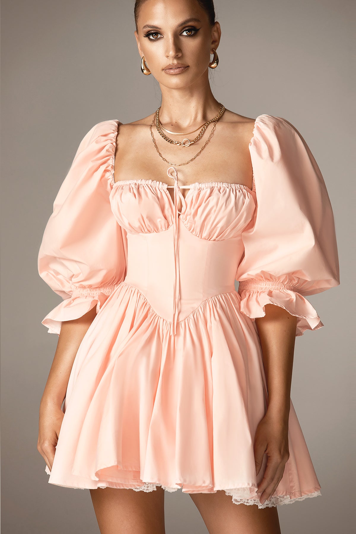 The 'Marcia' Cotton-Rich Mini Dress is a romantic and elegant piece crafted from a luxurious cotton-rich blend. It features a fitted bodice with waist-cinching corsetry for a flattering silhouette, adjustable straps for a personalized fit, and a softly pleated mini skirt with tulle layers for added volume and graceful movement. A discreet zipper closure at the back ensures easy dressing, while the dress is fully lined for comfort and a smooth feel against the skin. It's designed to embody sophistication and charm, perfect for both day and evening wear.