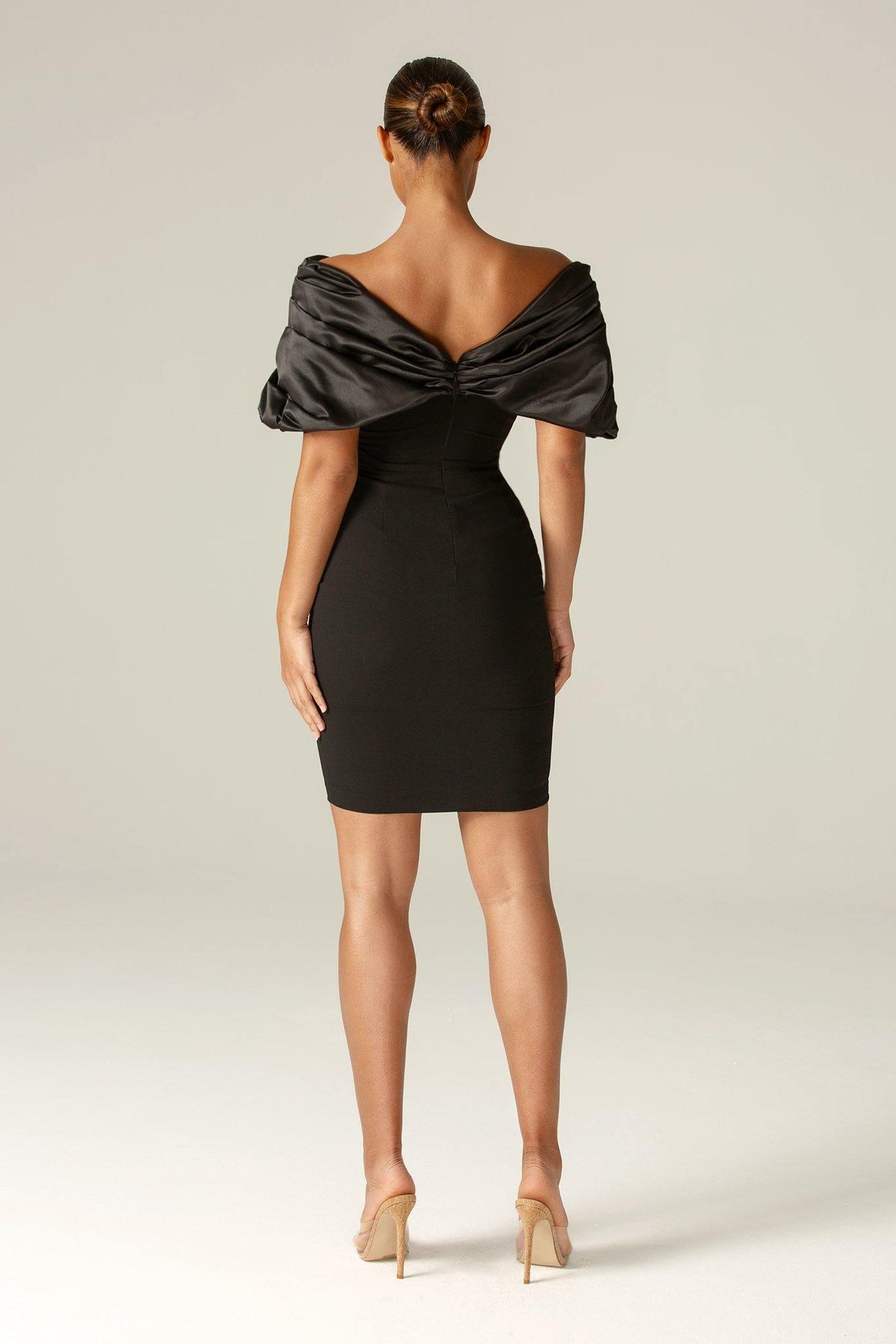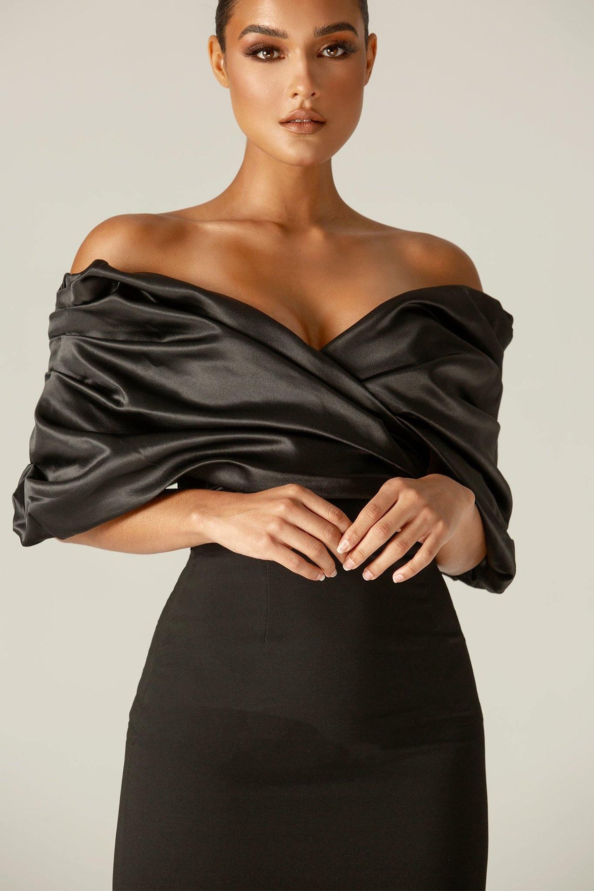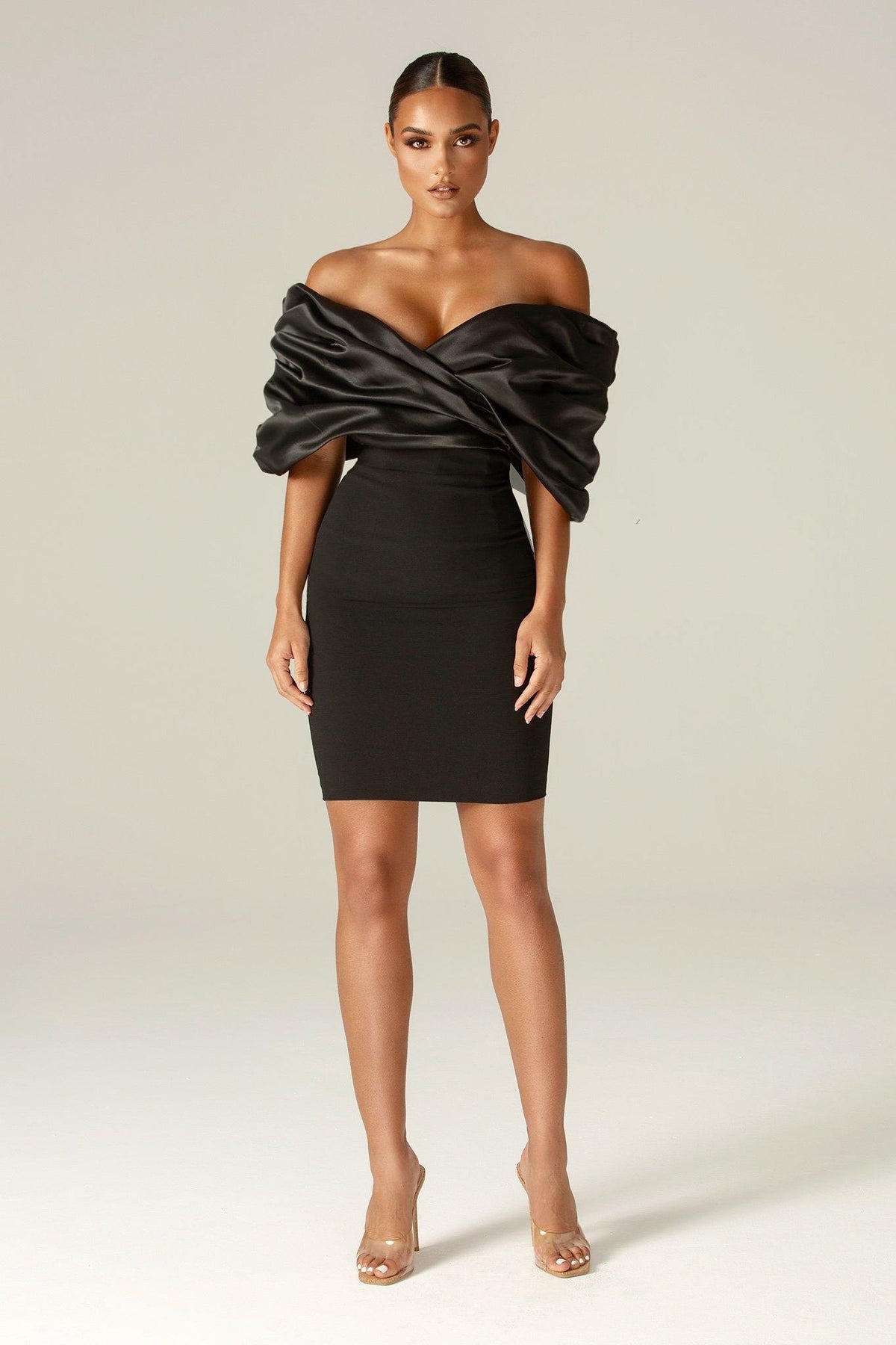 It's cut from a luxurious soft heavyweight crepe that really sculpts and shapes your figure to cinch your waist and create the perfect figure hugging silhouette. The oversized satin ruffles to the shoulders add drama yet it sits perfectly in an off shoulder cut. The boning detailing extends down to the waist in a pretty shape and through the back and sides to really exaggerate the curves and underwired cups design means you don't need a bra.Team with our new ‘Lily’ necklace to be more glamorous.