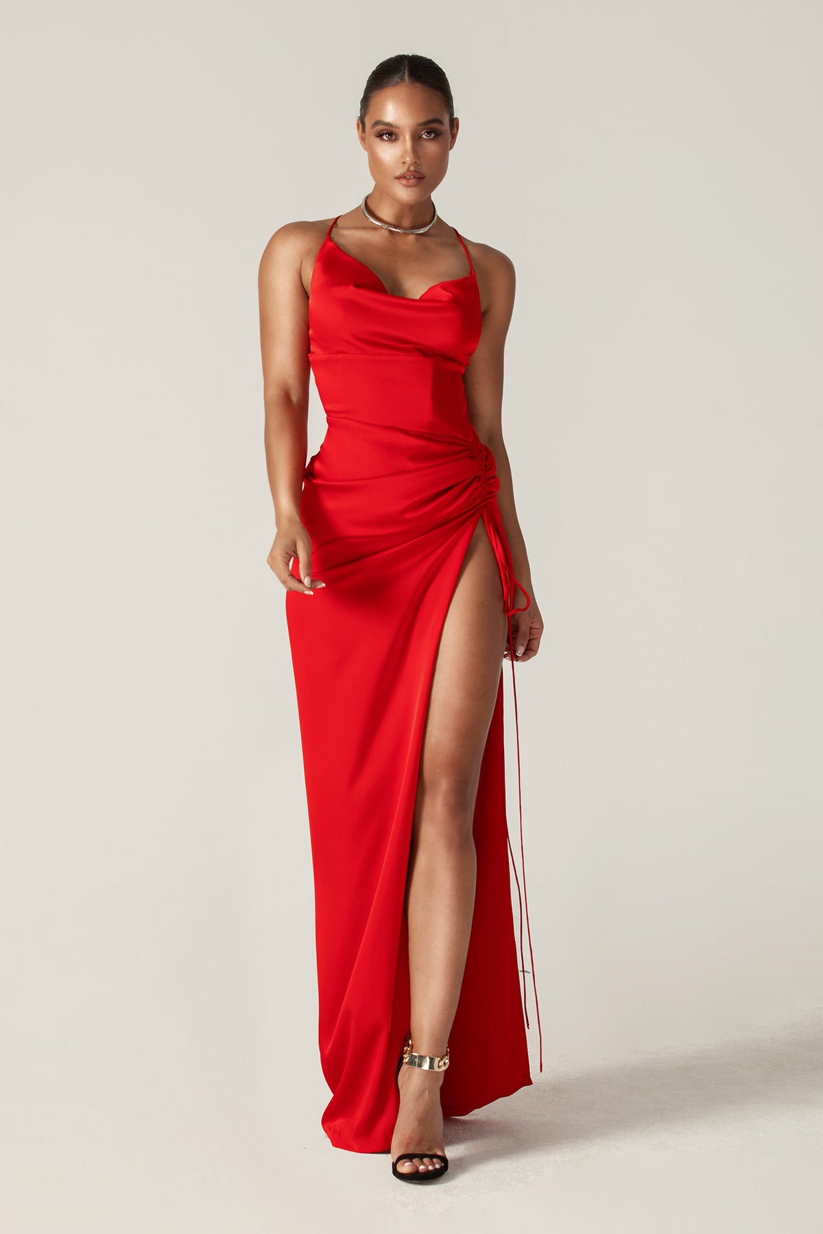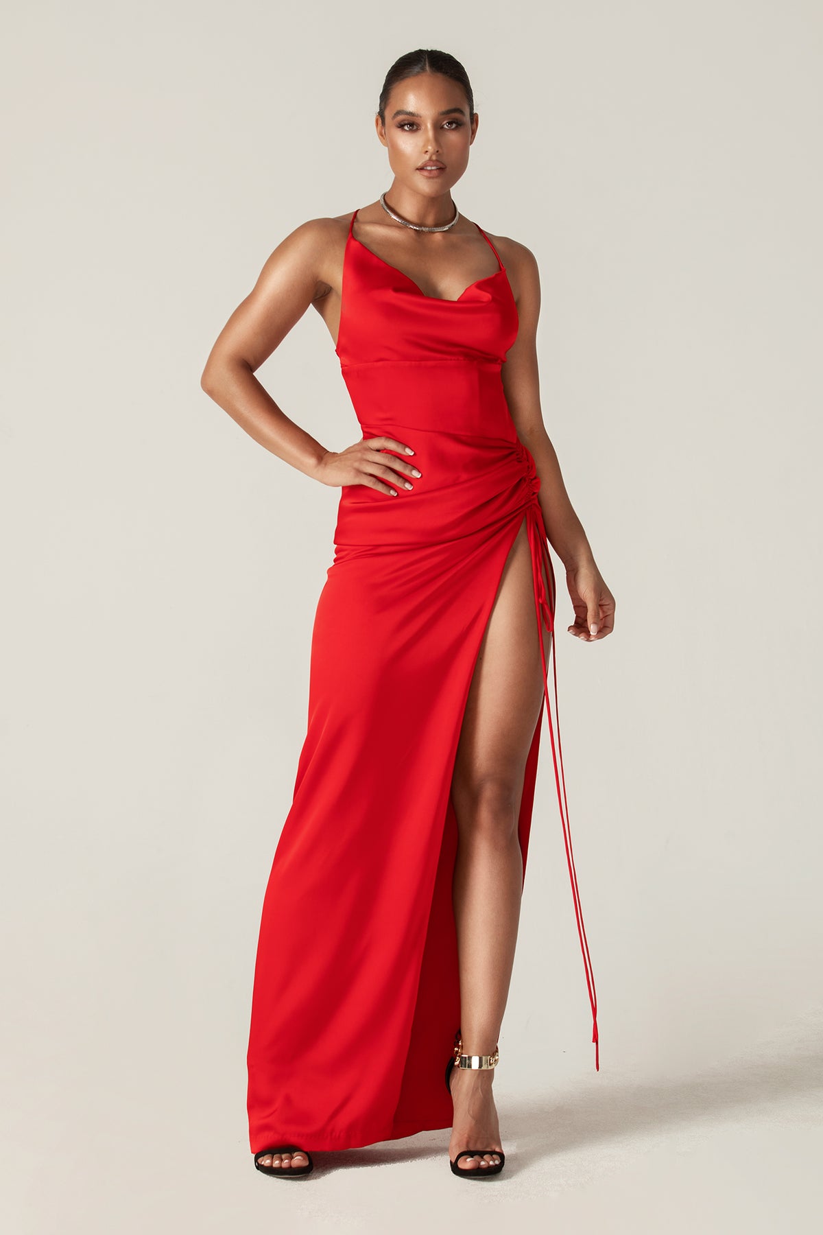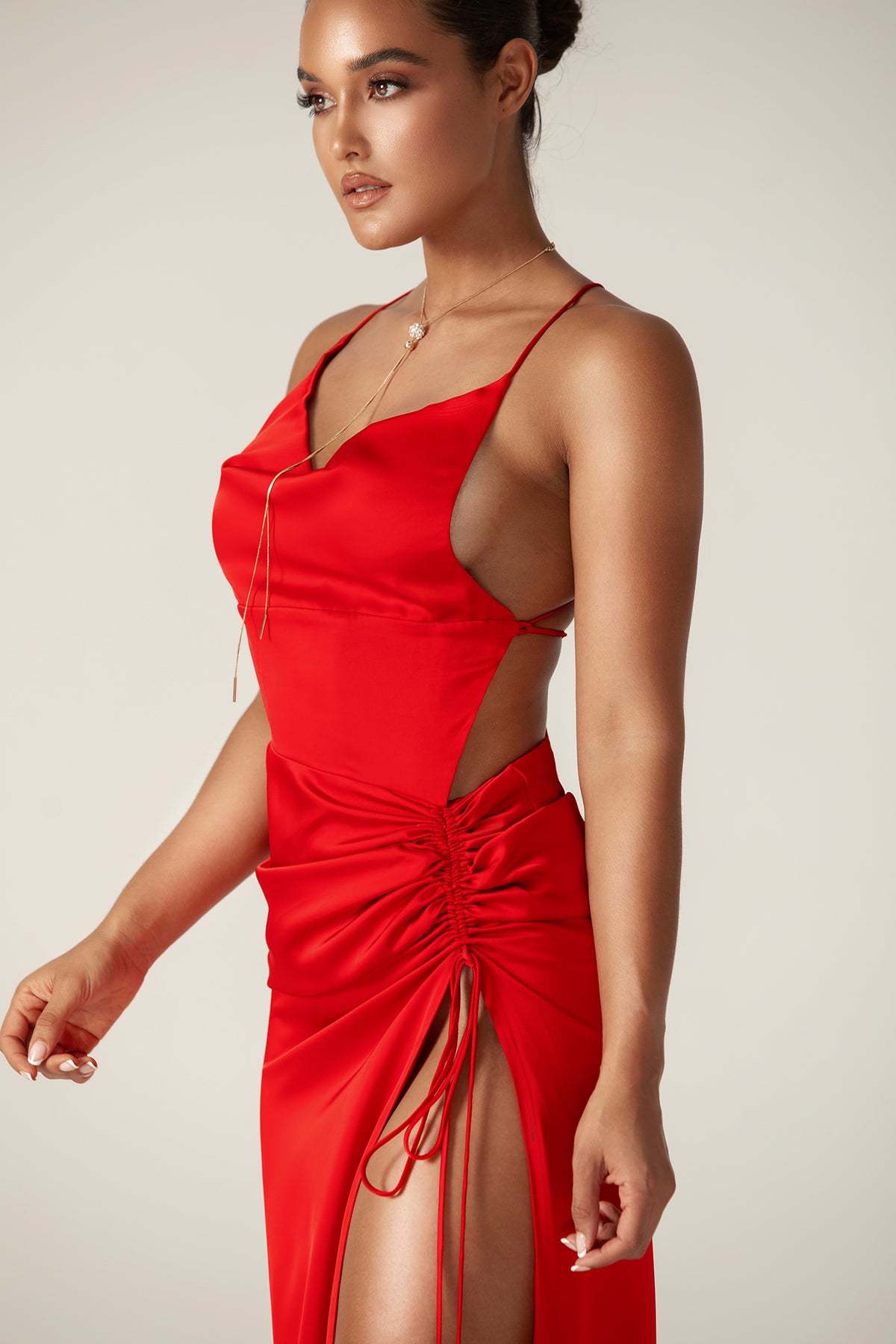 Reva Cowl Neckline Sheath Backless Maxi Dress (Red)