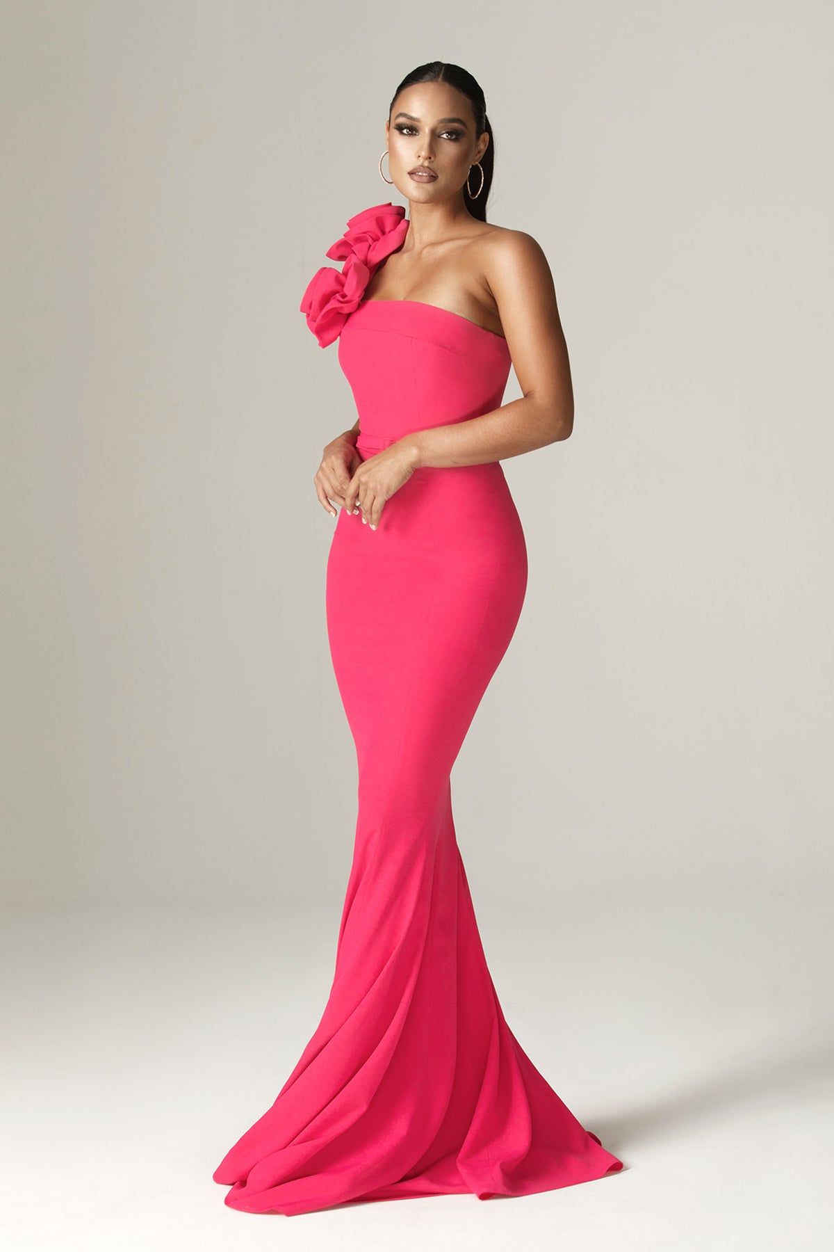 Our ultra glamorous 'Rona' dress is destined for the party season. Coated with 3d flowers on the shoulder and designed for a figure skimming silhouette, 'Rona' features a fully corseted bodice to cinch the waist.