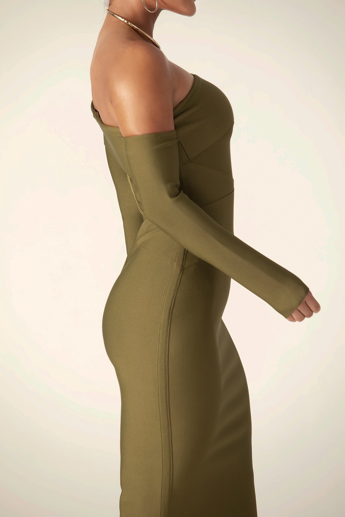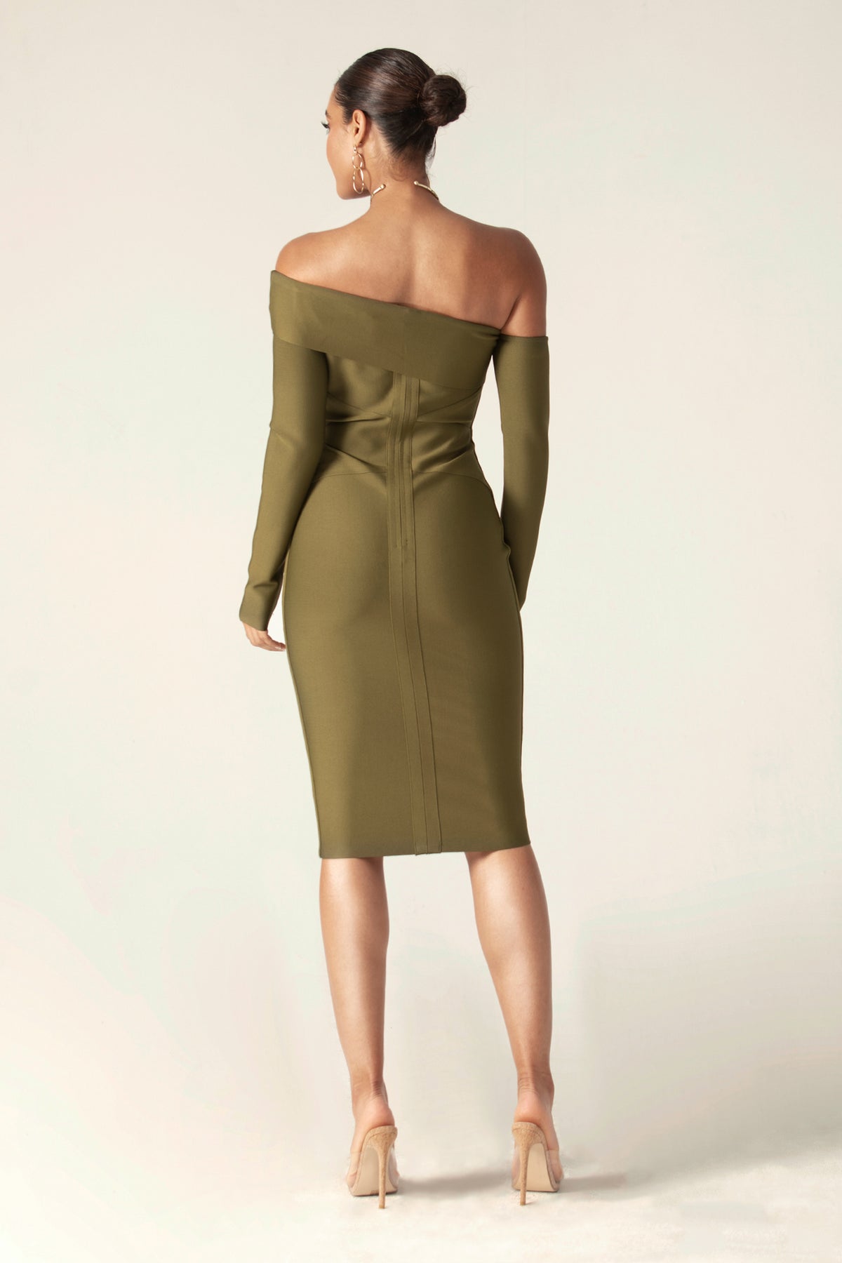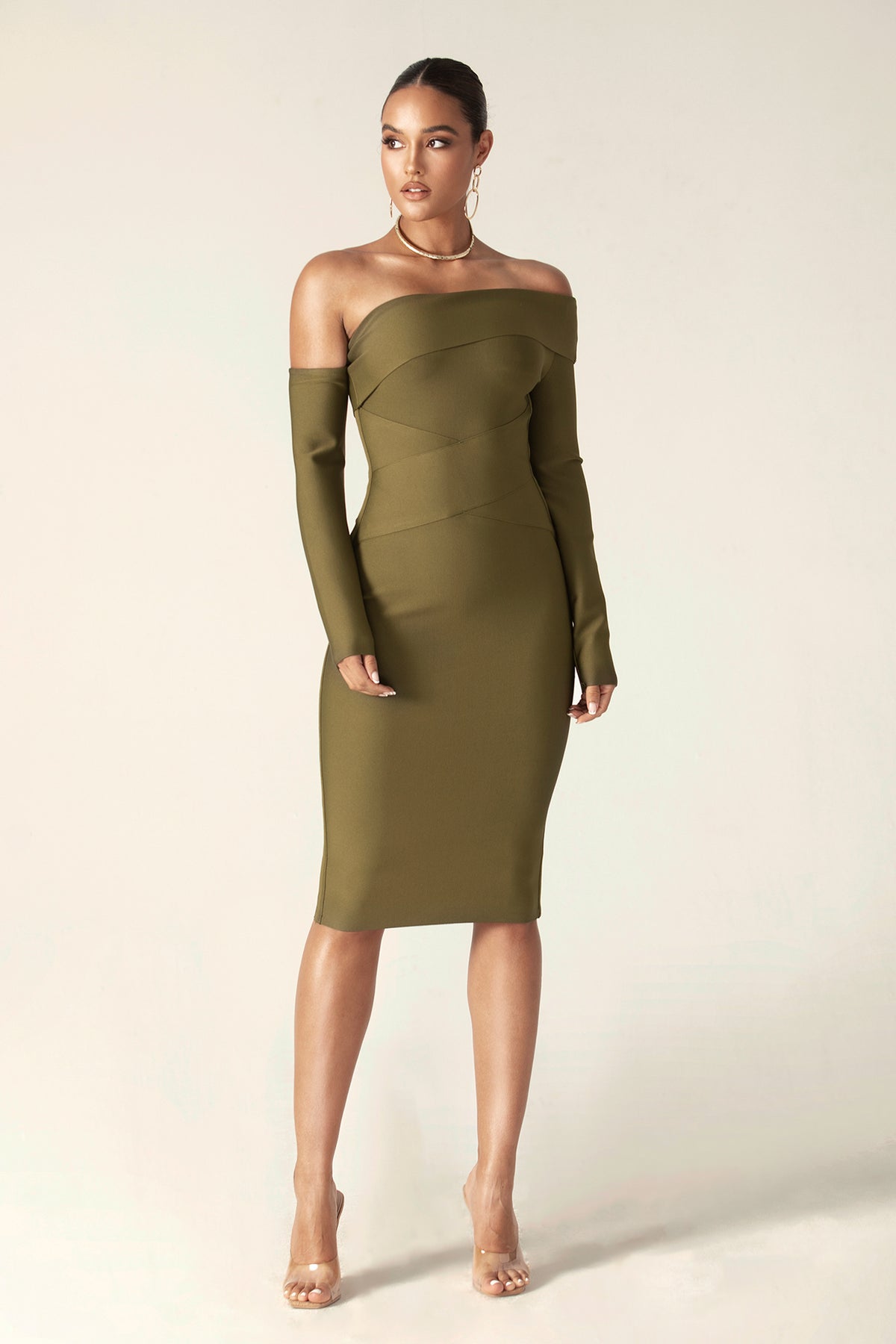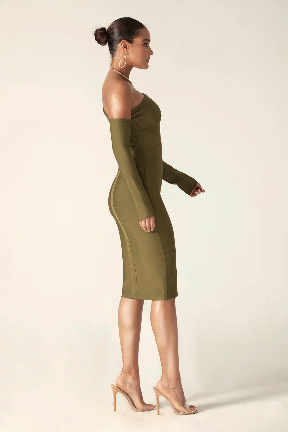 Shiva Off-Shoulder Bandage Midi Dress (Olive Green)