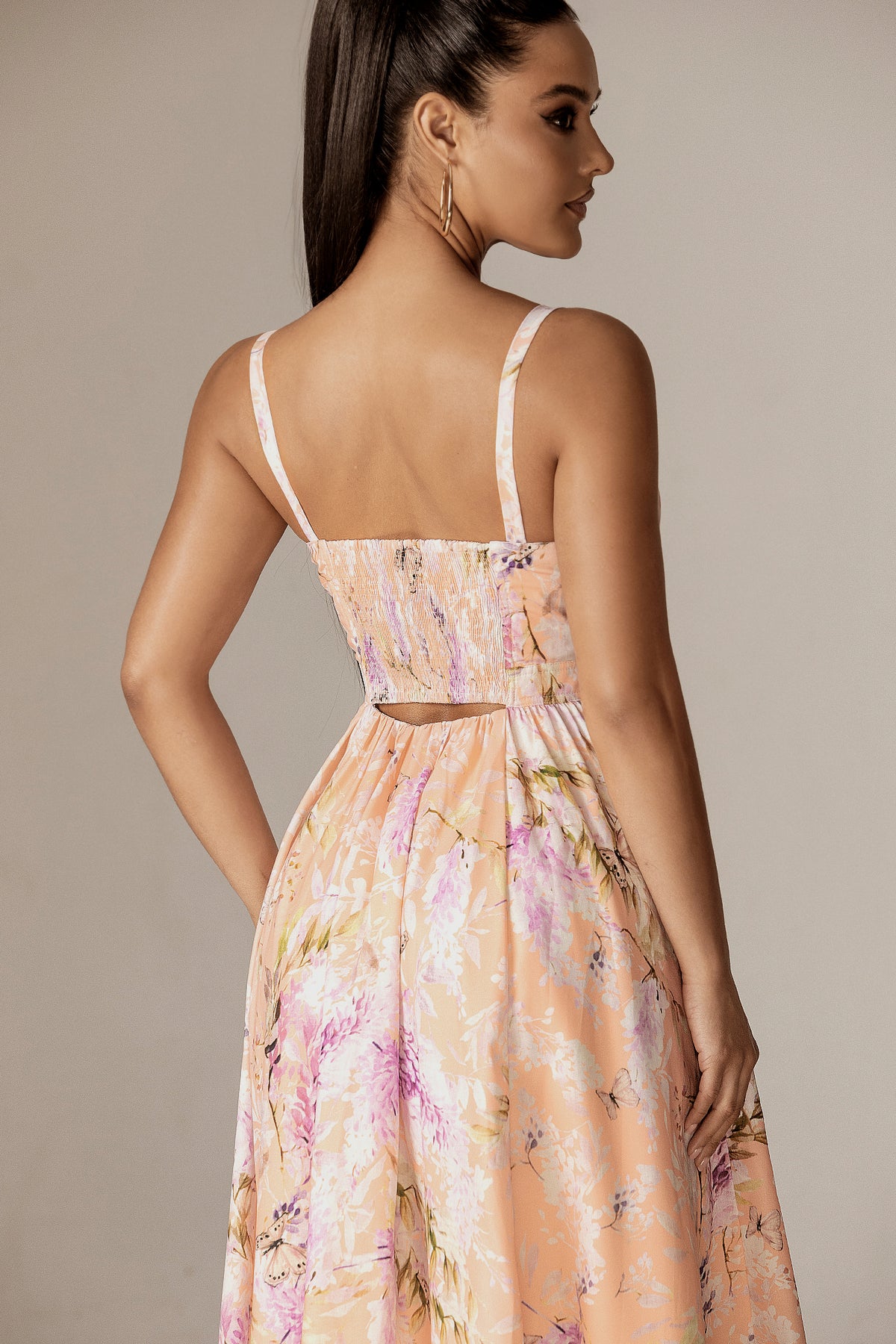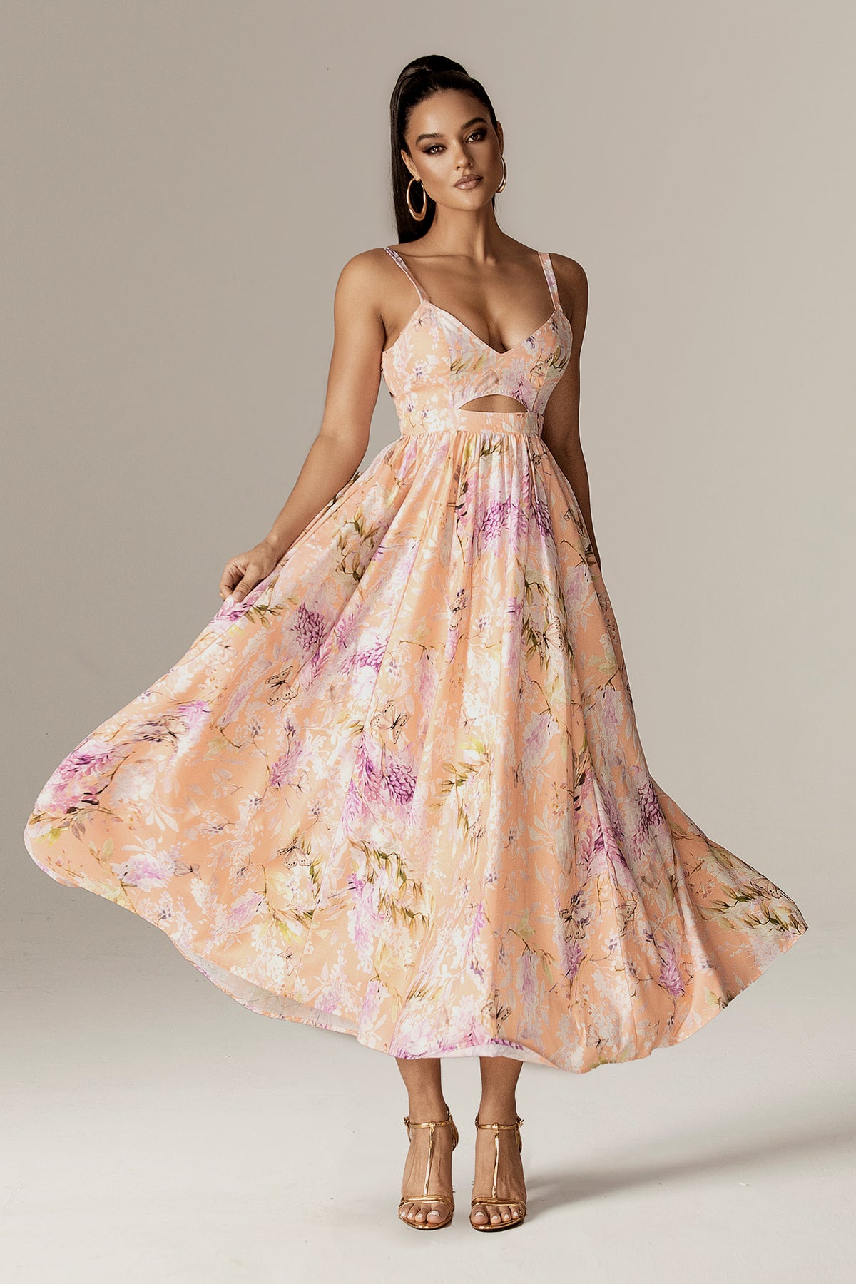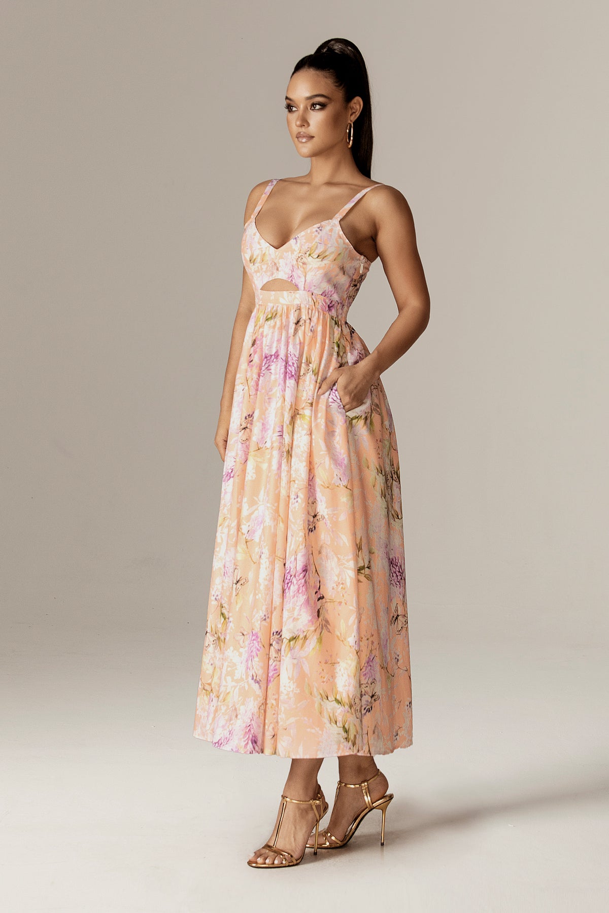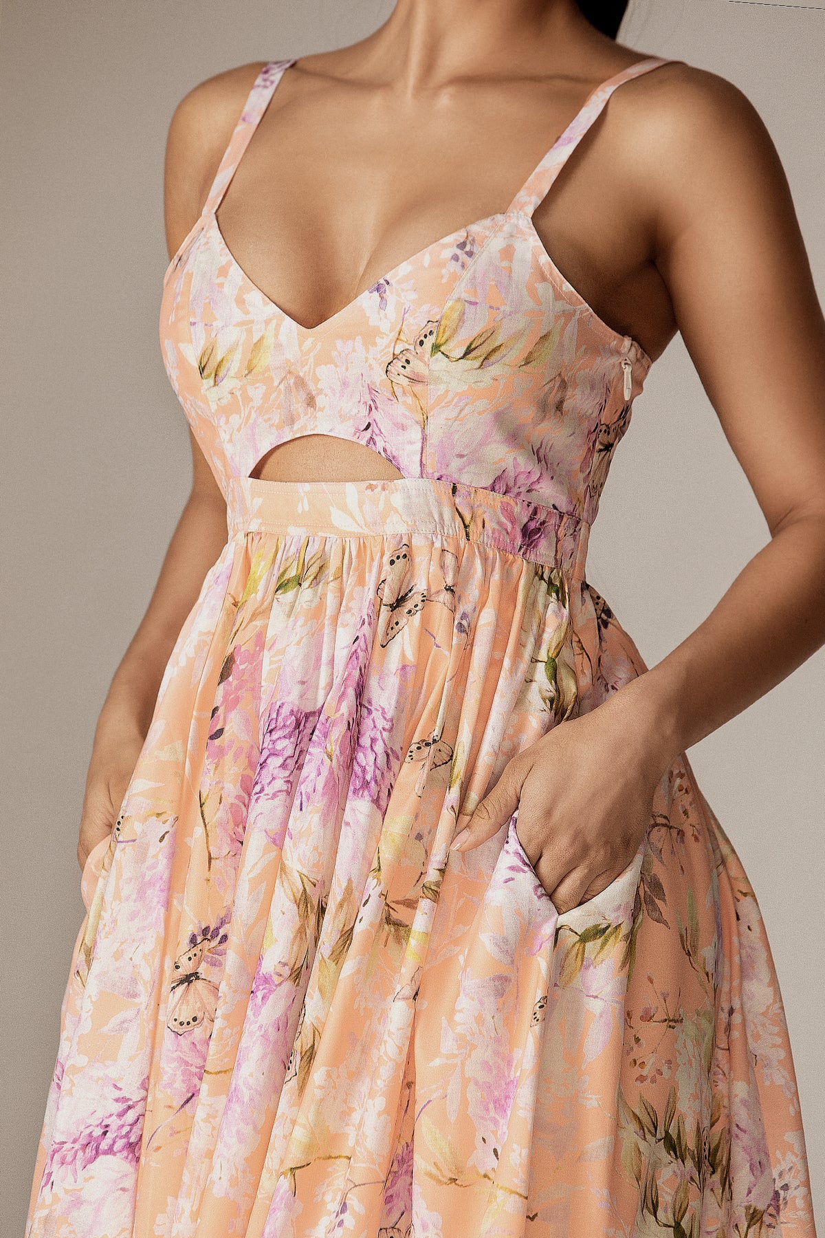 Every step in this dress feels like a soft breeze on a warm summer night. Soft, dreamy, and unapologetically feminine, the Sione Cut-Out Maxi Dress captures the glow of a golden sunset wrapped in florals. Designed in a delicate peach tone kissed with lavender and cream florals, this dress is made for moments that linger long after the sun sets.