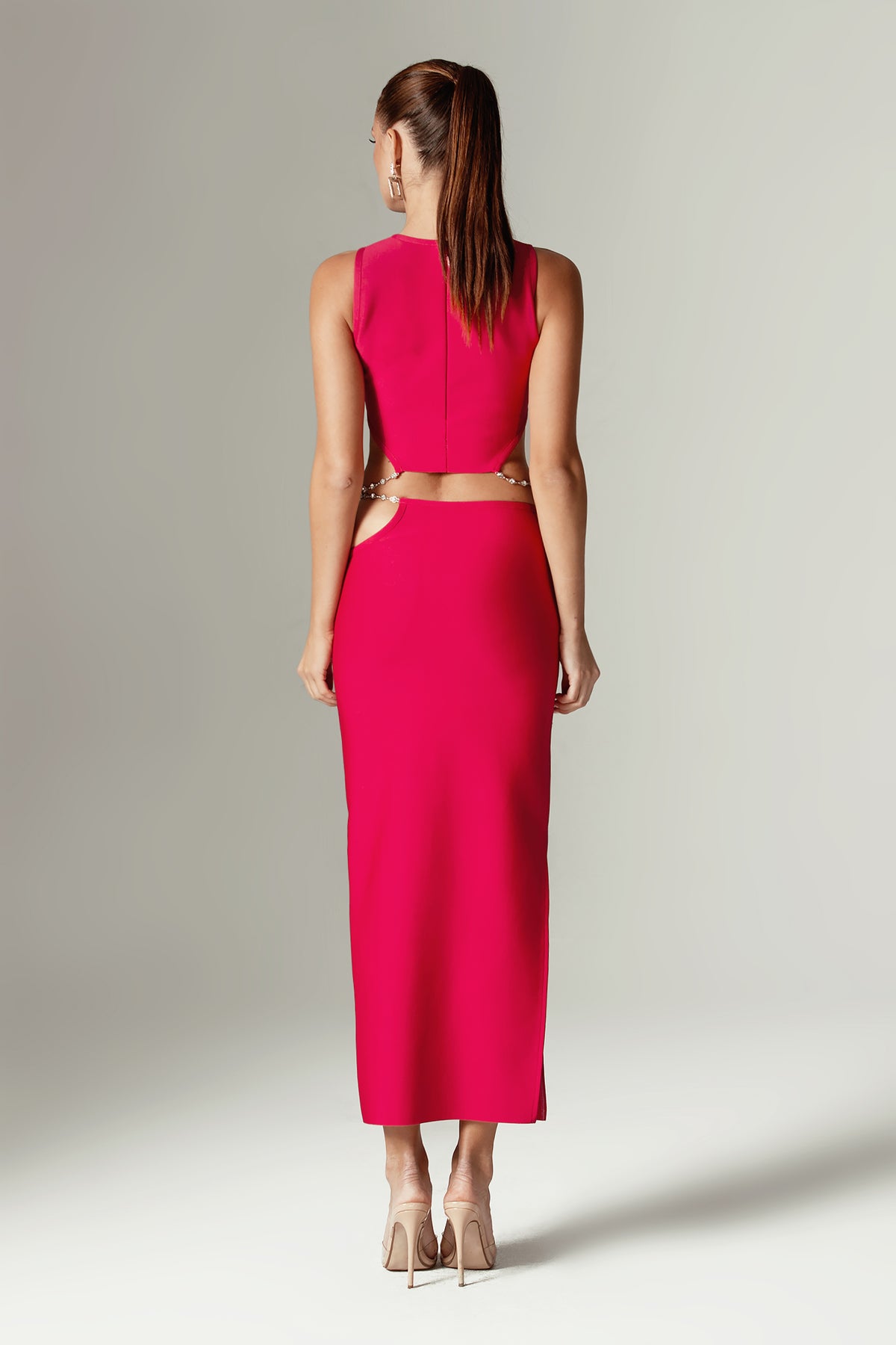 Our 'Star' skirt looks so chic paired with our 'Stella' top.It's luxuriously soft bandage in a slim, that hugs your curves in a classic and ultra flattering pencil silhouette, 'Star' has a comfortable flexible waistband that sits low on the natural waist and it has side zipper for easy wear and designed with an open curved side with dangling rhinestone chains for a daring flash of skin.Wear yours with our Stella Top for a coordinated look.